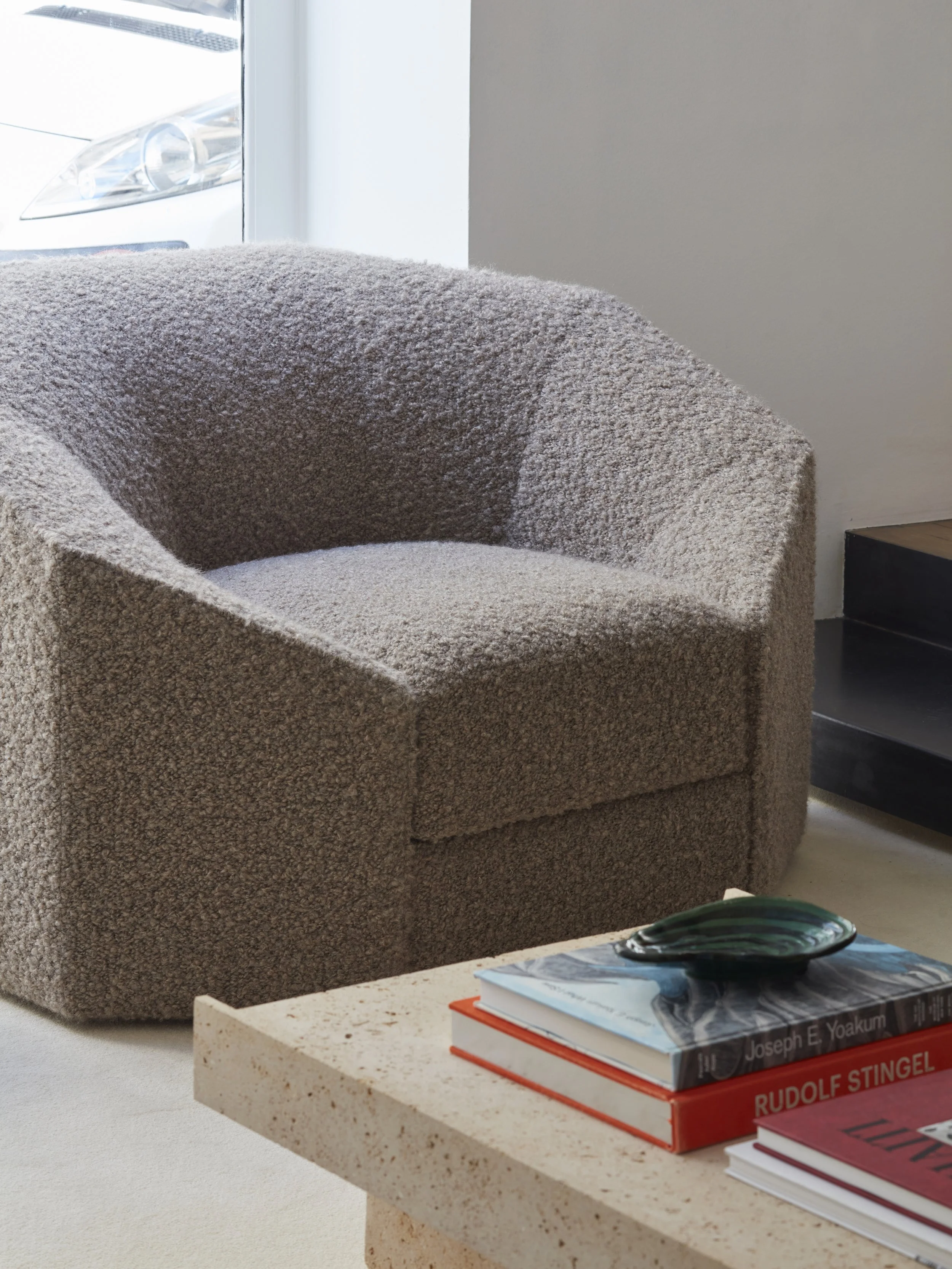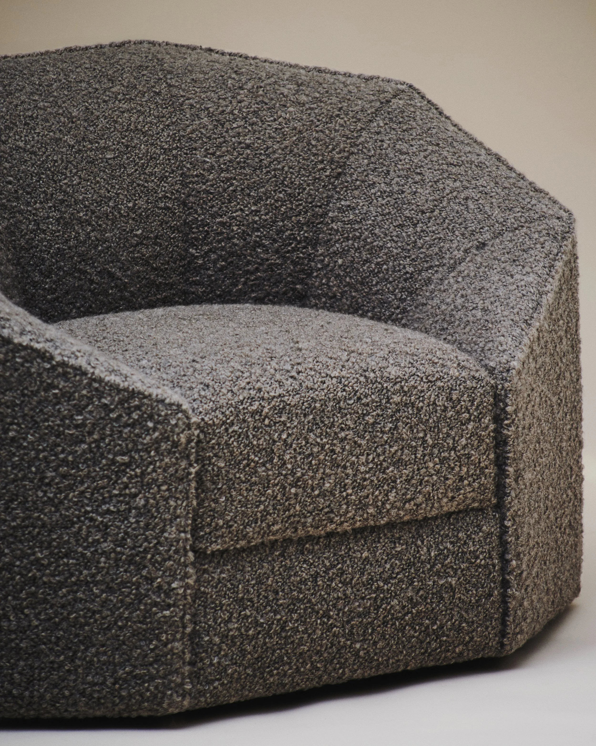 Inspired by the modernist furniture of the interwar period, particularly the work of Pierre Chareau and, more recently, Bernard Govin, OTTO revisited the notion of comfort with precision and sensuality. Its chamfered edges and architectural silhouette framed a generous, softly contoured seat. Designed as a central element of the home, OTTO combined warmth and structure — inviting both conversation and rest. The sofa was presented in a linen-upholstered 2/3-seat version, while the armchair appeared in mohair velvet and wool bouclette.