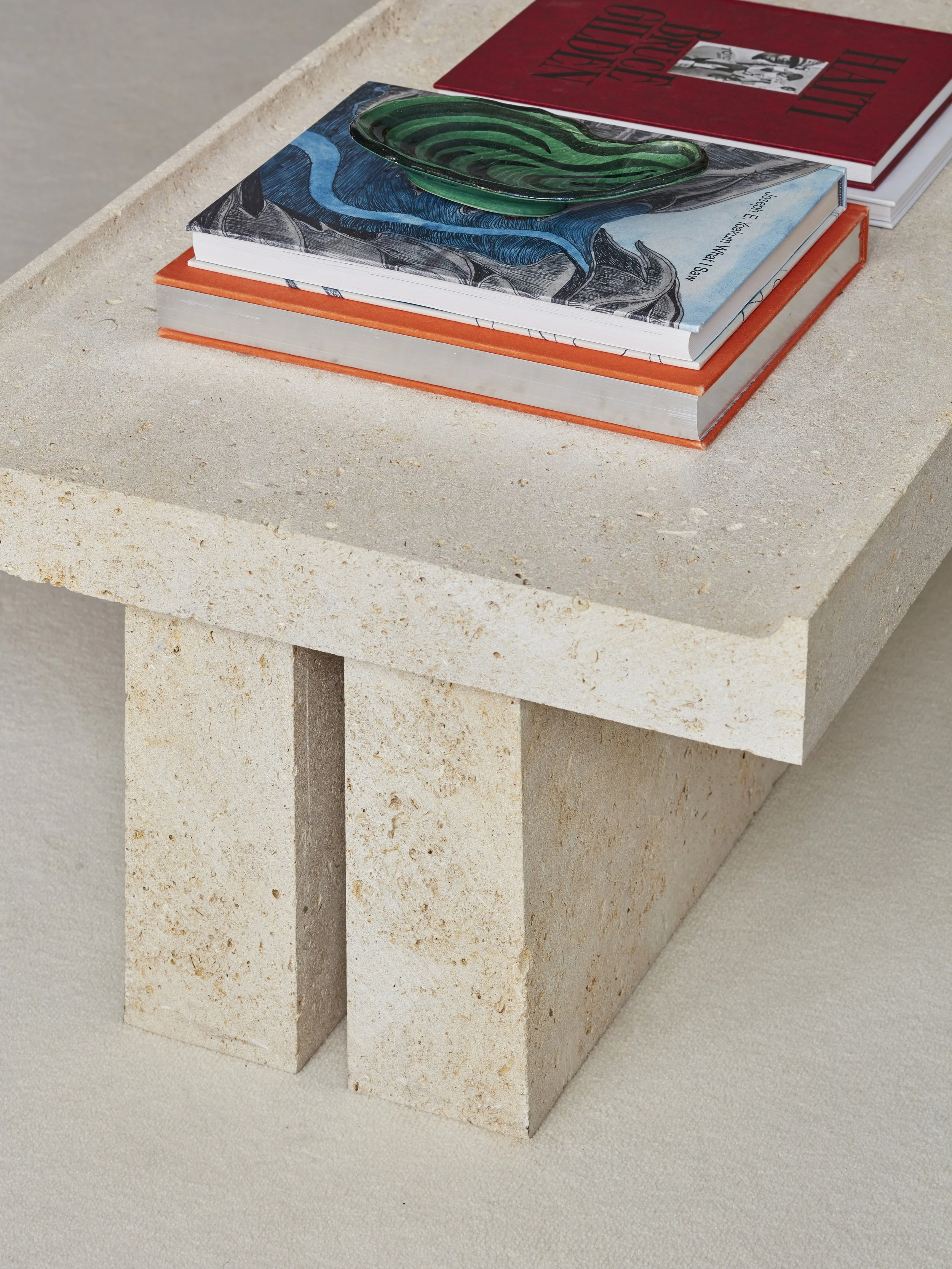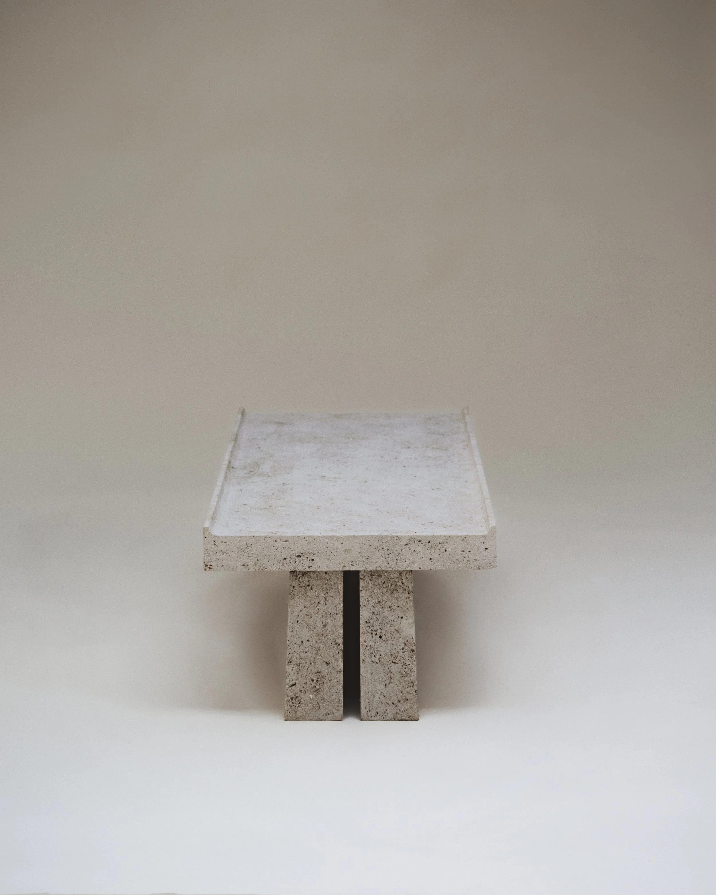 The ROCKY series was defined by weight, volume, and elemental simplicity. Its monolithic forms played on contrasts between solidity and emptiness, with thin upstands outlining the tabletop like a quiet architectural frame. The coffee table, crafted from Saint-Maximin marble, exuded a grounded presence, while the sofa ends in solid oak and solid ash offered a warmer counterpart. Each appeared as a sculpted terrain — a surface for objects, conversation, and reflection.