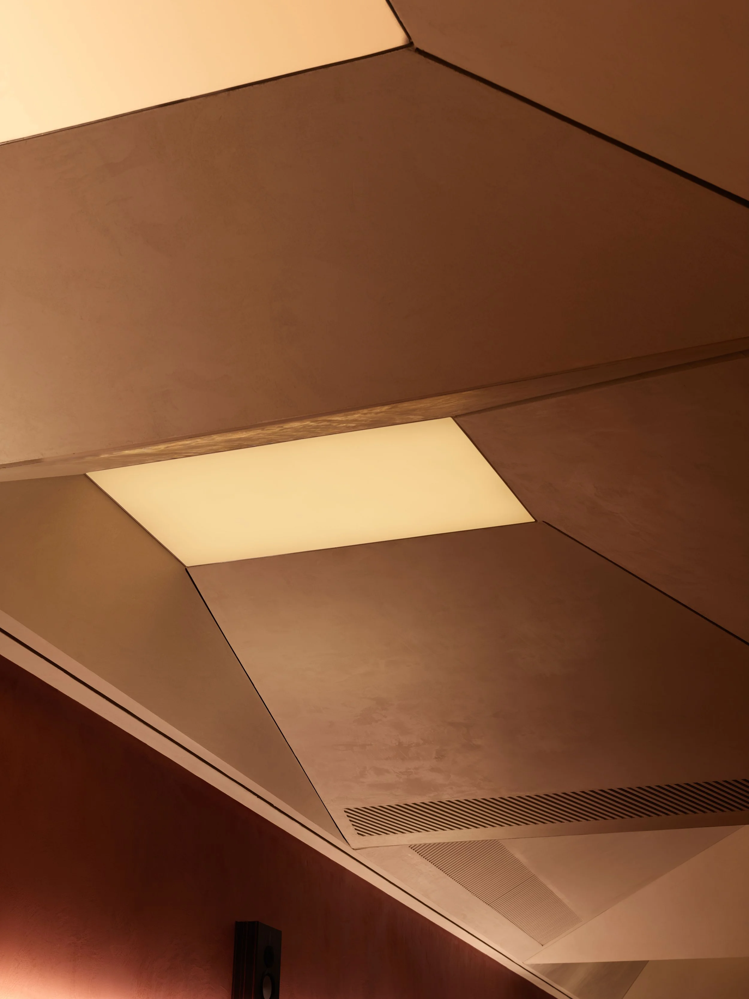 Lighting is calibrated to this variability, where a controlled layered system works with the ceiling geometry and surrounding surfaces. Light is treated as an architectural tool that can sharpen or soften the room, supporting different atmospheres without turning the space into a one-note scene.