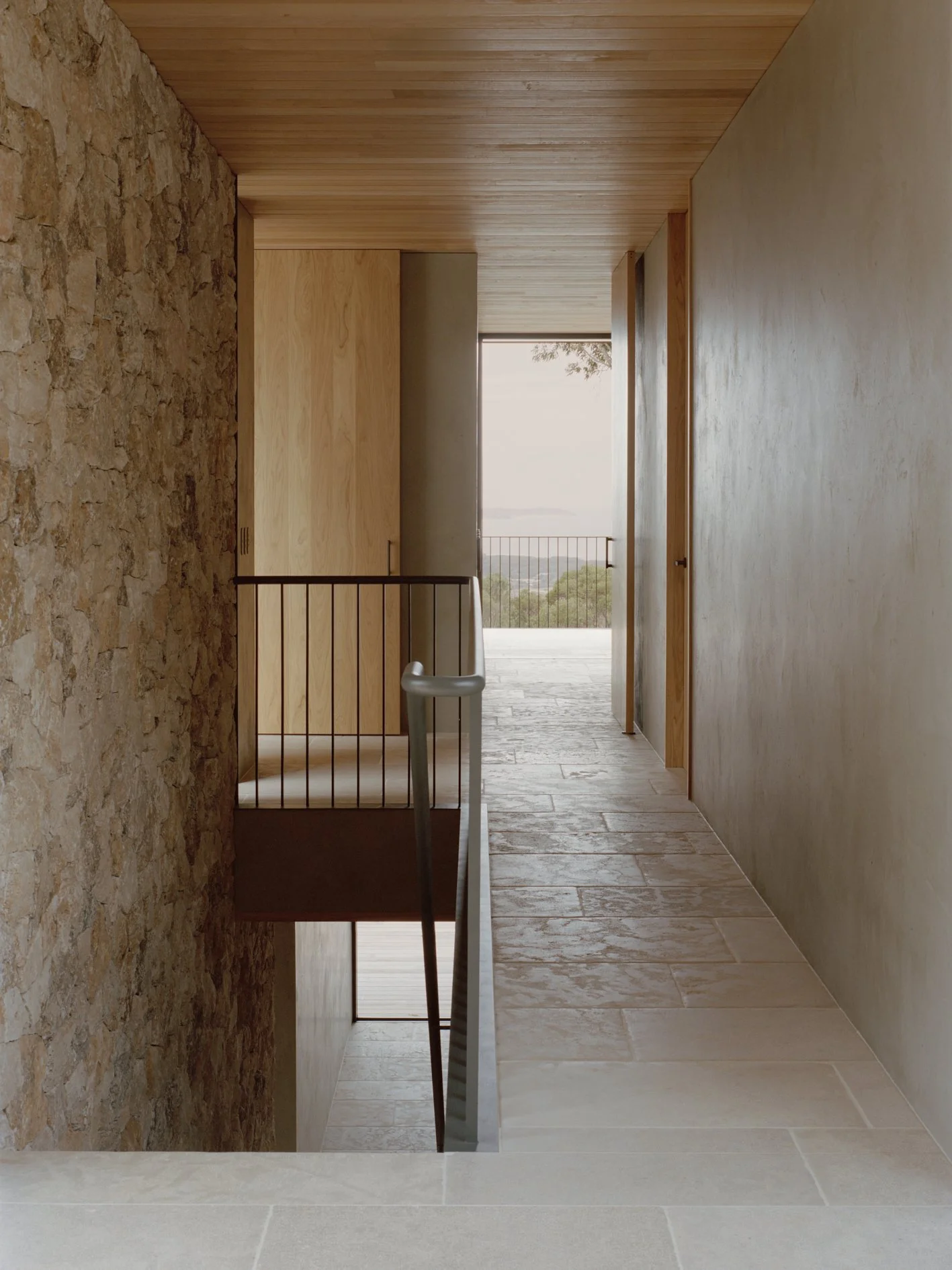 Limestone extends through the interior and continues outward to the courtyard terraces and connecting walkways, strengthening the relationship between inside and outside. This material continuity is especially clear around the central garden, designed in collaboration with Eckersley Garden Architecture, where natural stone crazy paving introduces a mid-century quality and three mature olive trees bring shade, stillness and a sense of permanence.
