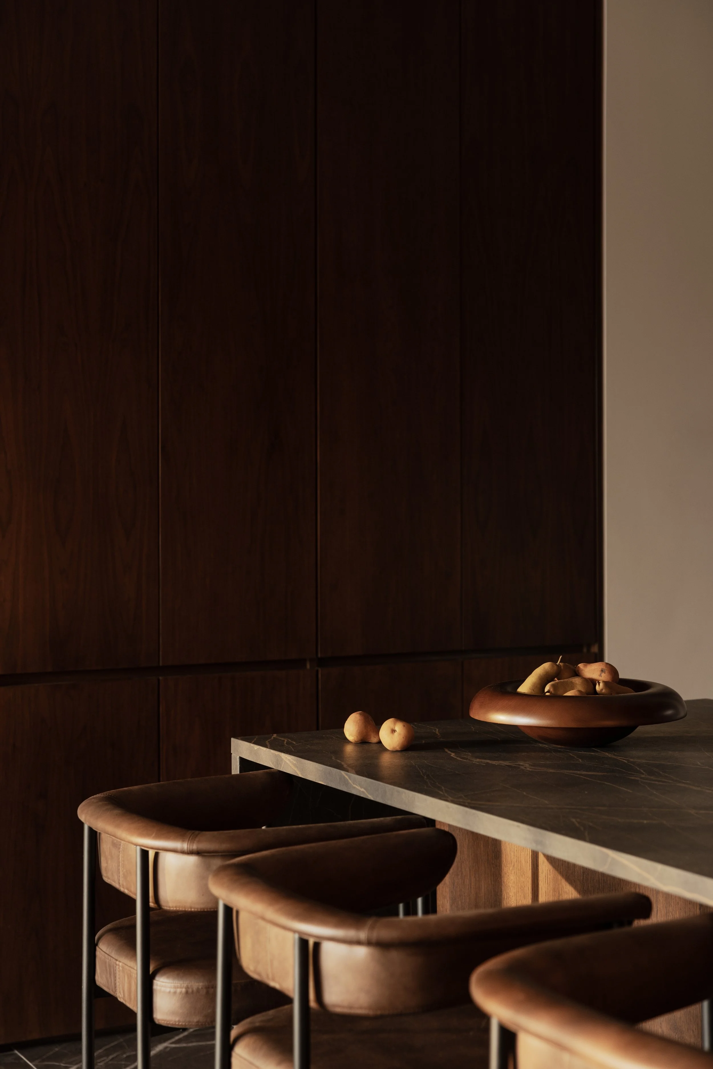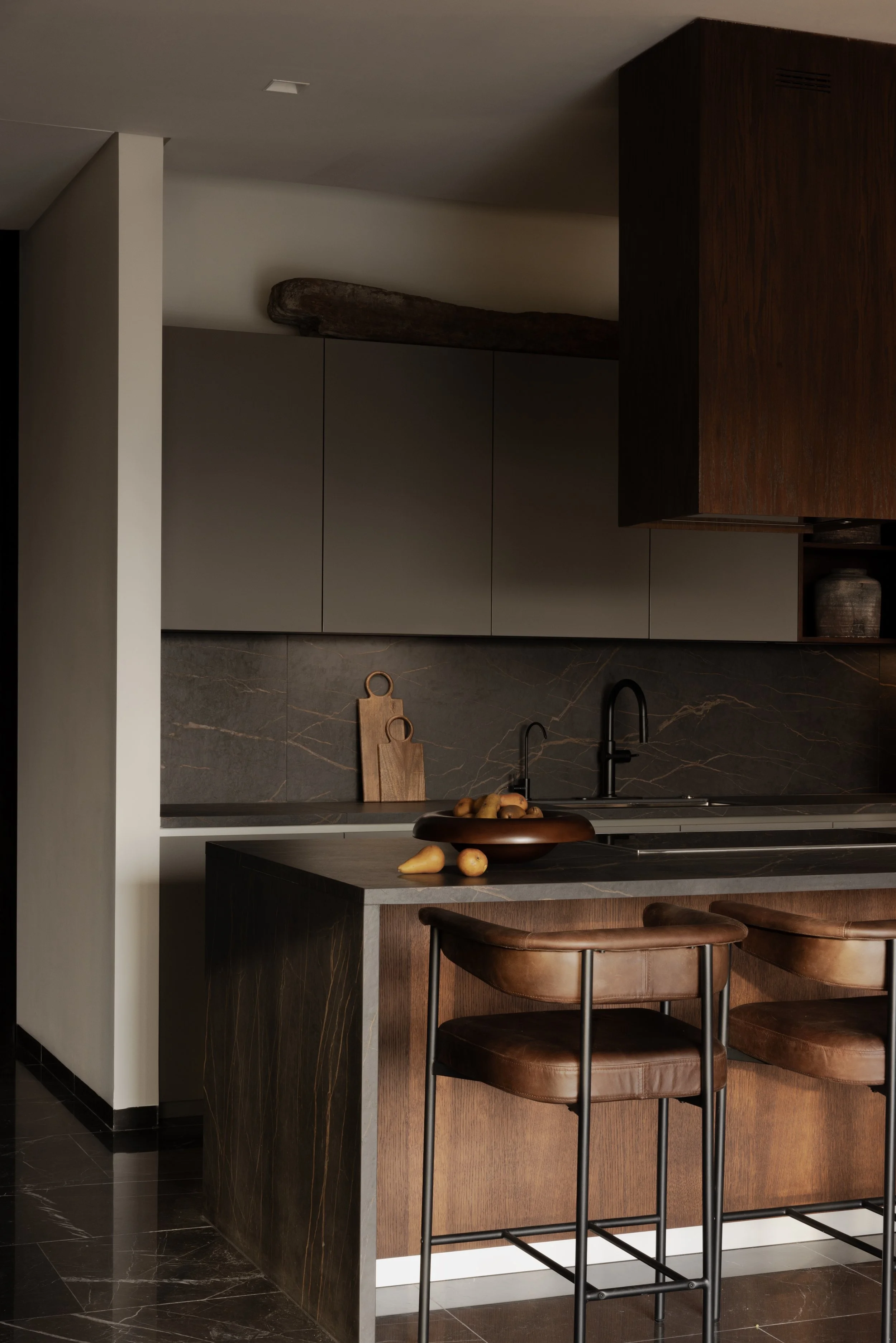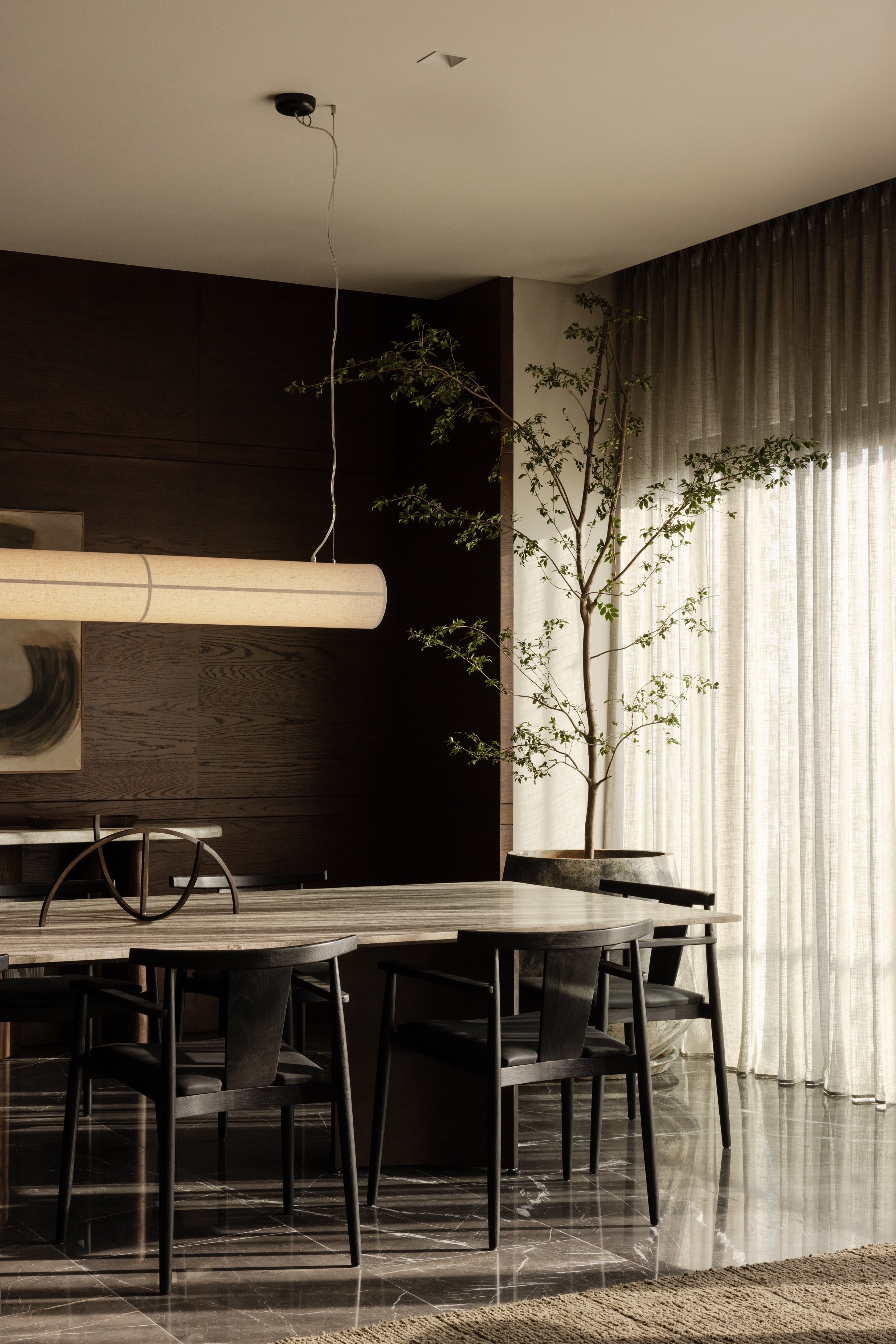 The apartment explores the dialogue between geometric precision and organic materiality. Dark wood panelling forms the spatial envelope, its exposed grain creating textural depth that contrasts with the apartment's otherwise pale material palette. The wood surfaces function as architectural elements that establish both visual weight and acoustic quality, recalling Japanese traditions where timber joinery becomes structure and finish. Here, the wood operates as a grounding backdrop, defining the boundaries of each space while allowing other elements to emerge.