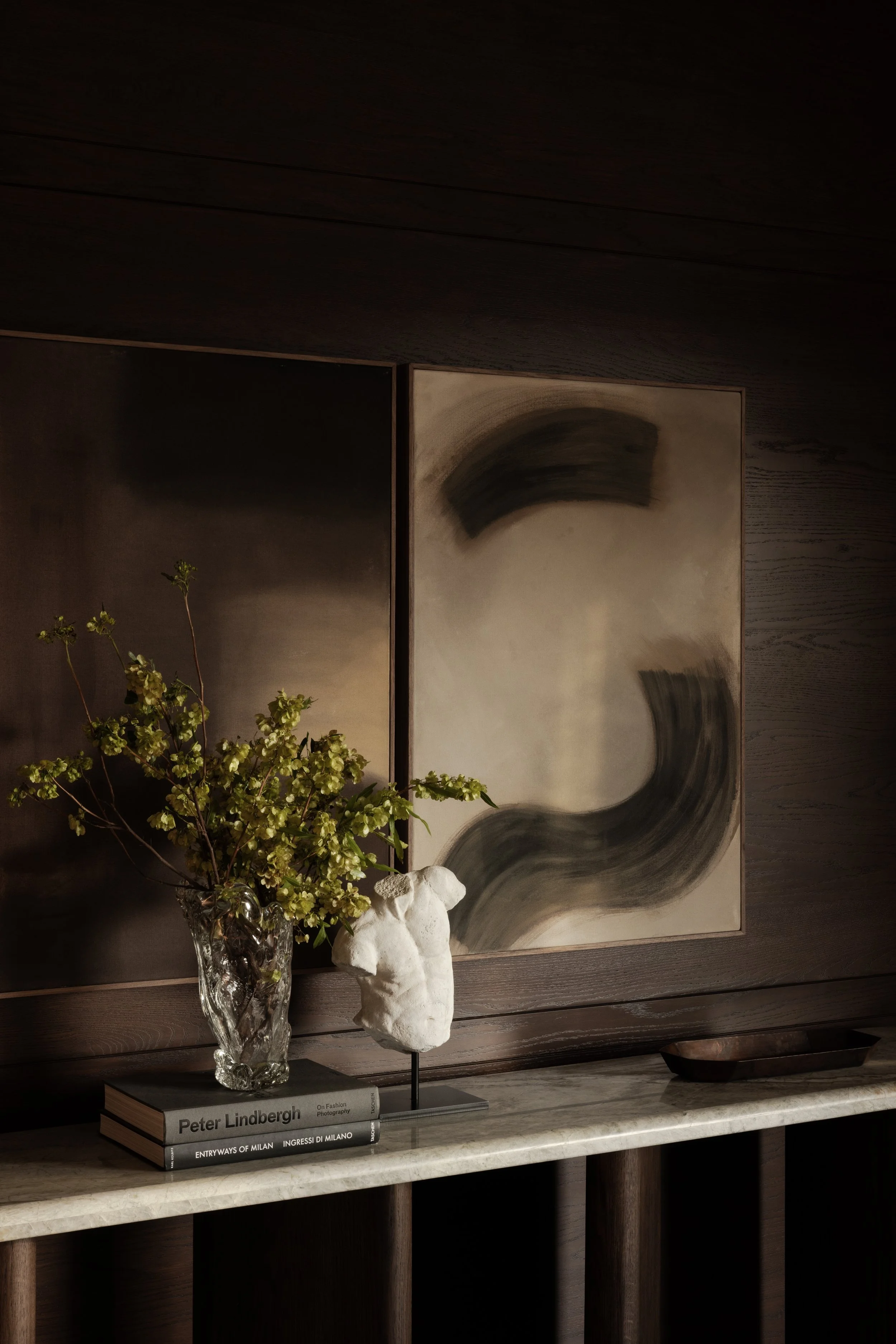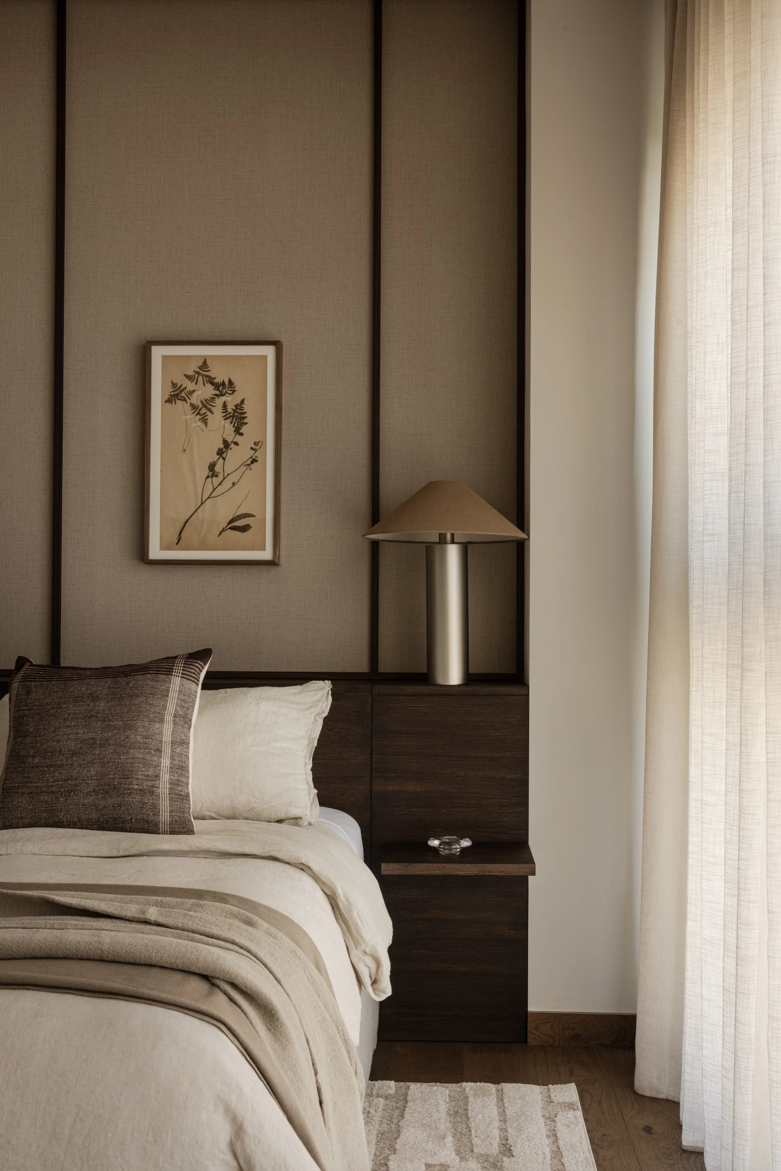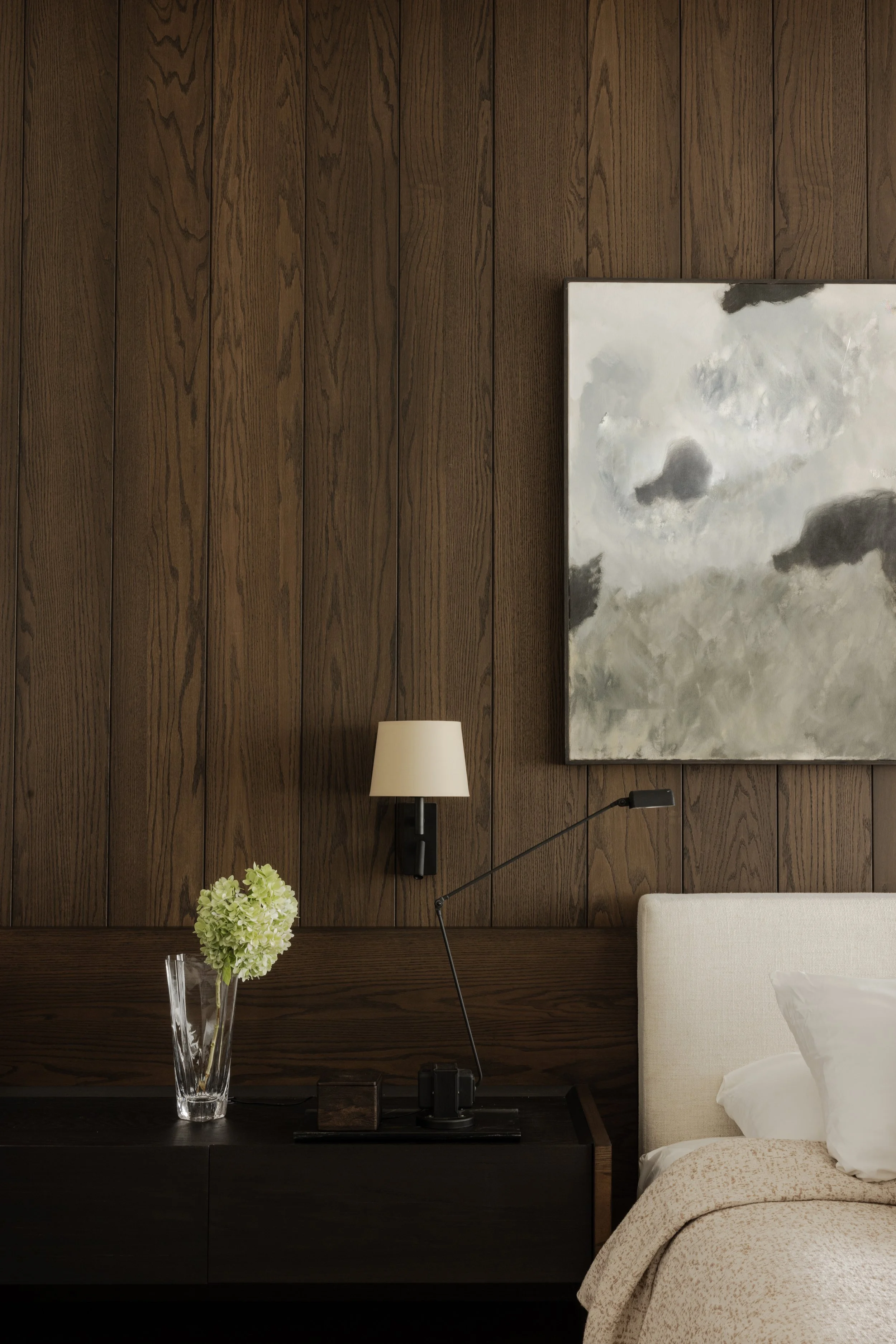 The apartment explores the dialogue between geometric precision and organic materiality. Dark wood panelling forms the spatial envelope, its exposed grain creating textural depth that contrasts with the apartment's otherwise pale material palette. The wood surfaces function as architectural elements that establish both visual weight and acoustic quality, recalling Japanese traditions where timber joinery becomes structure and finish. Here, the wood operates as a grounding backdrop, defining the boundaries of each space while allowing other elements to emerge.
