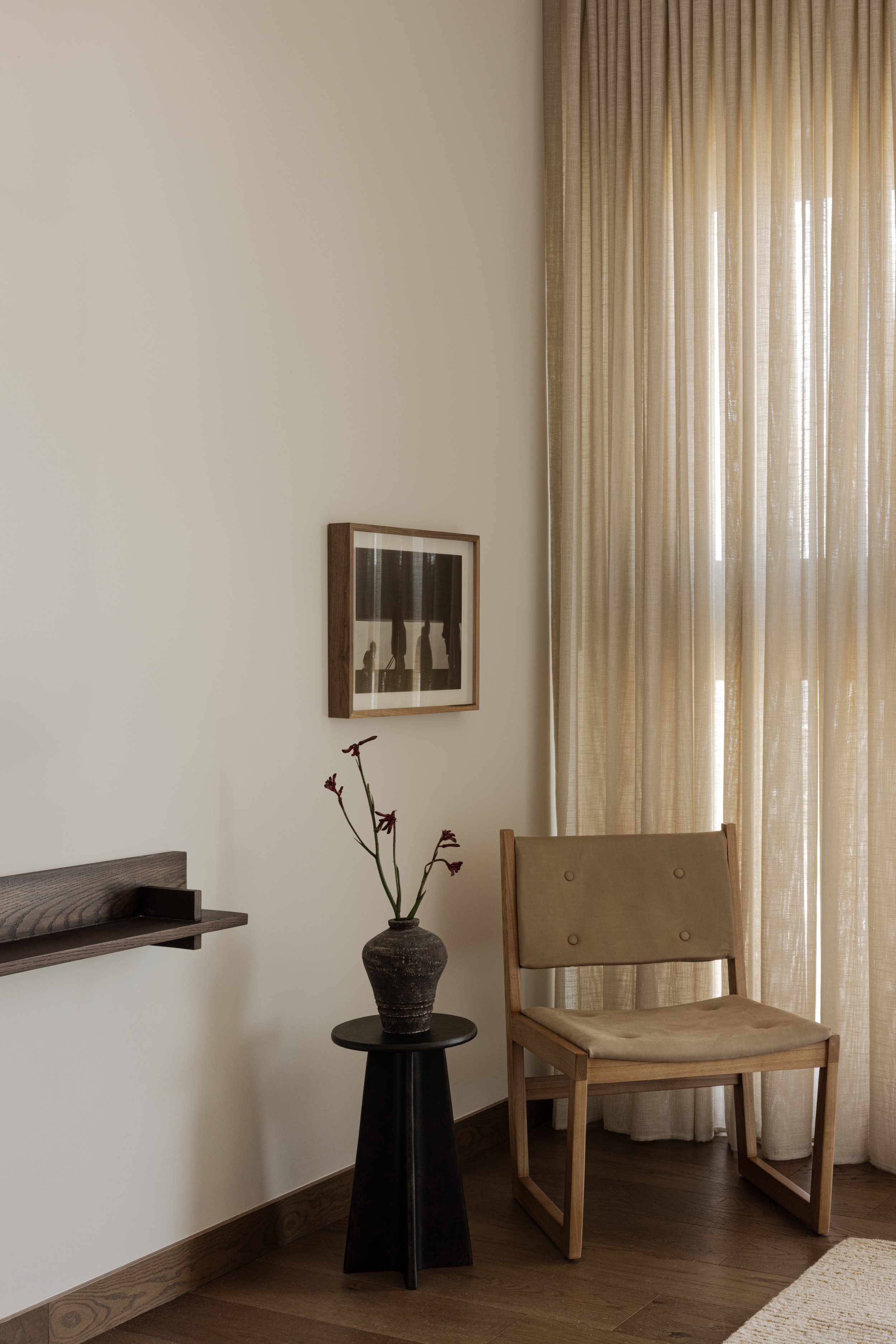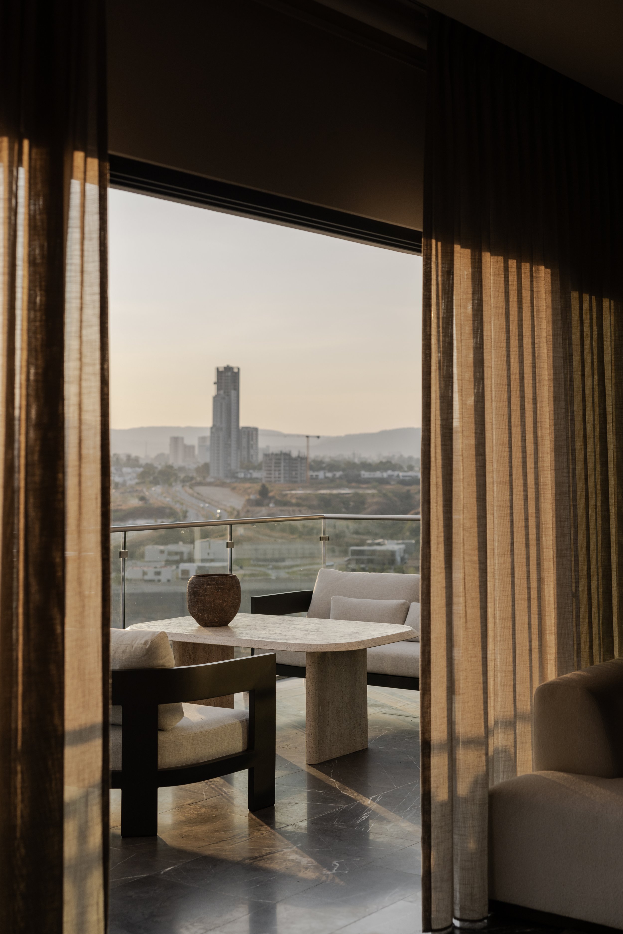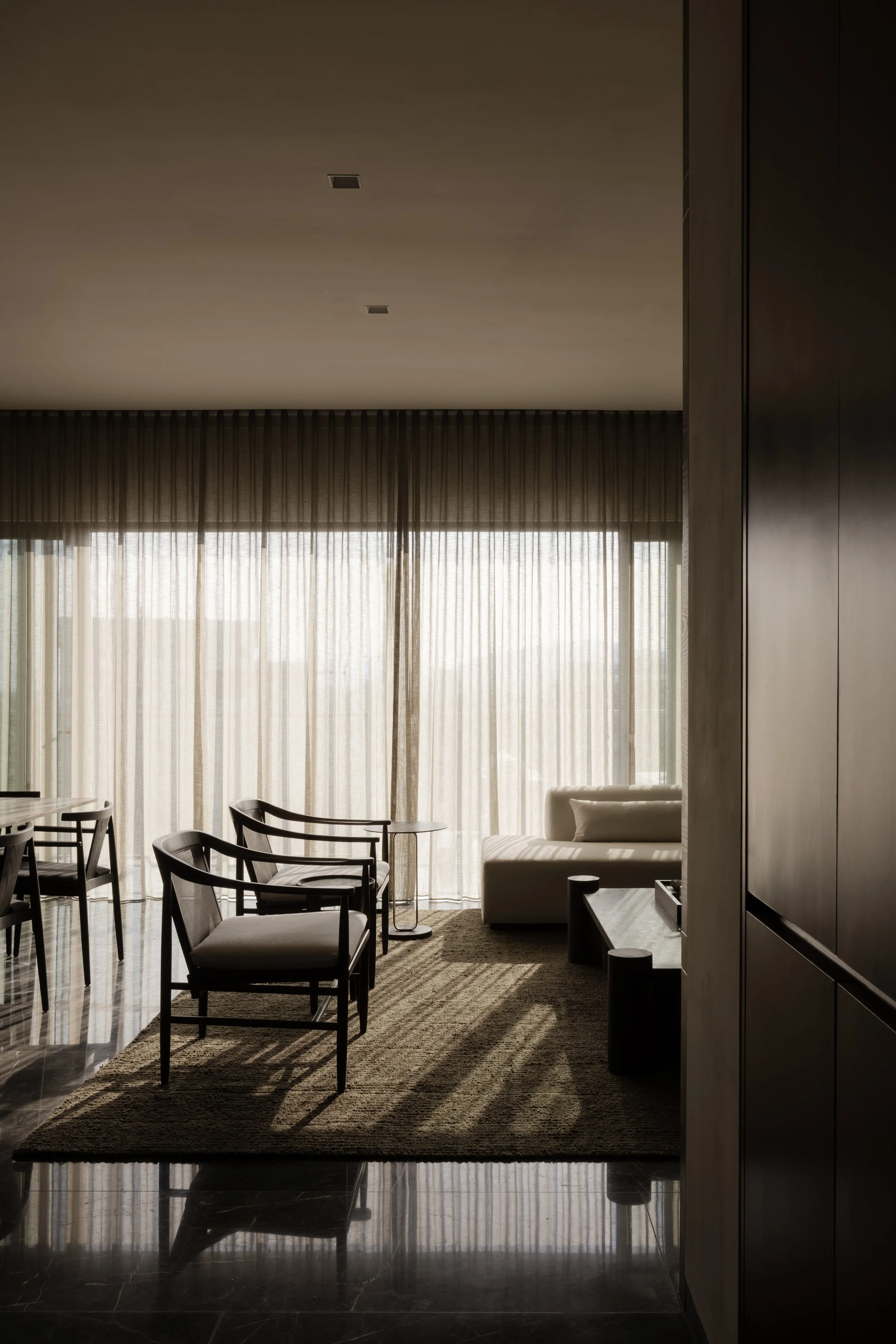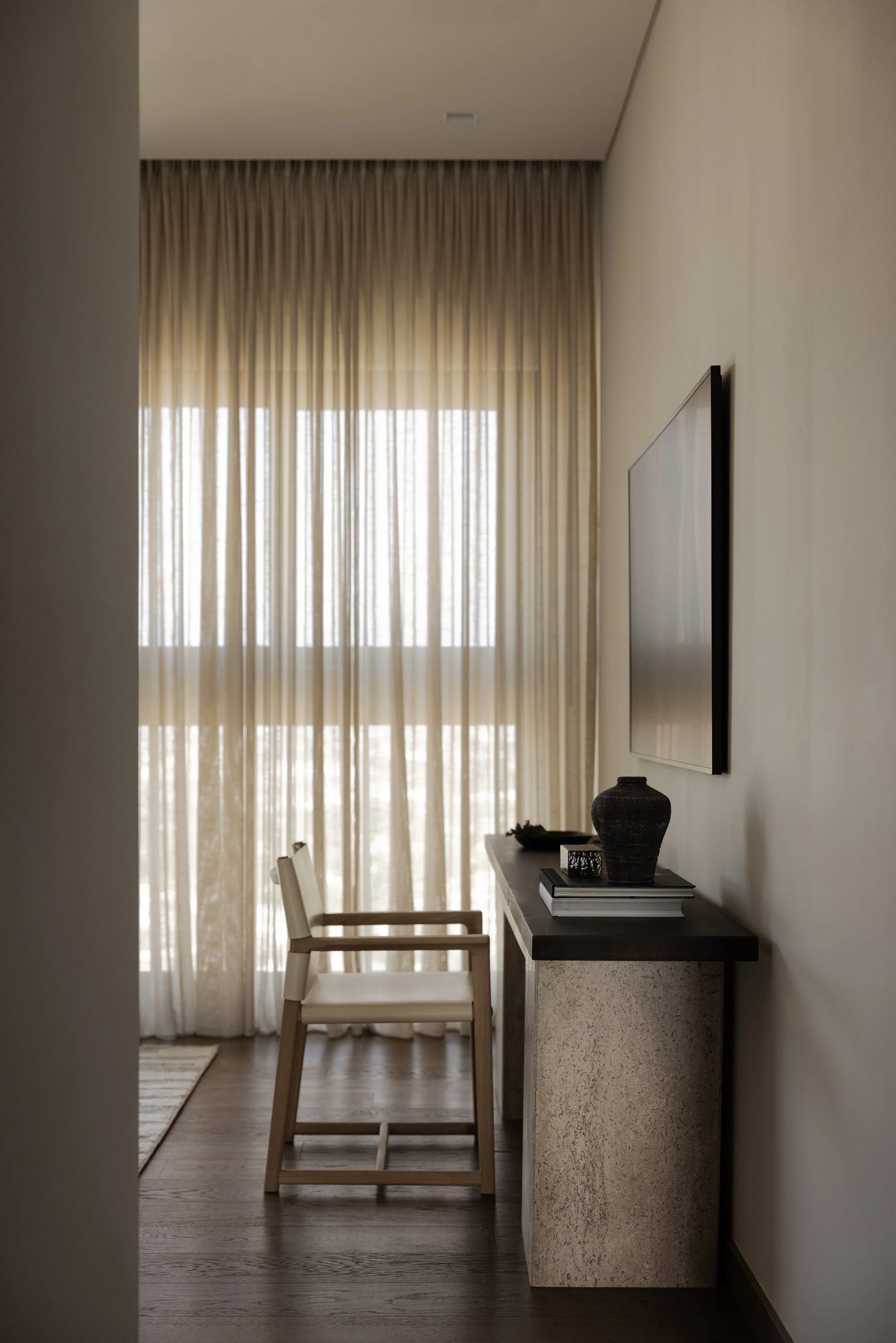 Light control becomes a defining architectural strategy. Floor-to-ceiling translucent curtains function as kinetic filters, transforming direct daylight into diffused illumination that shifts throughout the day. The curtains mediate between exterior conditions and interior atmosphere, creating interplay between light and shadow that gives three-dimensional definition to objects within the space. Shadows highlight the texture of handwoven rugs, give volume to ceramic vessels, and animate the objects that inhabit built-in shelving with curatorial discernment.