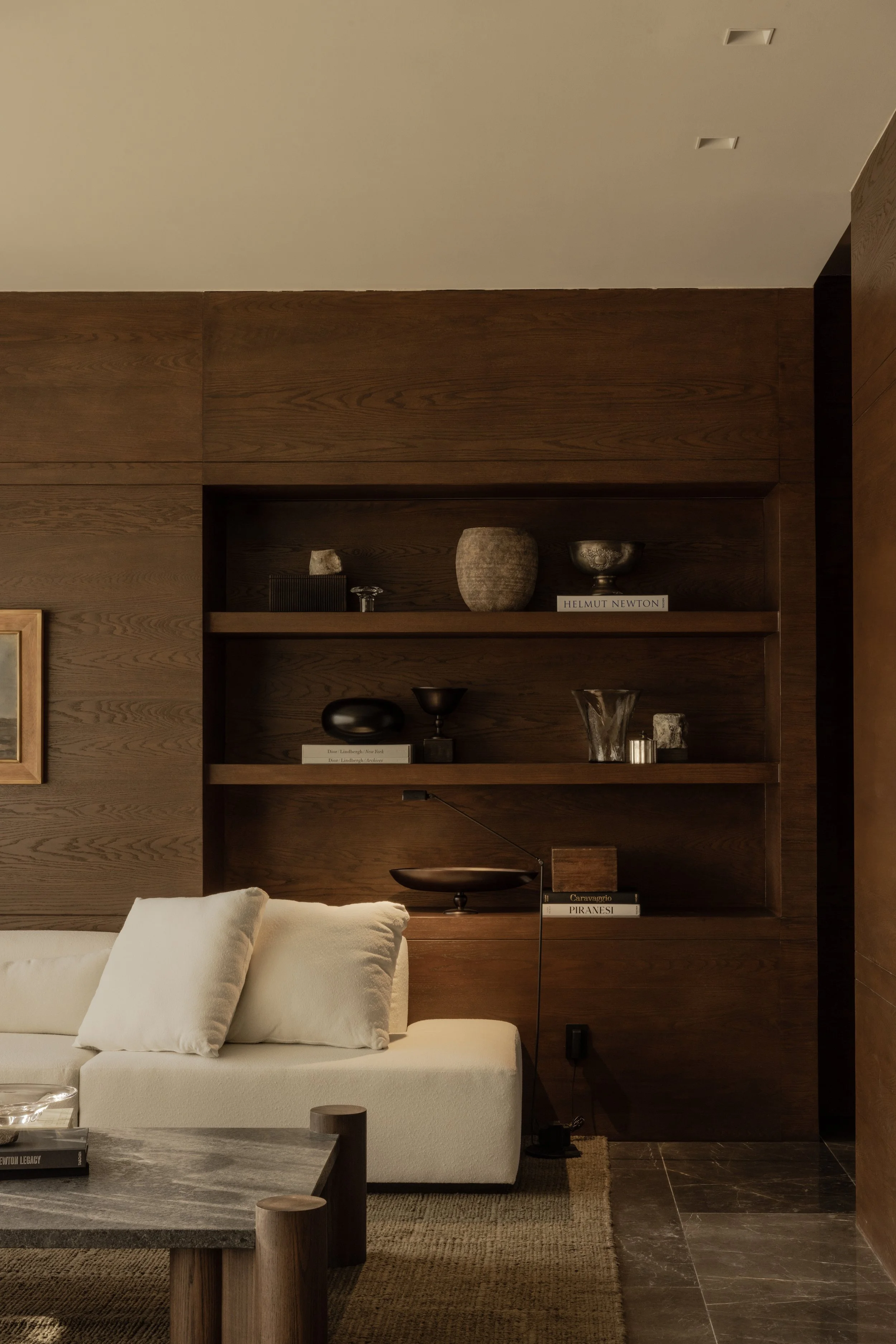 The furniture selection reinforces this balance between mass and lightness. Bone-toned linen sofas provide soft horizontal planes that counterpoint the vertical wood panelling, while stone tables with deliberately softened edges introduce geological presence without heaviness. The stone pieces appear shaped through erosion rather than mechanical cutting, a surface treatment that suggests natural formation processes. This approach to materiality creates a space where each element feels inherent rather than imposed.