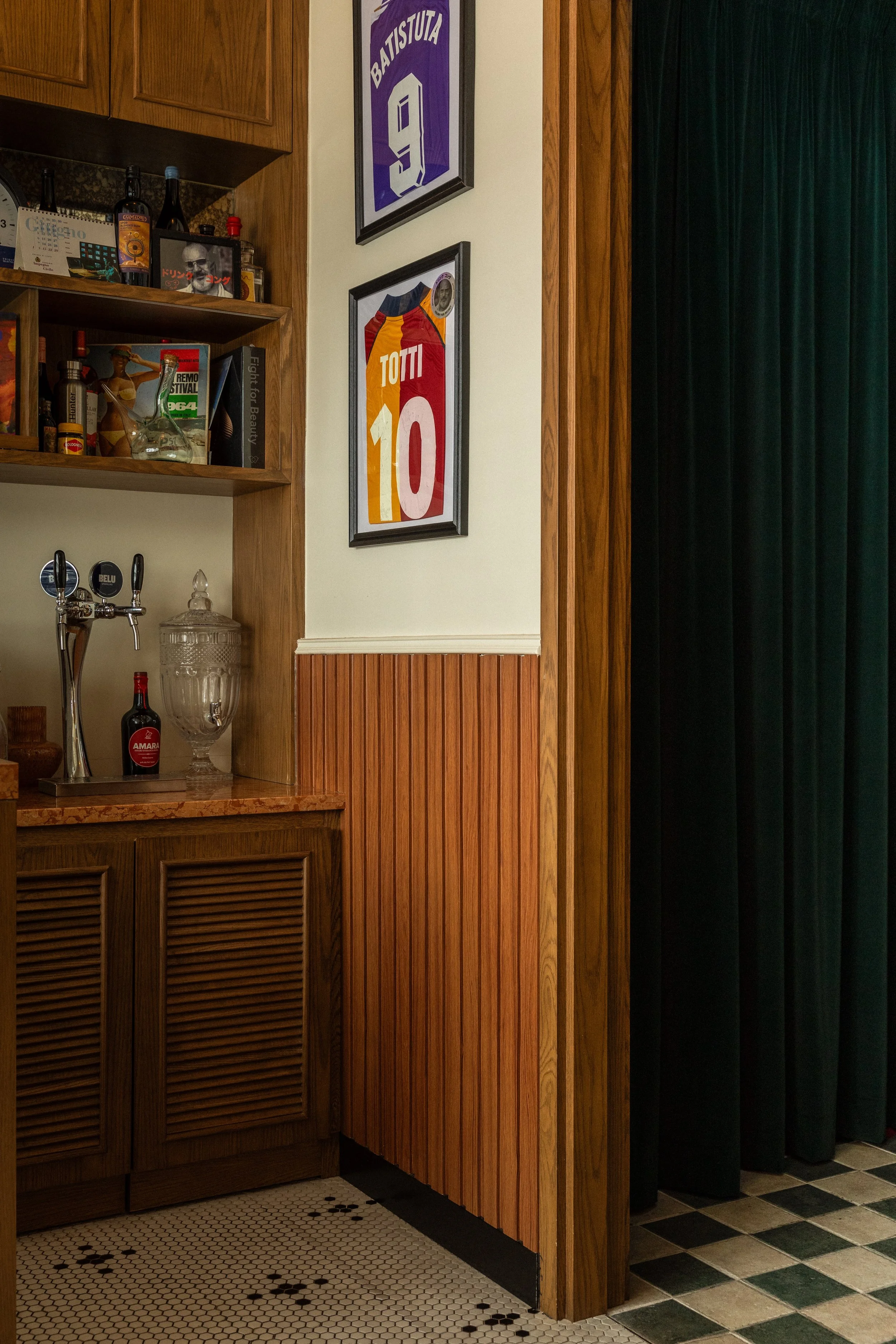 The interior palette establishes a mood that feels both timeless and transportive. Neutral, warm-painted walls form a soft backdrop to the dark wood beaded-panel wainscoting that anchors the perimeter. The surfaces are punctuated by hand-aged mirrors, their softly clouded reflections adding a sense of depth and history. A Rosso Verona marble countertop forms the centrepiece of the bar, its warm red veining offset by the glow of low lighting. The effect is one of quiet craftsmanship, eschewing replication in favor of authentic patina and an interplay of light and shadow that shifts with the passing hours.