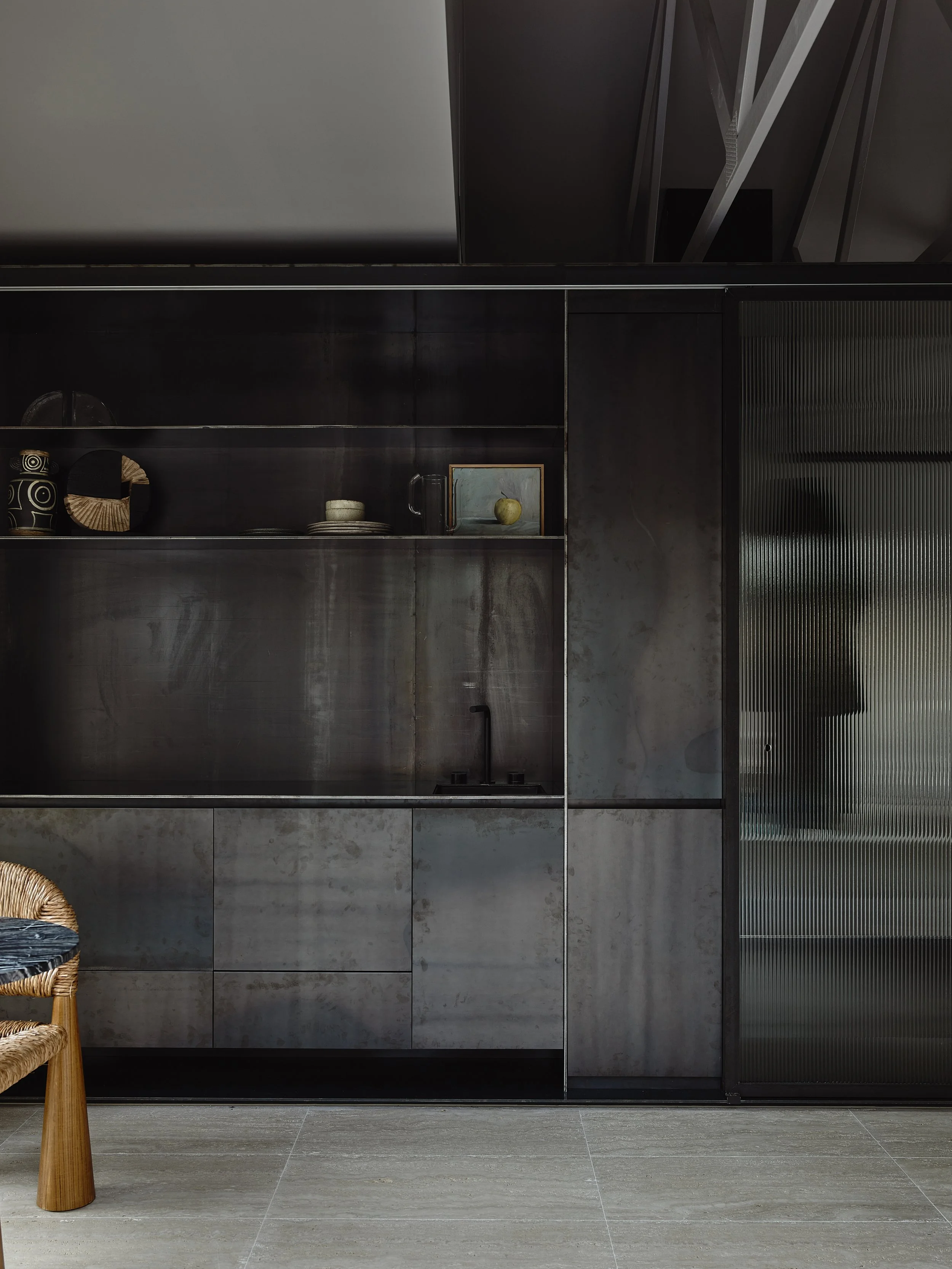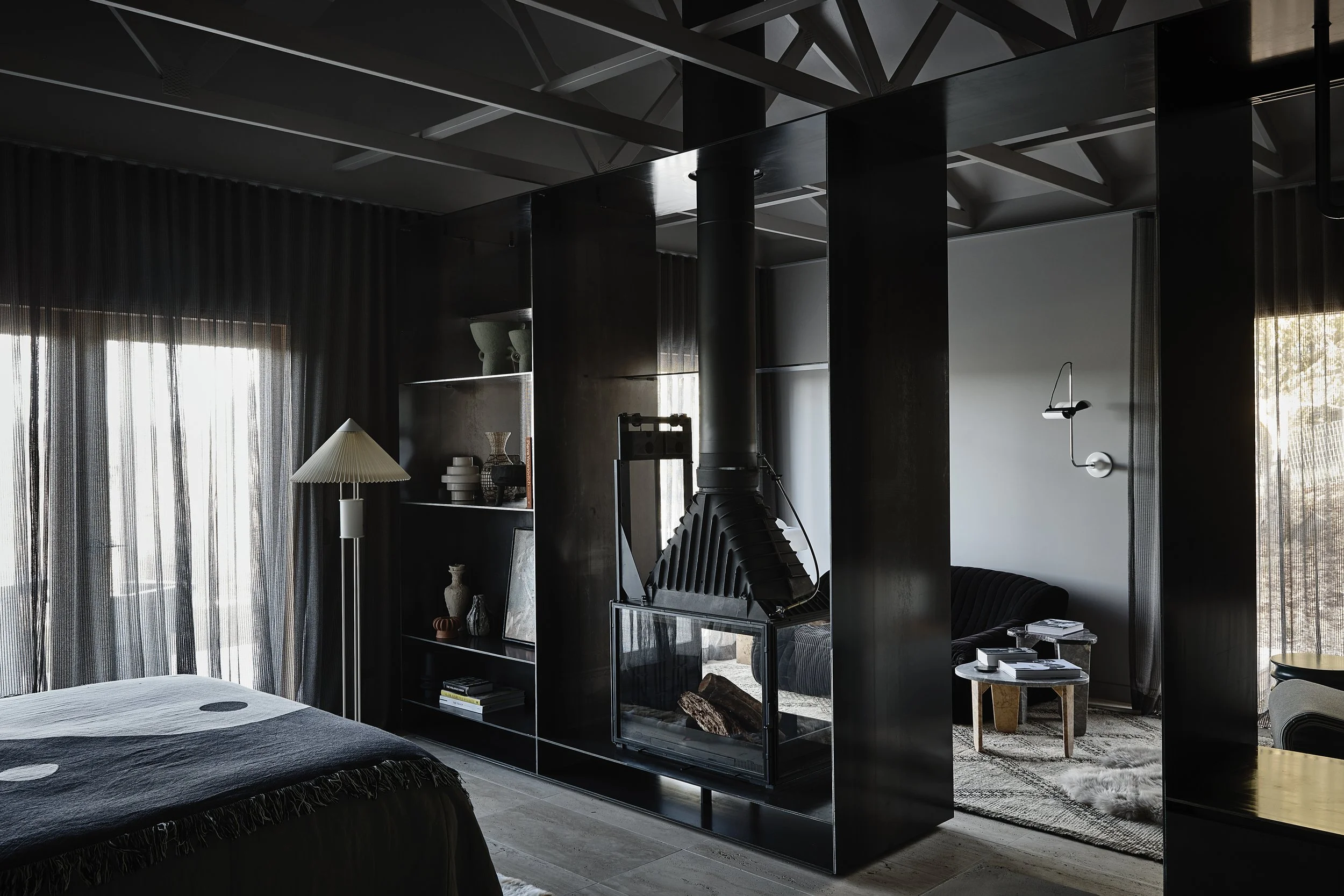 The architects have organized the main accommodation cabin into two distinct zones, separated by a central sliding reeded glass wall that mediates between public and private spaces. The social area encompasses a kitchen with industrial-grade steel finishes, a breakfast nook, and an intimate lounge arranged around a fireplace. The private wing houses the main bedroom, robe, and a striking custom concrete bath illuminated by a carefully positioned skylight.