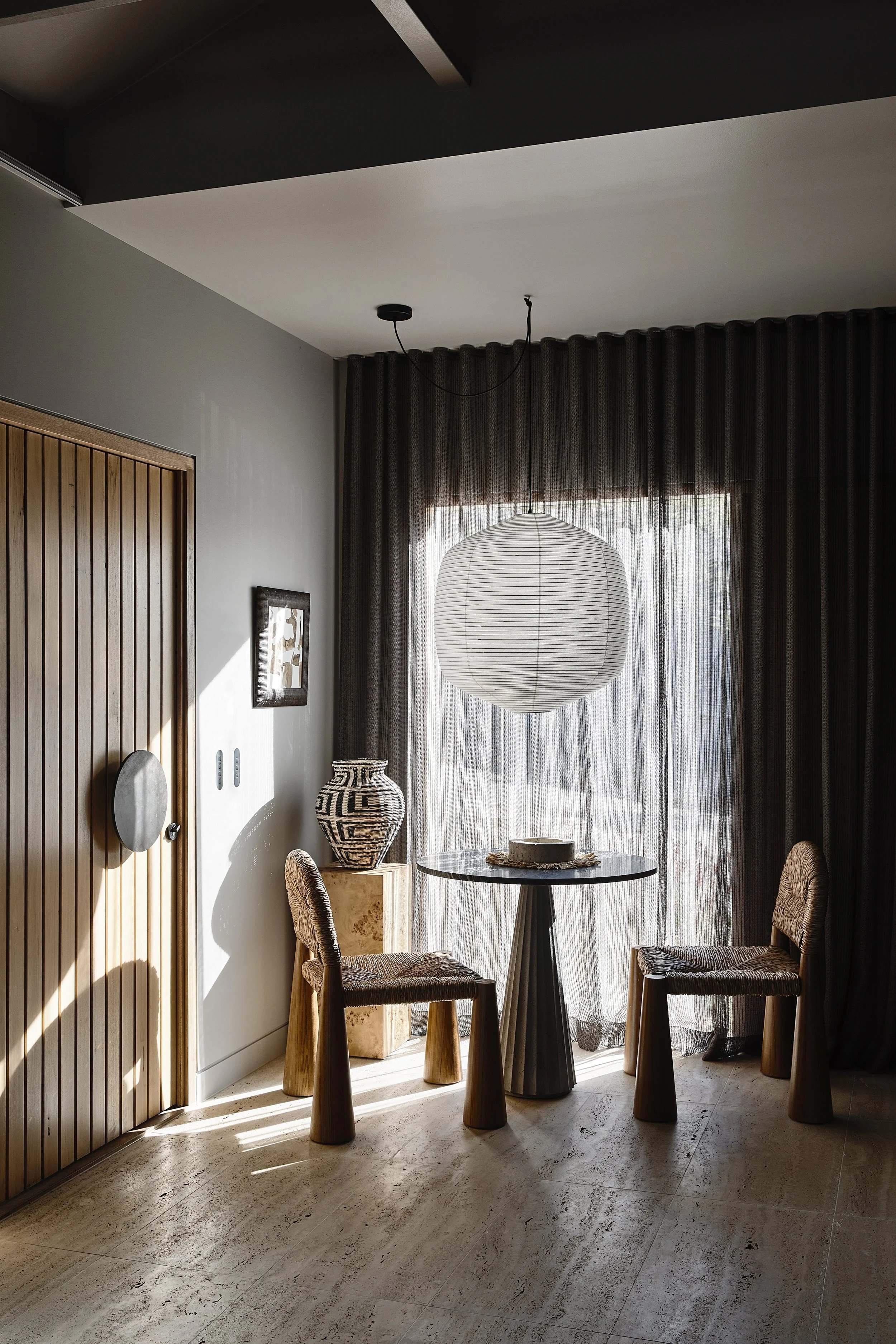 Interior stylist Simone Haag has curated a sophisticated collection that merges vintage Italian and French pieces with contemporary Australian furniture. Notable among these is the Brionvega Radiofonografo, which occupies a central position and contributes to the multisensory experience the architects sought to create.