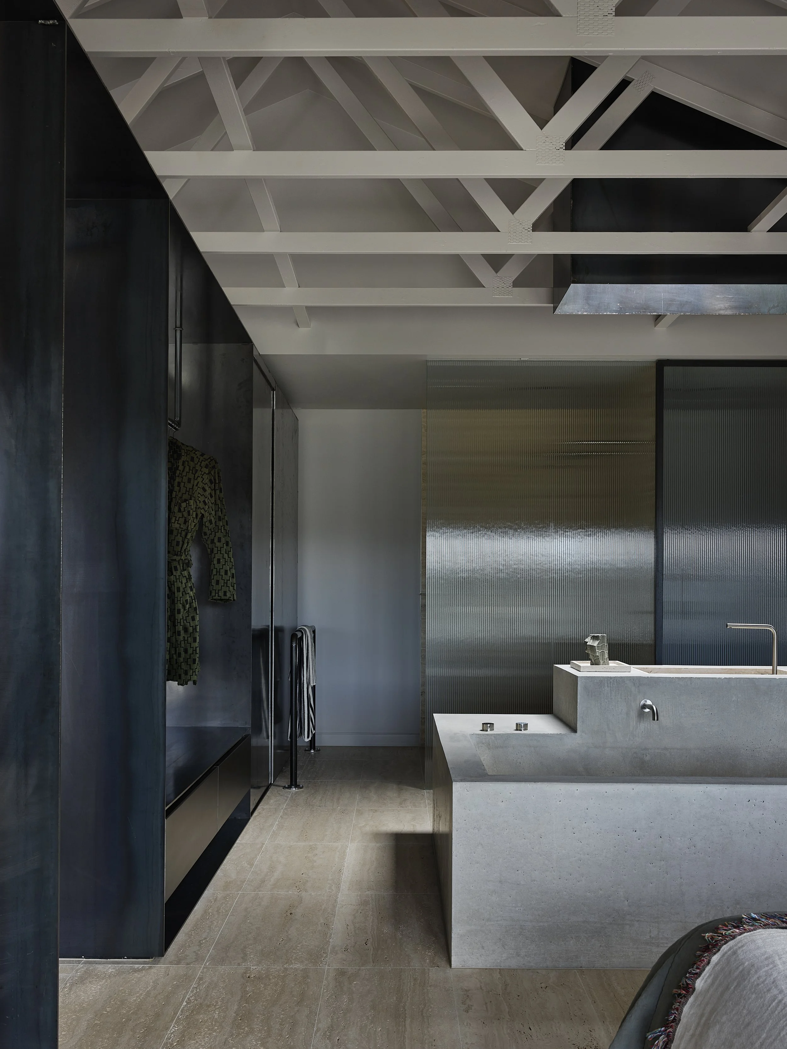 The project's attention to detail extends to the guest experience, with a bespoke cocktail and welcome hamper provided upon arrival. The bathroom features a monolithic concrete bathtub designed for contemplative soaking, complemented by a serene double shower.