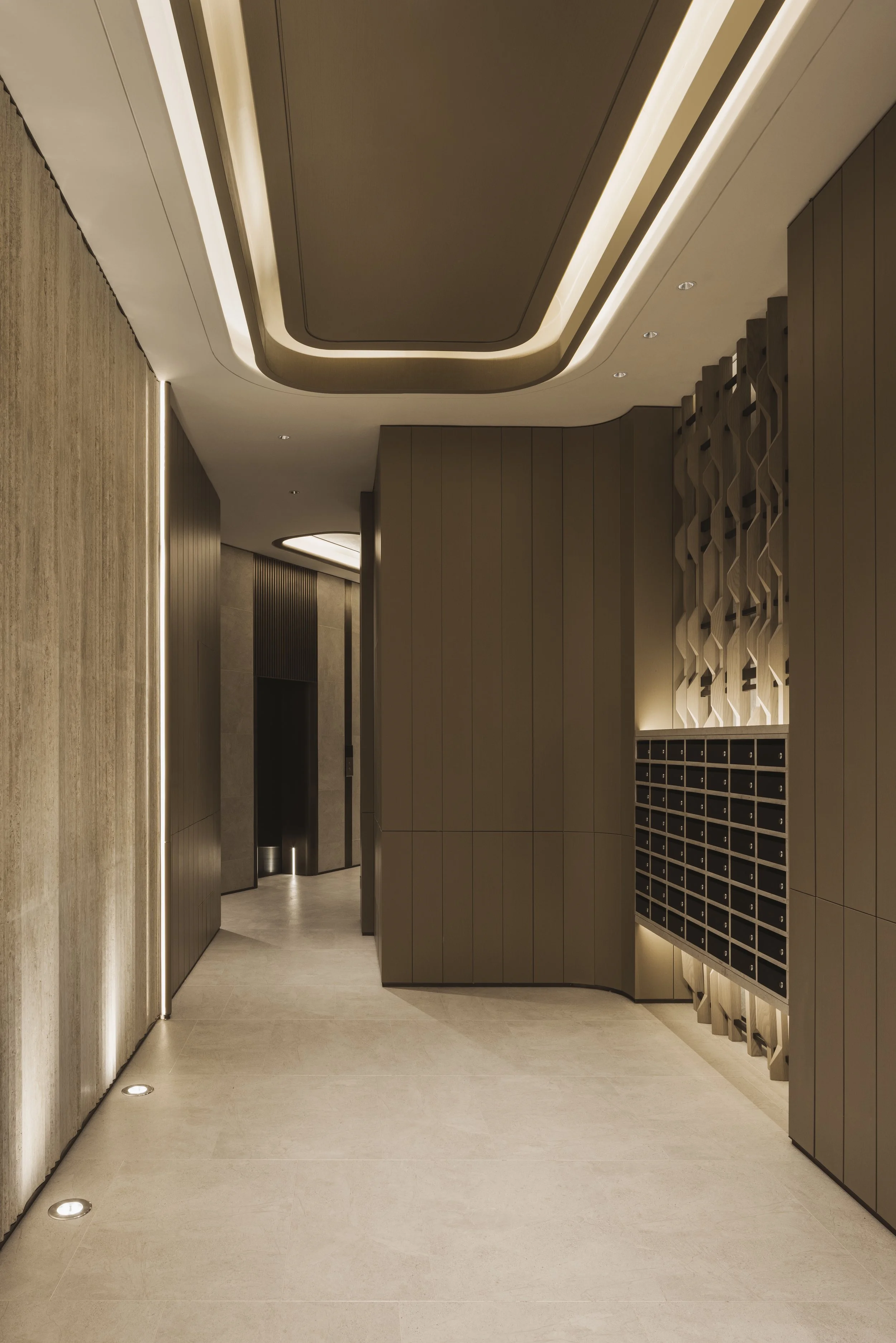 Arrival is orchestrated from the side: a first encounter with gridded timber screens concealing doors to function rooms, mah-jong rooms, a snooker room, and ancillary amenities. Along the walkway, softly lit curved walls introduce a sense of movement. At the vista’s end, twin organic sculptures and an artful pendant gather the material language into a quiet moment of focus.