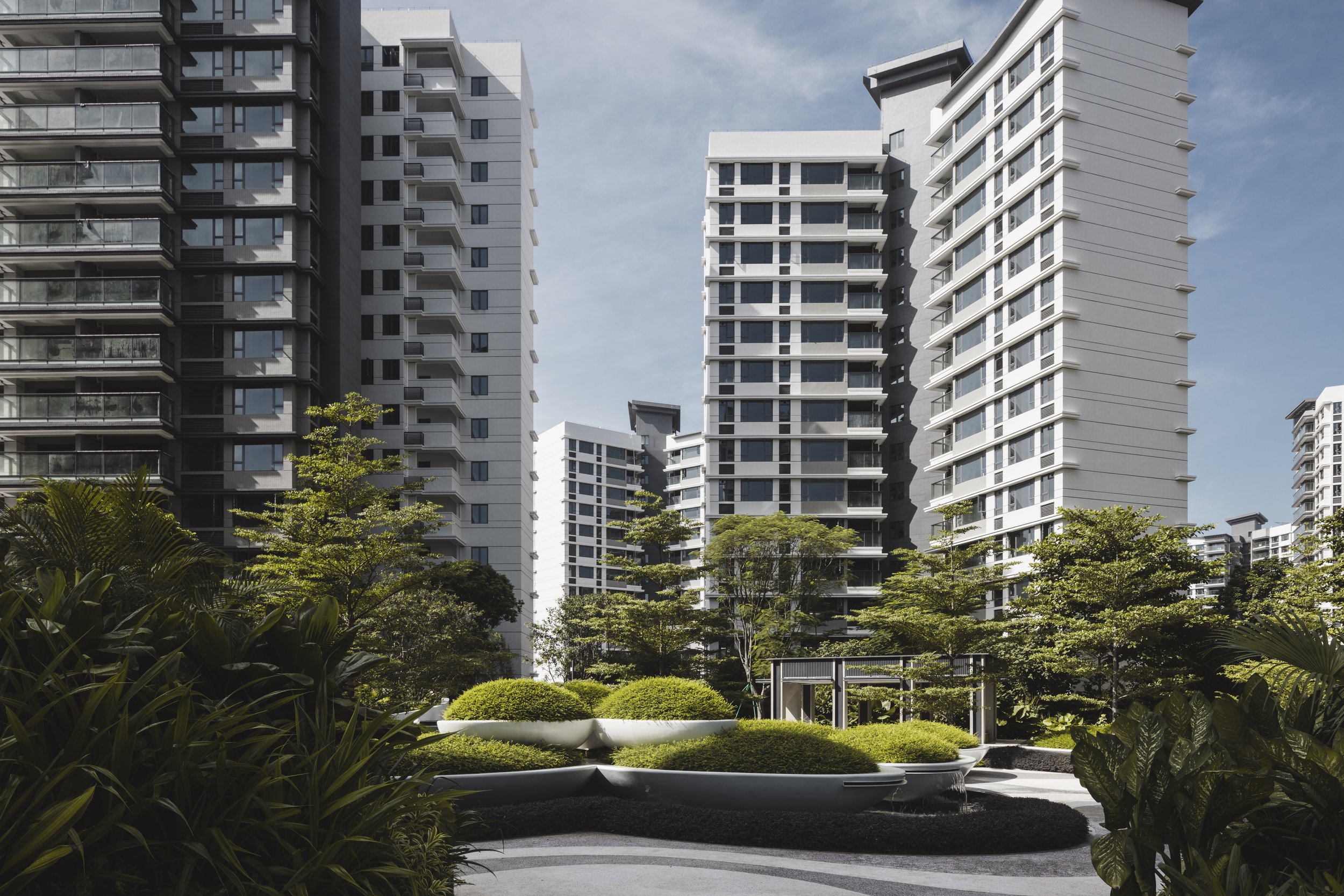 Adjacent to the exterior, a slender bar counter and stools sit before a tiled screen that enfolds a small retreat. Outside, diverse seating offers zones for conversation, quiet work, or casual dining—each positioned to draw residents toward the landscape and each other.