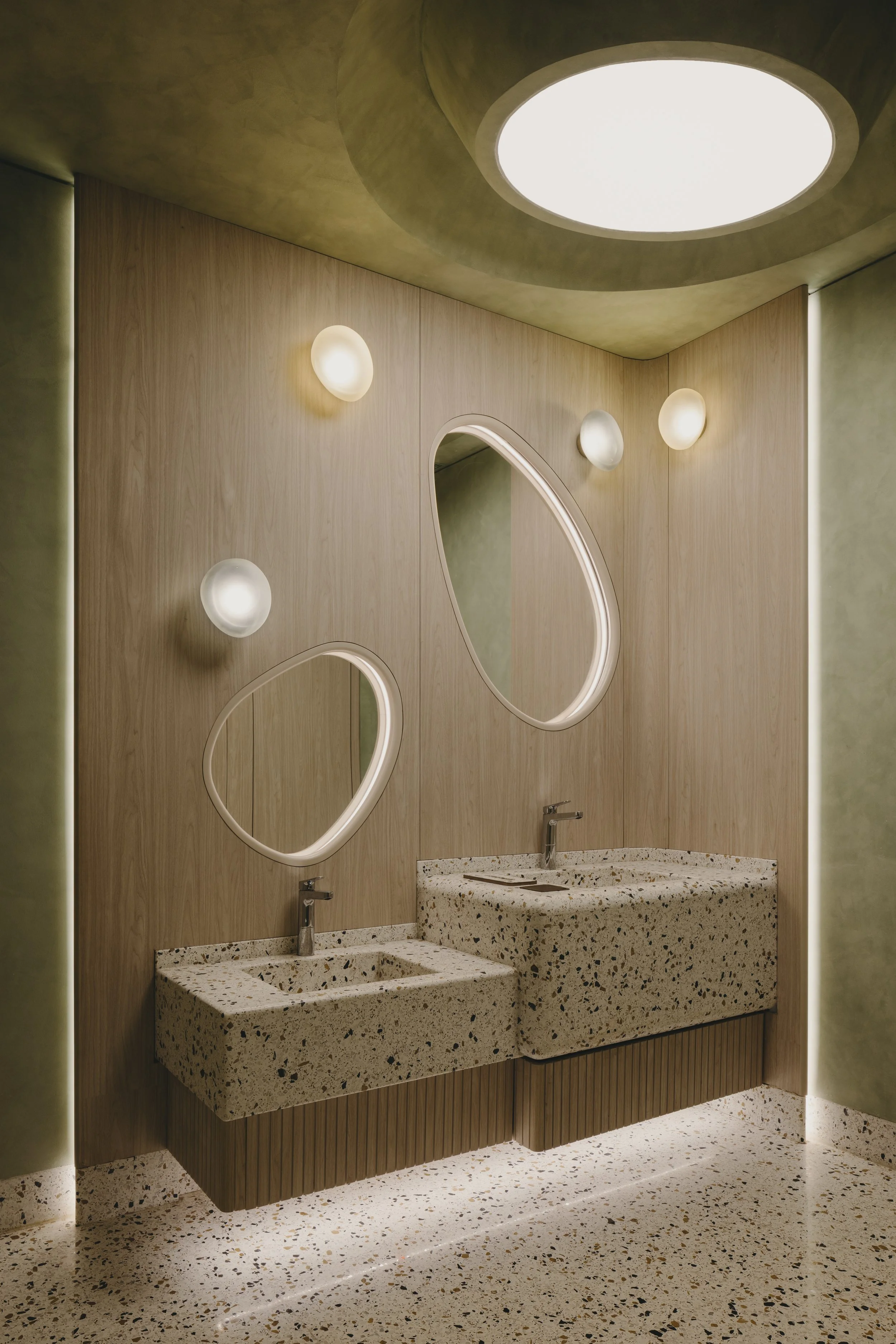 Parents, meanwhile, can wait just outside on mushroom stools with coffee from the pantry. In the children’s washrooms, terrazzo counters and surfaces extend the narrative. Mirrors take on organic outlines—pebbles, pools, or the spontaneous paths of a child’s drawing—sustaining delight in the everyday.