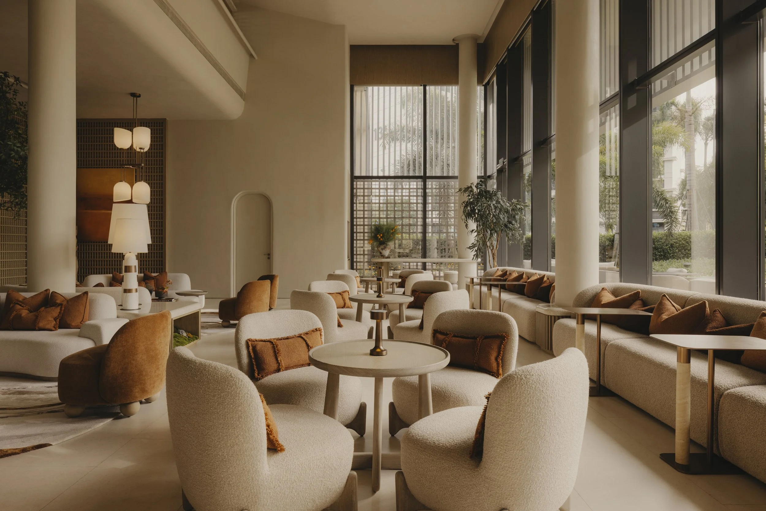A material palette of sand and cream is articulated through honed marble tiles, eco clay paint, oak veneer, and travertine counters. Durable and low-maintenance, these surfaces register light with restraint, supporting an overall sense of calm. Bespoke sofas and lounge chairs are shaped and placed with an organic ease, encouraging meandering paths and informal conversation. Daylight keeps the interior buoyant; after dusk, soft ambient lighting draws the space inward, its sculptural luminaires settling against neutral walls.