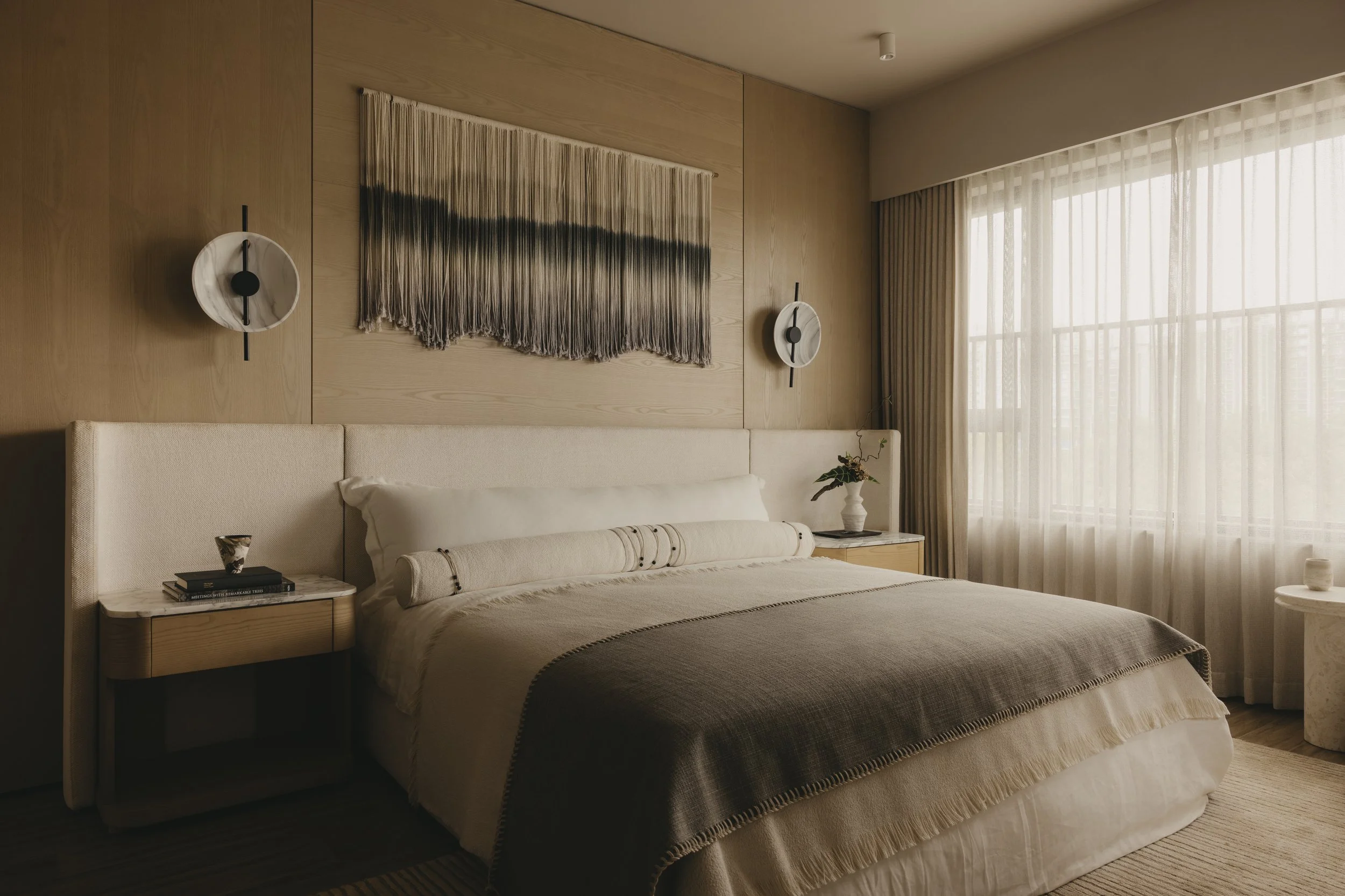 The master bedroom carries the apartment’s overarching serenity into a more cocooned register. A wabi-sabi temperament is articulated through rough-textured pots, a found coral and a slender display ledge for a hand-woven wool work inspired by Spanish tapestries. Above the headboard, a larger woollen piece recalls a snowy mountain mirrored in a blue lake, offering a tactile focal point with atmospheric depth. A related work in beige and brown appears in the living area, its palette shifting toward desert plains and long migrations—a meditation on time and place that threads the home together.