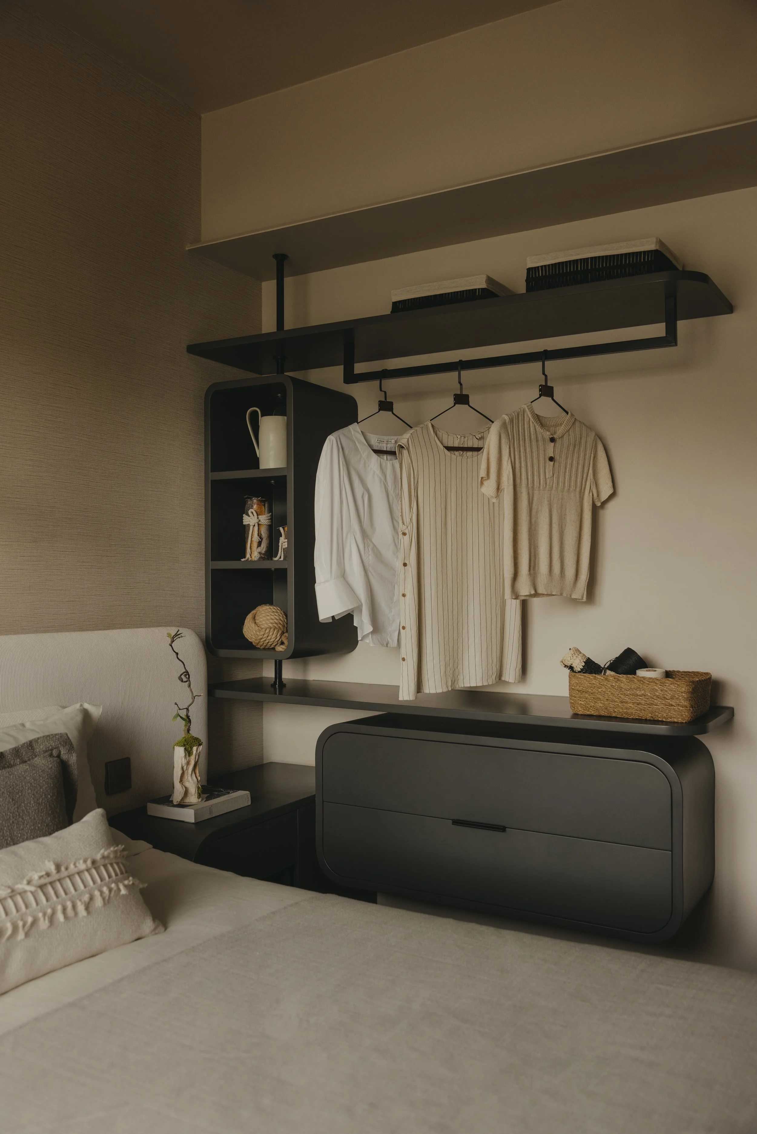 The main door opens into a combined living and dining volume that extends toward a balcony. Here, a continuous vista of tree canopy and sky is quietly framed by linen curtains, chosen for their ability to filter, soften and deepen the play of light and shade. Spatial additions are restrained. Rather than freestanding objects, built-in elements taper from the walls with a subtlety that feels geological—edges rounded, corners eased, planes meeting with a calm, tidal logic. Curves echo ocean swells, shaping a visual stillness that invites lingering.