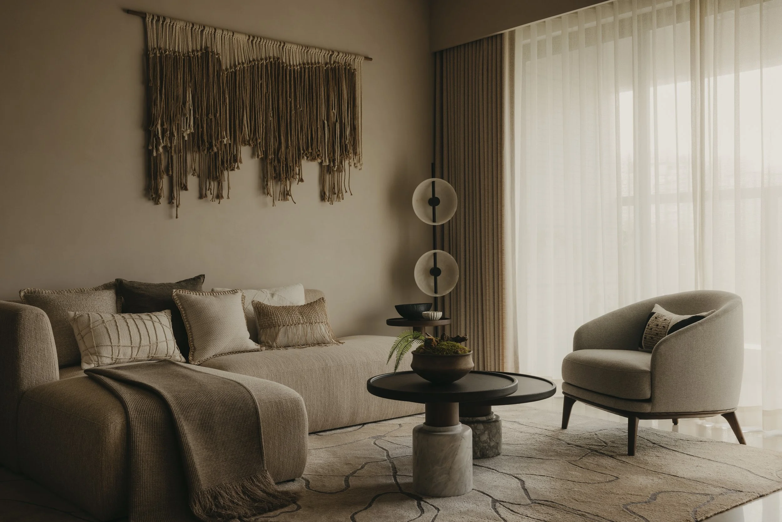 Conceived for a three-bedroom showsuite within the Eastbank Bayview development, the interior interprets nature not as motif but as atmosphere: a softened field of earth, sand and charcoal where craft, light and touch guide daily life.