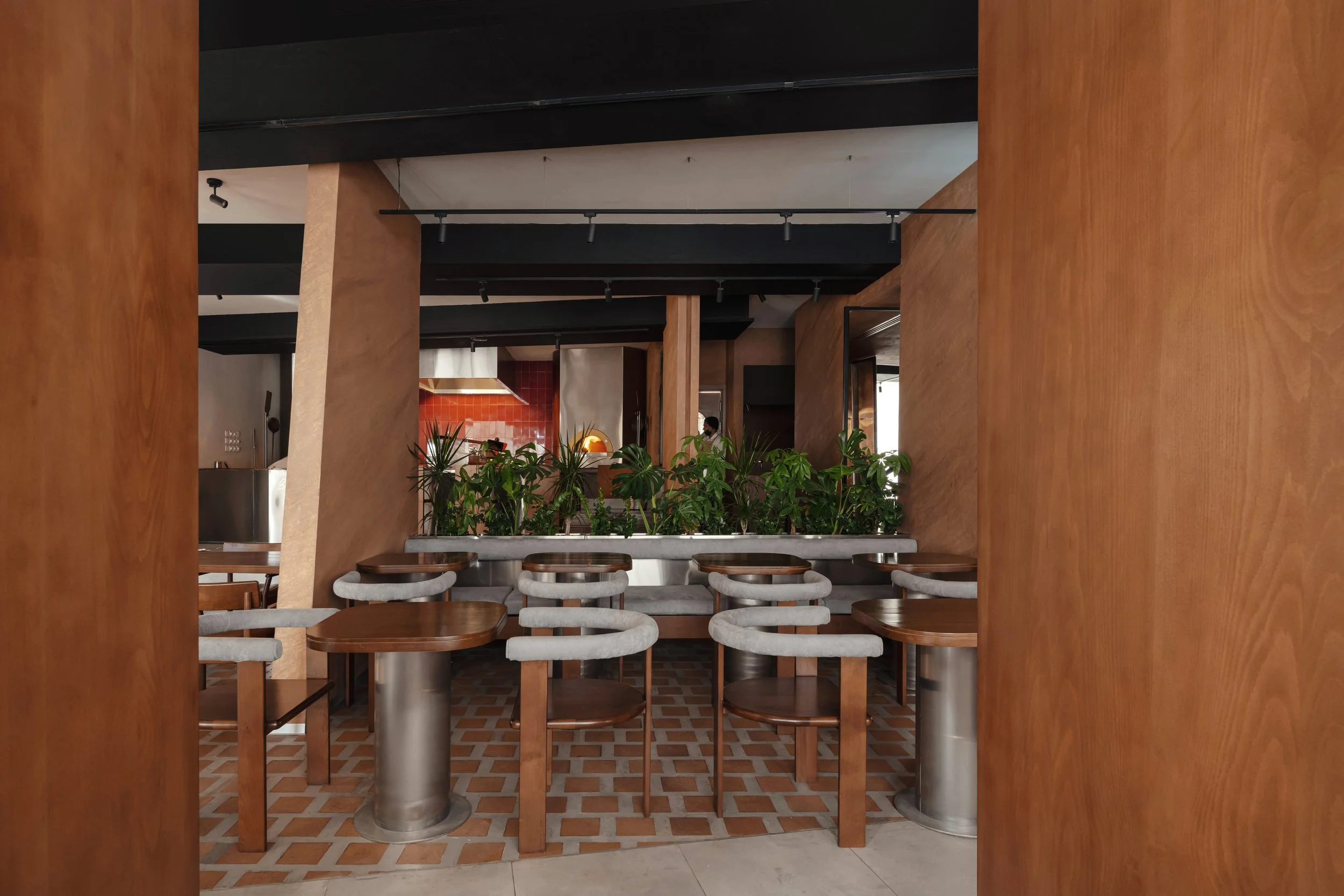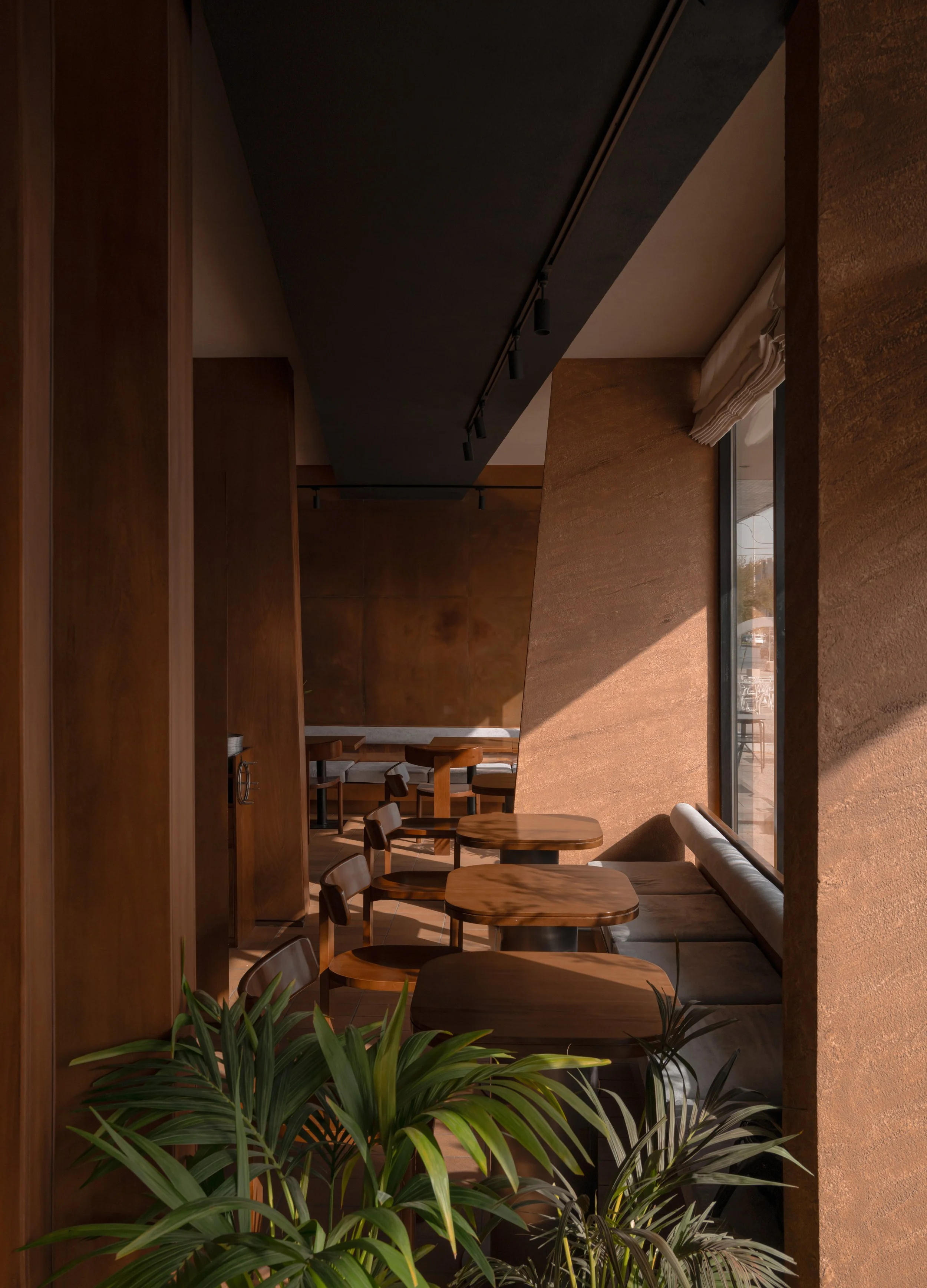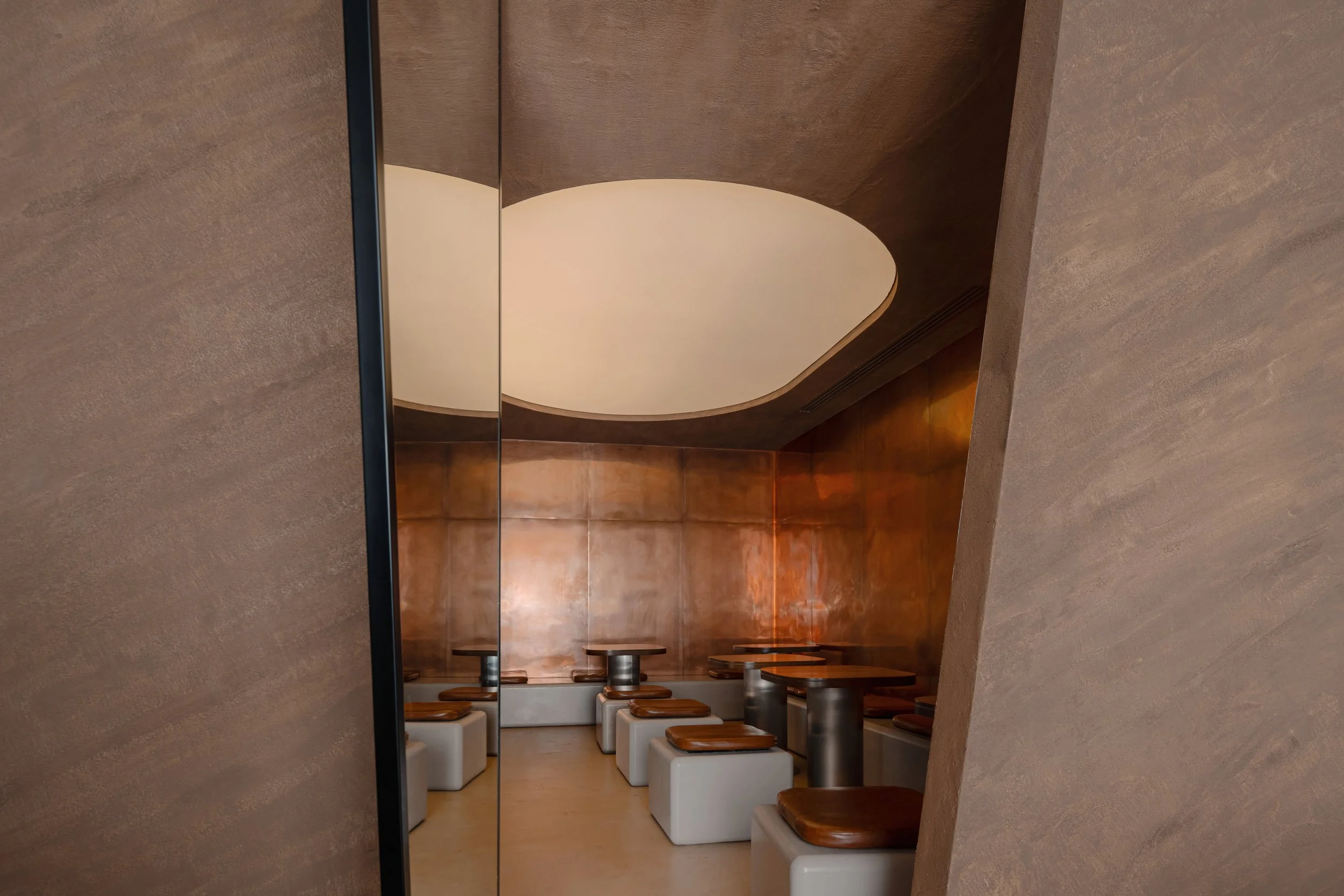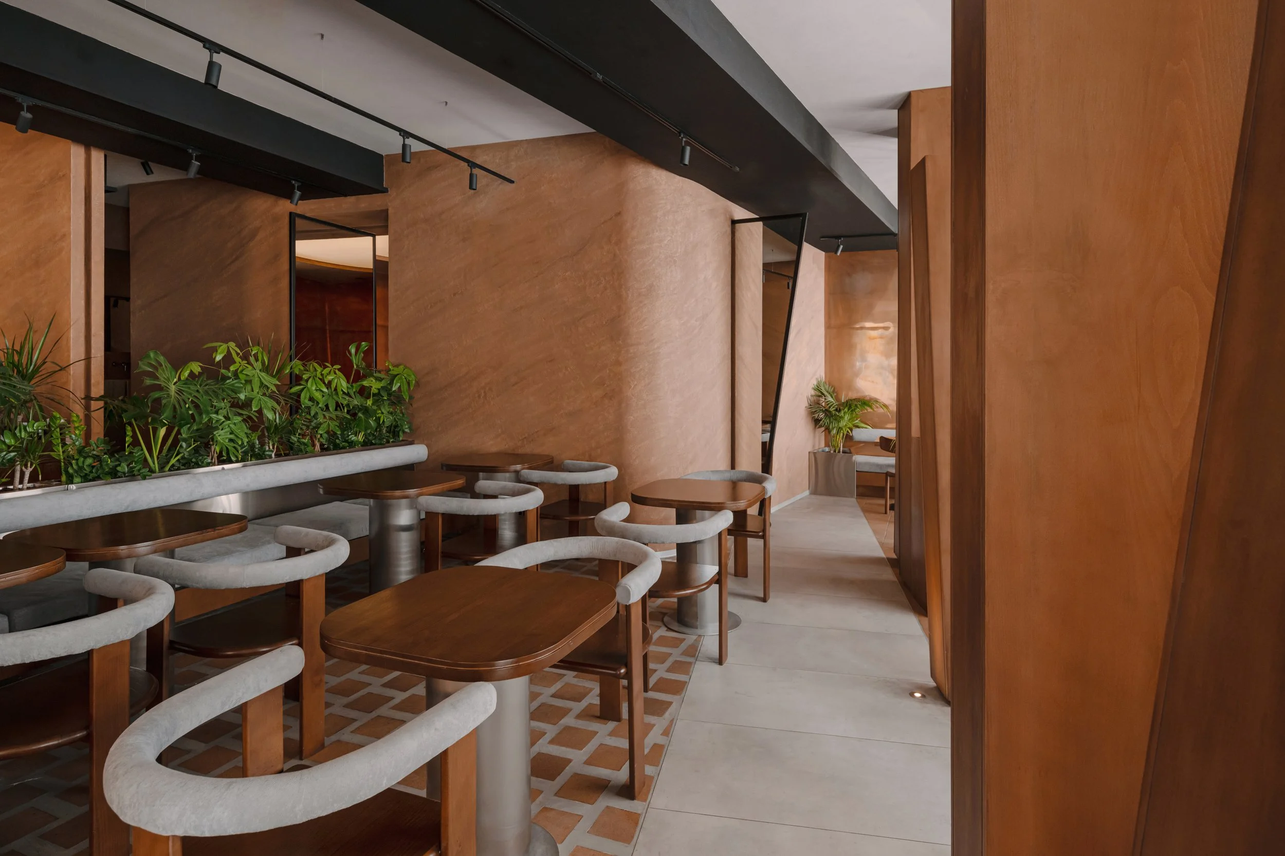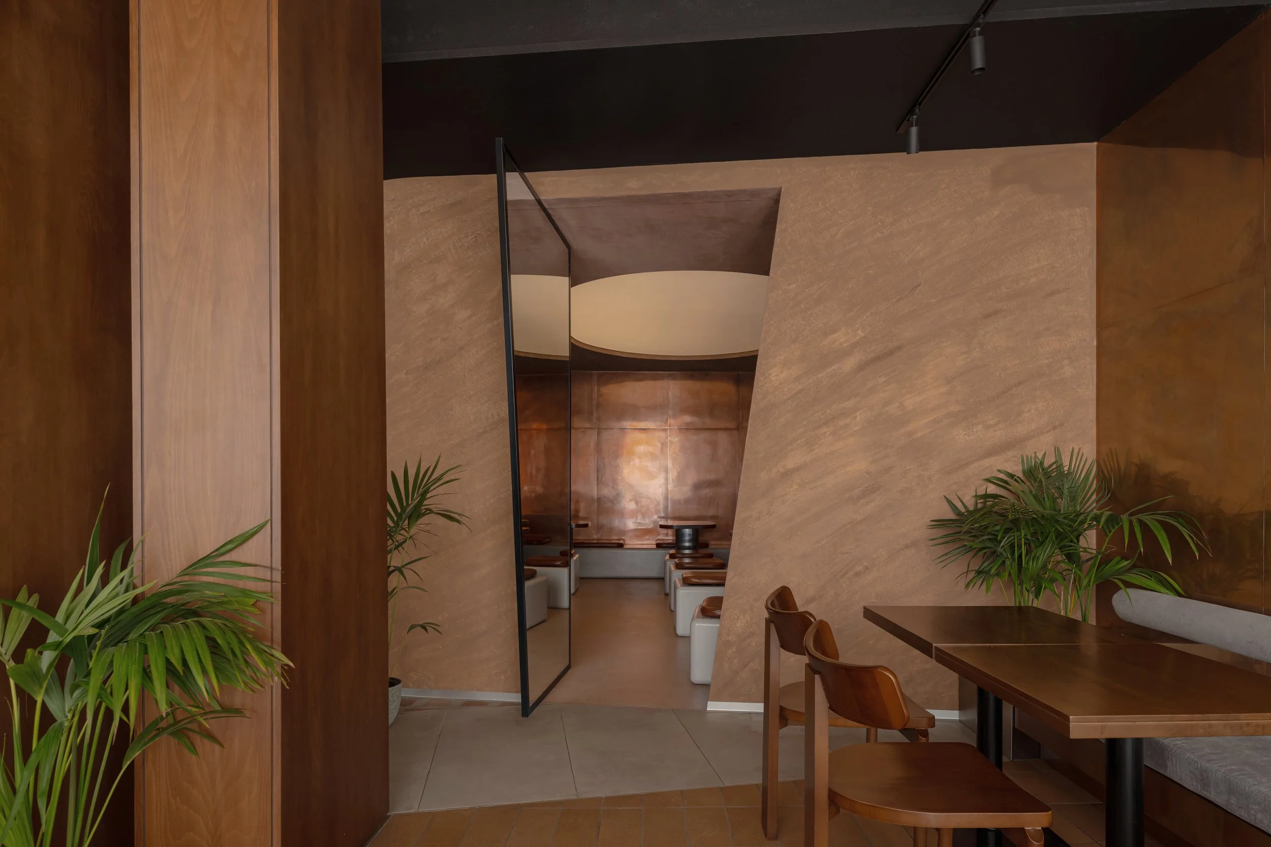 Materials play a central role in shaping identity. Textured plaster, microcement-effect porcelain flooring, and custom copper wall panels introduce refinement through surface variation and density. Wooden features anchor the plant-inspired concept, expressed through bold geometric profiles rather than figurative decoration. The combined palette creates a cohesive setting suited to the brand’s contemporary hospitality experience.