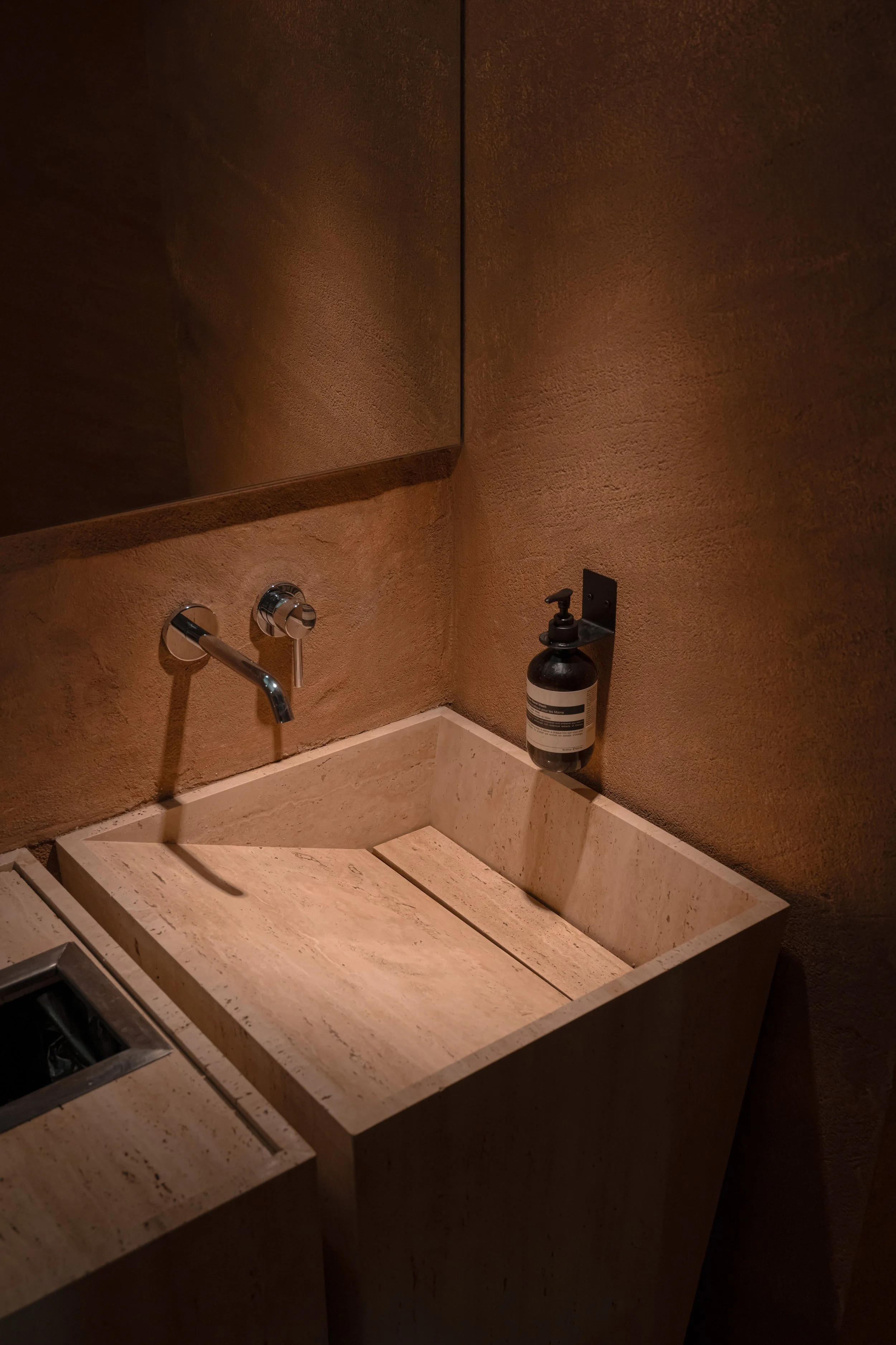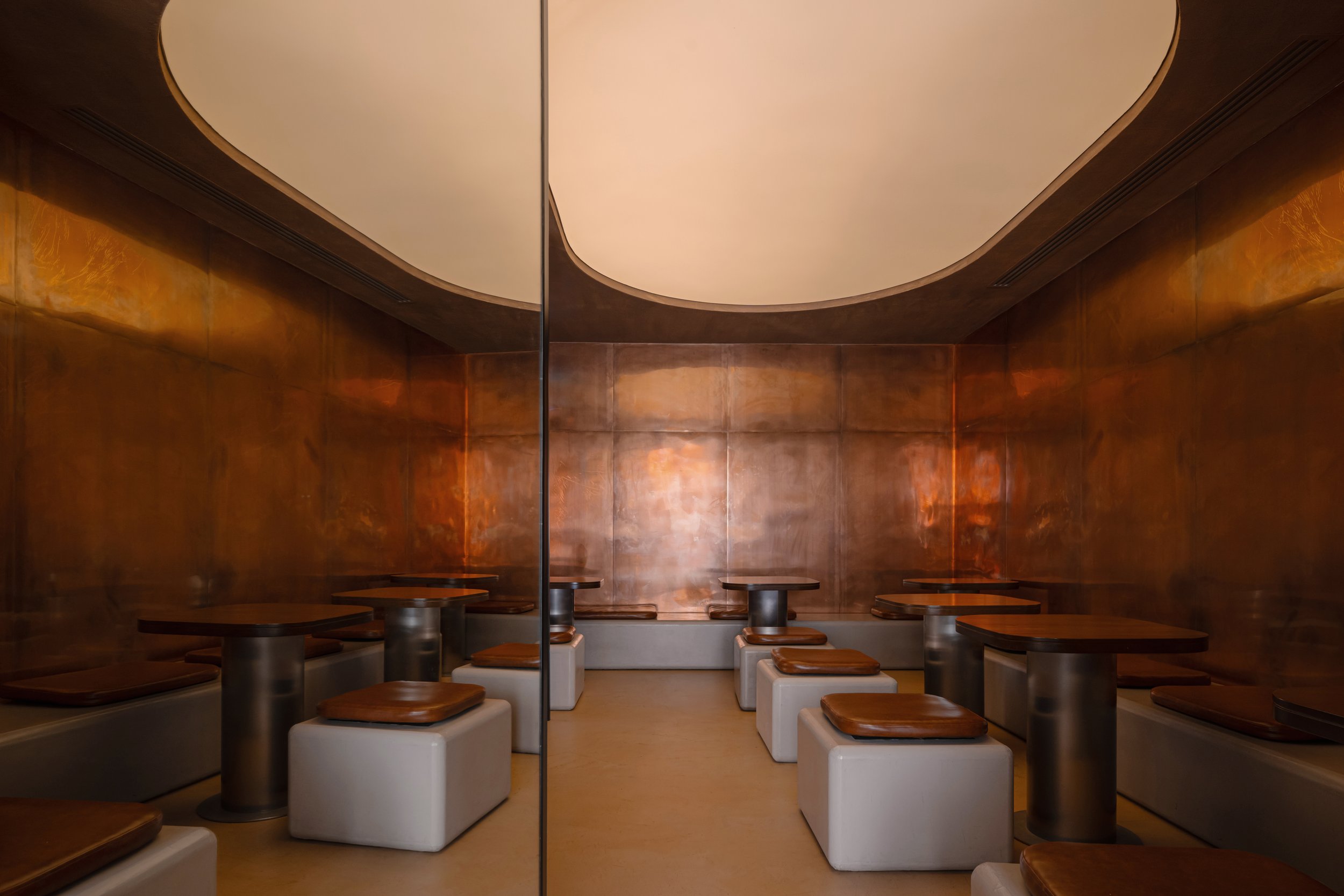 Several technical challenges required inventive solutions. The flooring, for instance, uses a single material in two applications to distinguish pathways from dining zones, providing visual guidance without introducing competing finishes. Mechanical systems are concealed within ceiling boxes, ensuring an uncluttered overhead plane that supports the warm, enveloping atmosphere. Attention to detailing extended to elements rarely encountered in regional construction, such as slim sink traps, specially developed copper panel mountings, and custom methods for anchoring functional components.