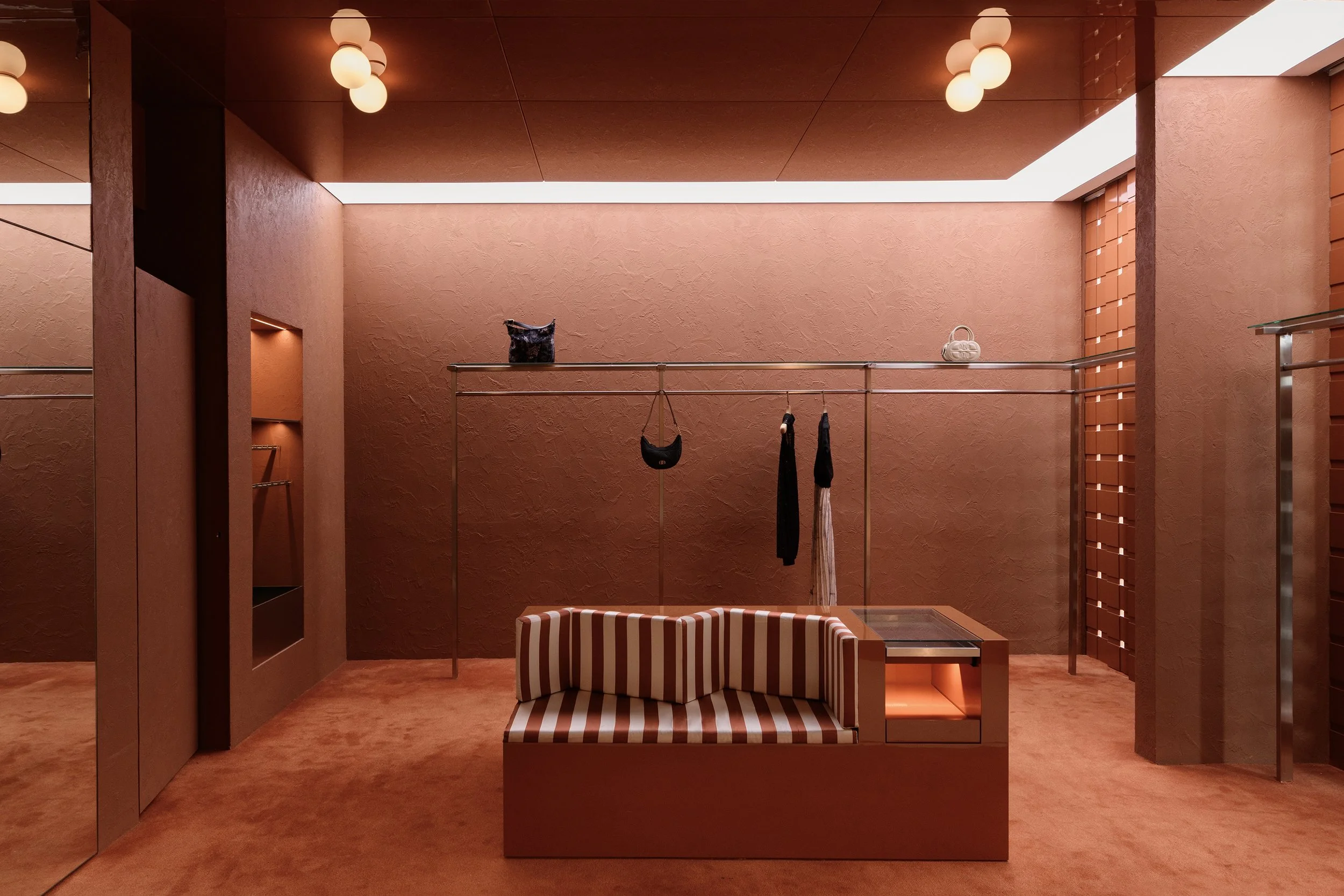 Within, the flooring sets a measured tempo through a two-tone palette, grounding the interior while introducing gentle variation. Neutral walls and restrained finishes form a canvas for accentuated interventions. At the heart of these is a dedicated alcove adjacent to the fitting rooms: wrapped in saturated orange-red tones, with a reflective ceiling and bold striped seating, the intimate retreat contrasts with the otherwise muted palette, infusing warmth and unexpected character.
