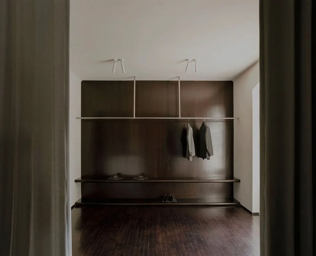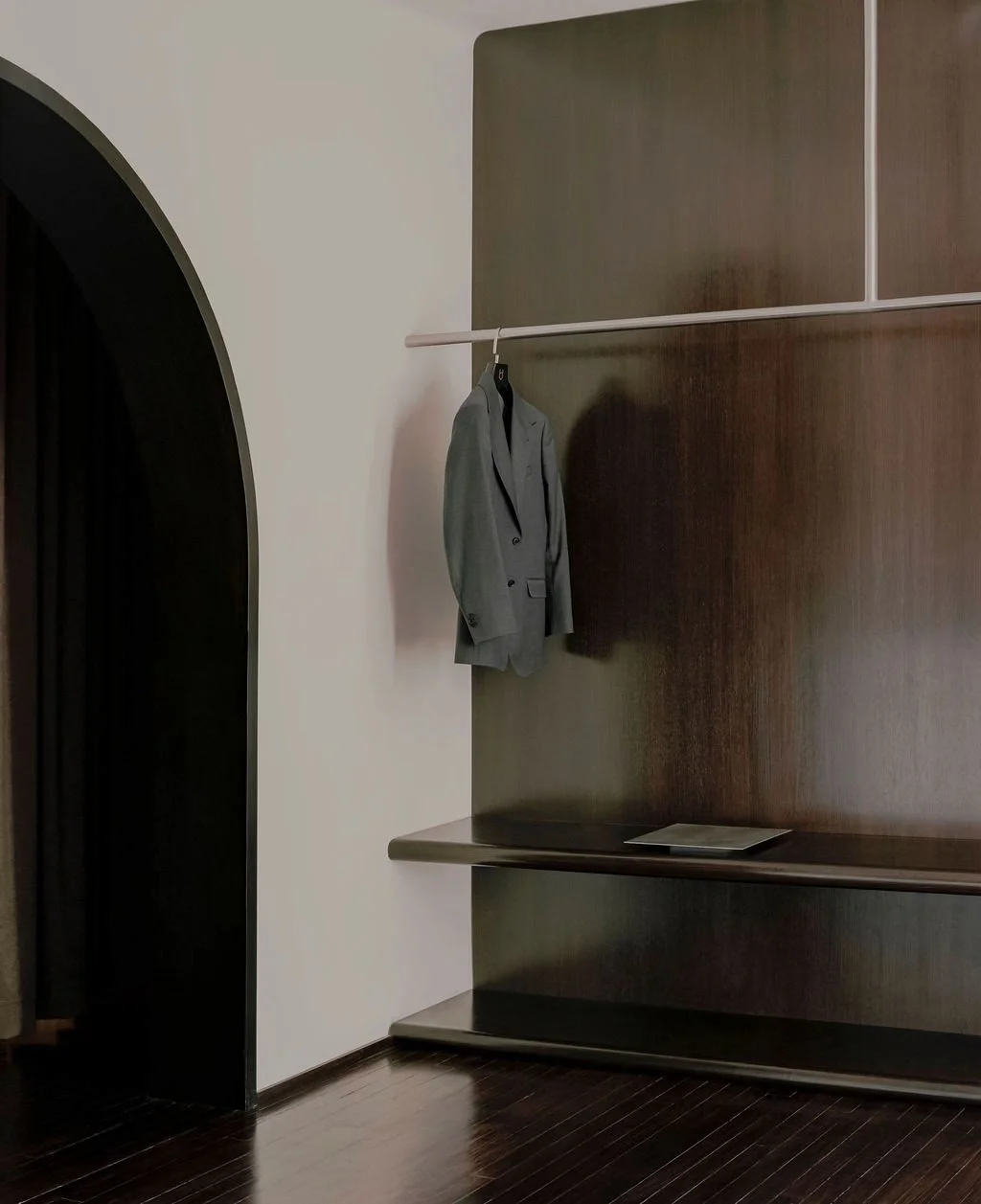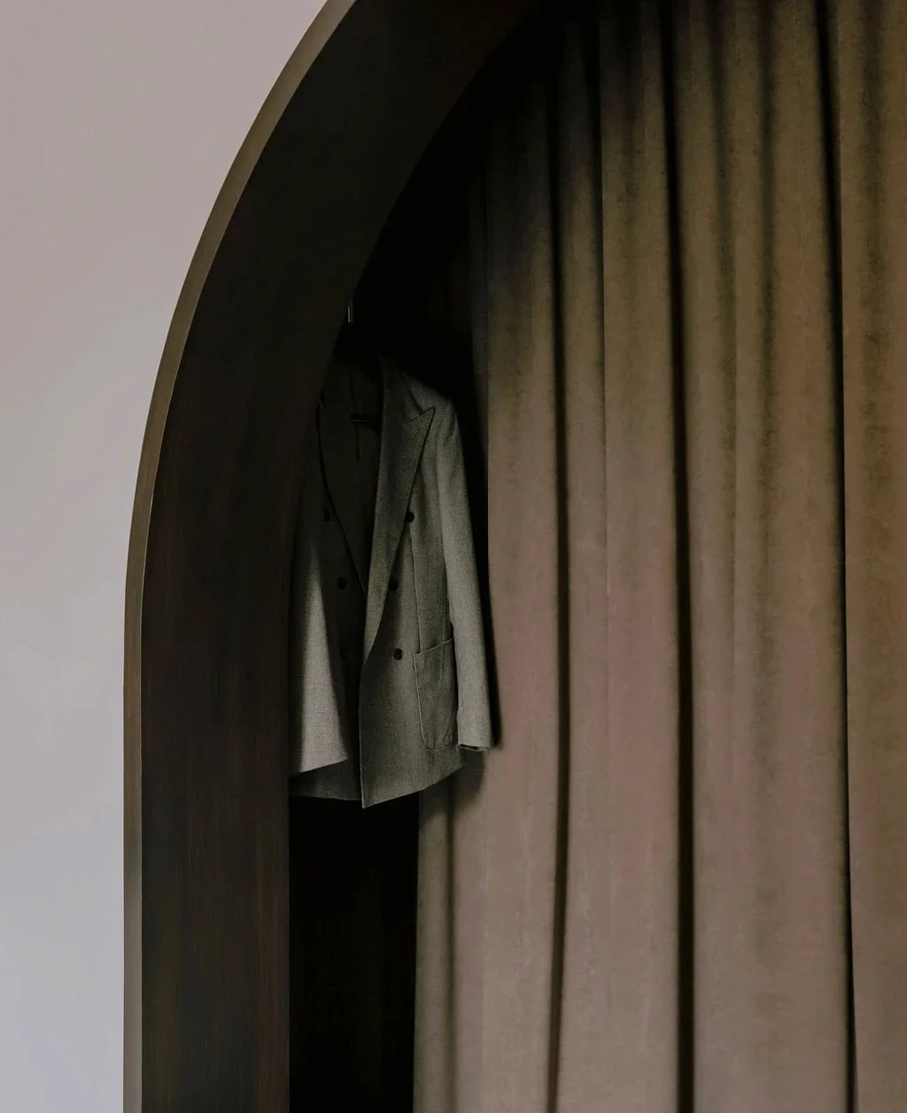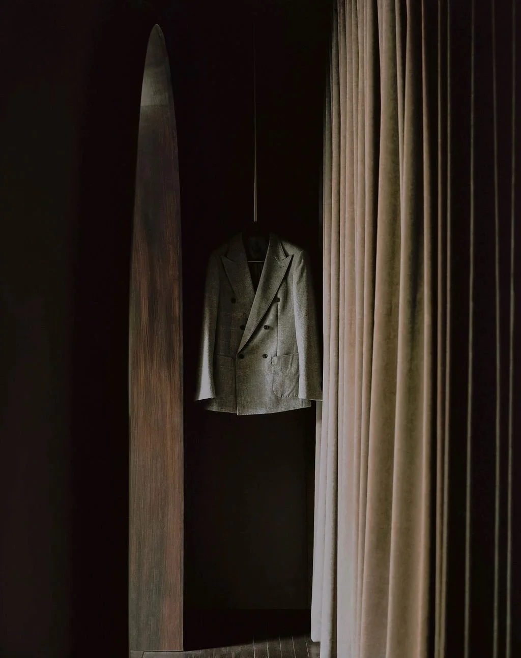 The material palette creates immediate impact. Dark wood clads both floors and walls, grounding the boutique in the visual language of traditional tailoring. Display furniture is seamlessly integrated into this timber framework, echoing the formality of classic menswear ateliers. These substantial elements are offset by softer gestures – sheer curtains and fine stainless steel detailing offer a lighter, more fluid counterpoint that hints at the brand’s contemporary spirit.