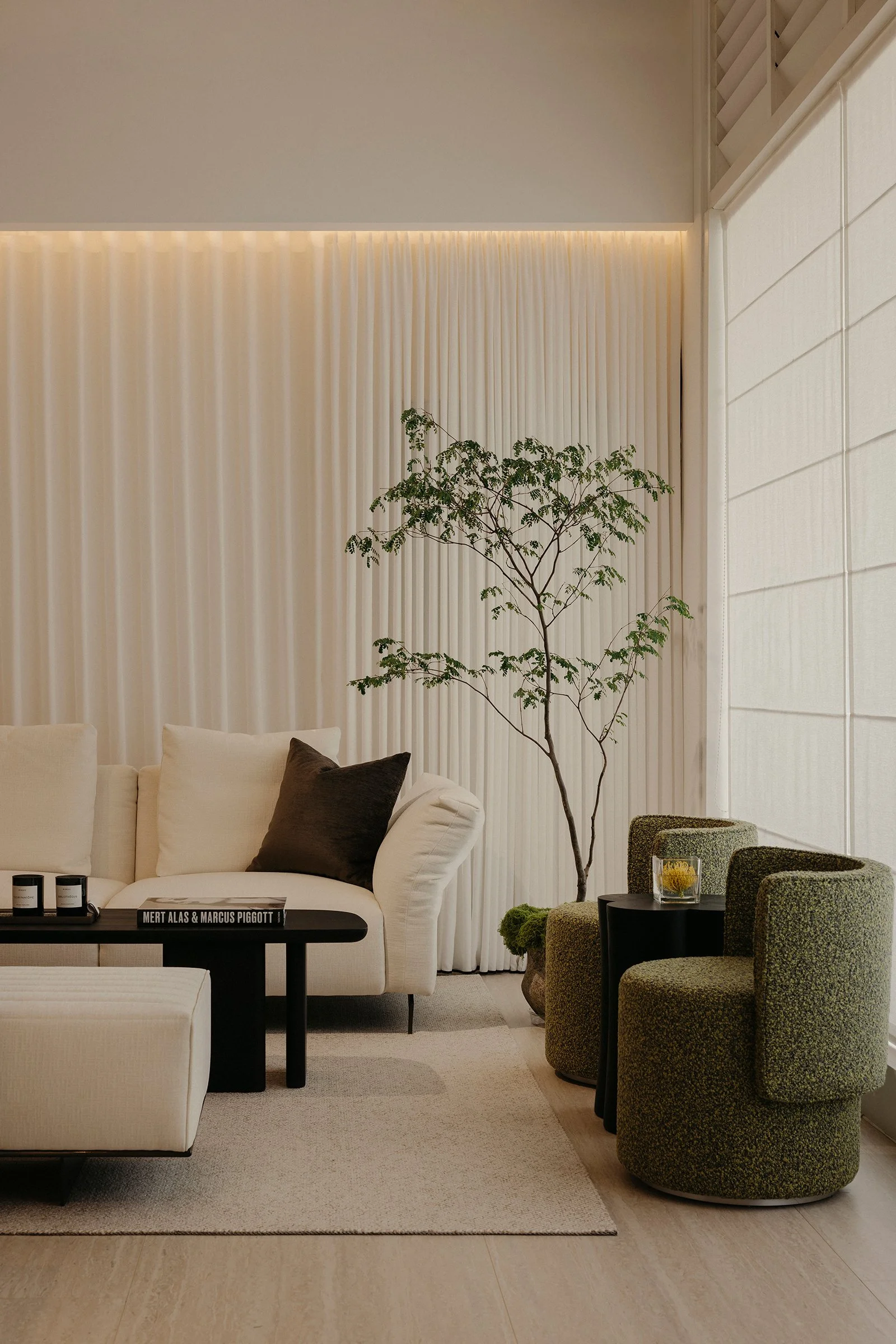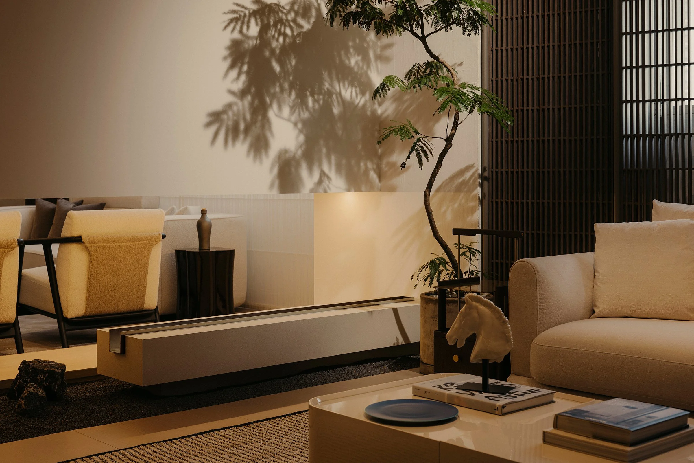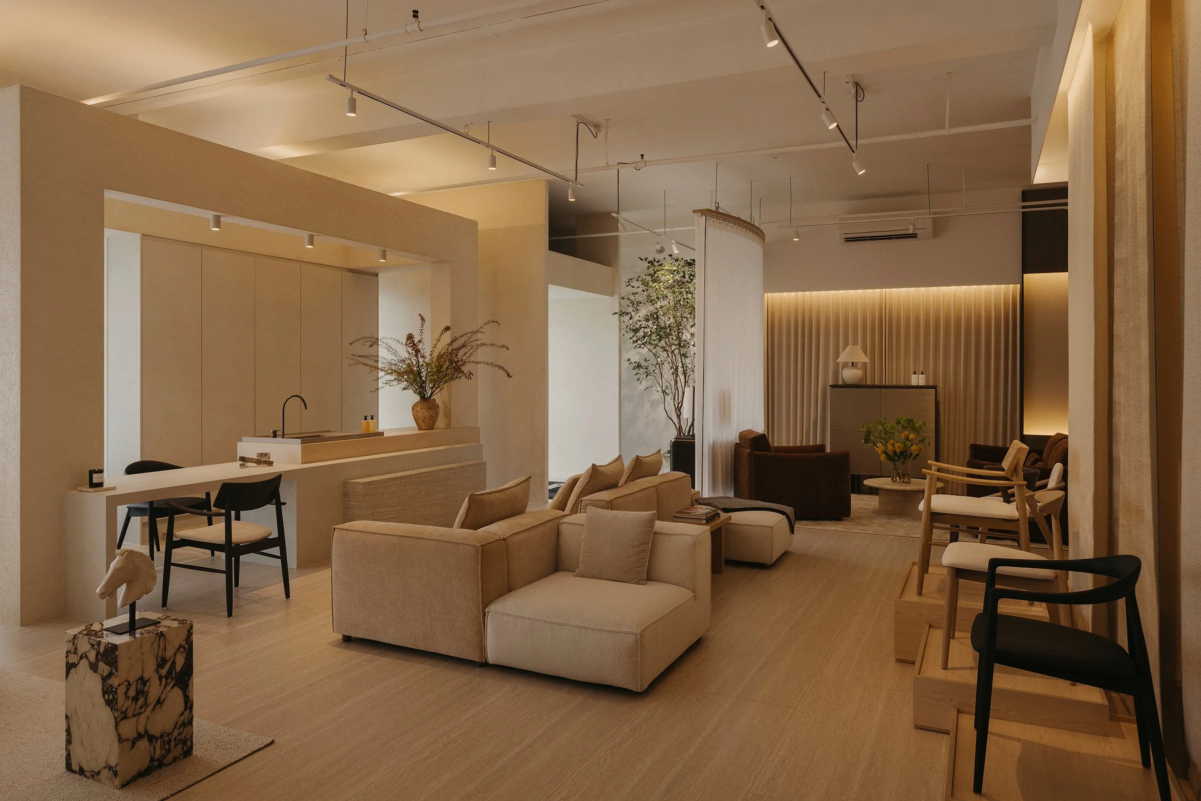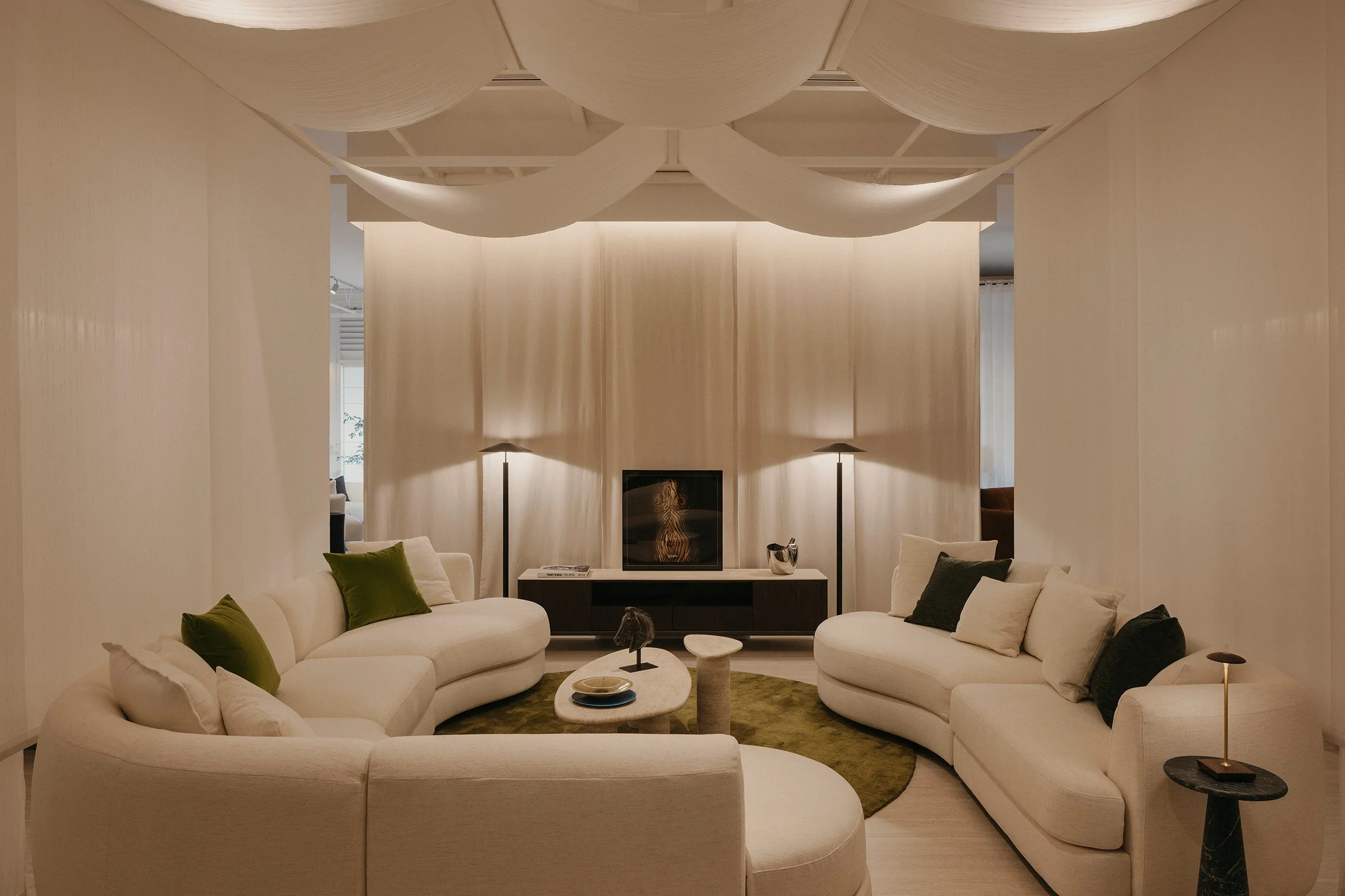 Entry begins with a tunnelled approach that compresses the threshold and heightens a sense of arrival. Just inside, an integrated café establishes immediate ease, grounding the first encounter in comfort and familiarity. Facing it, a chair gallery reads as a podium-like stage, setting a focal point for the showroom and giving the act of browsing a quiet sense of ceremony. From here, a sequence of settings progresses through conversation nooks, lounging rooms, and living–dining compositions that demonstrate the furniture in context, allowing each piece to be read through use, scale, and proximity.