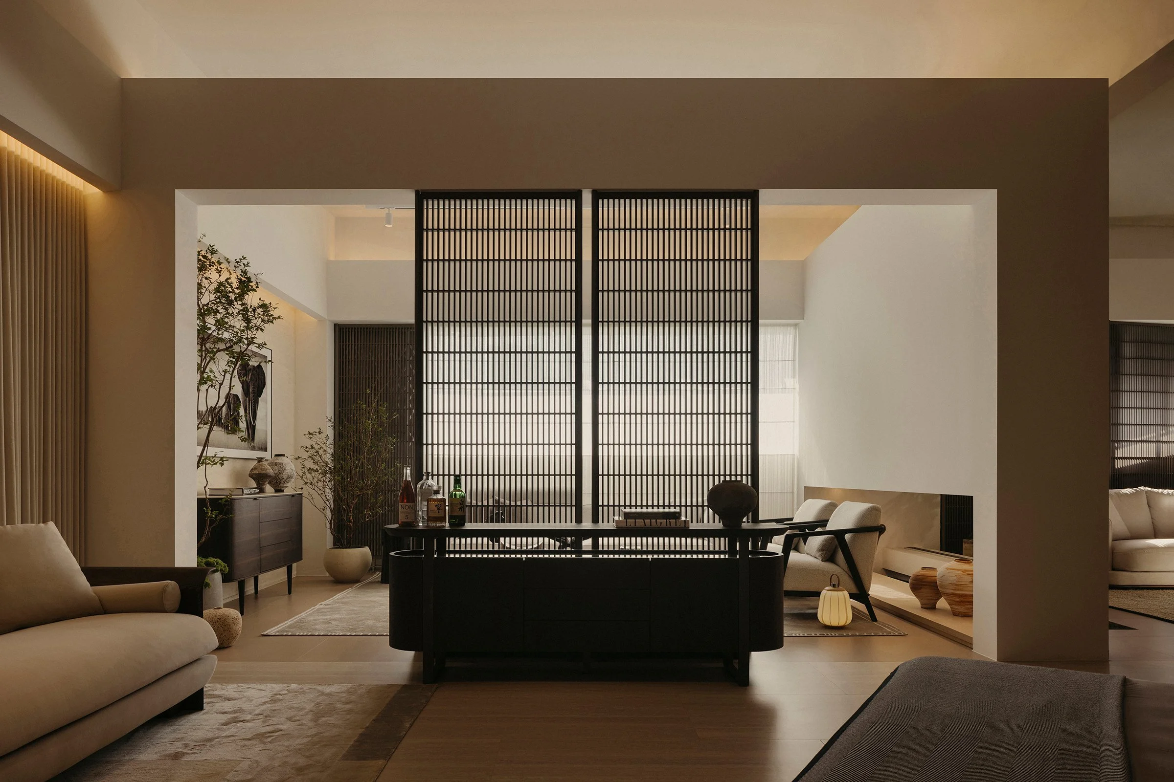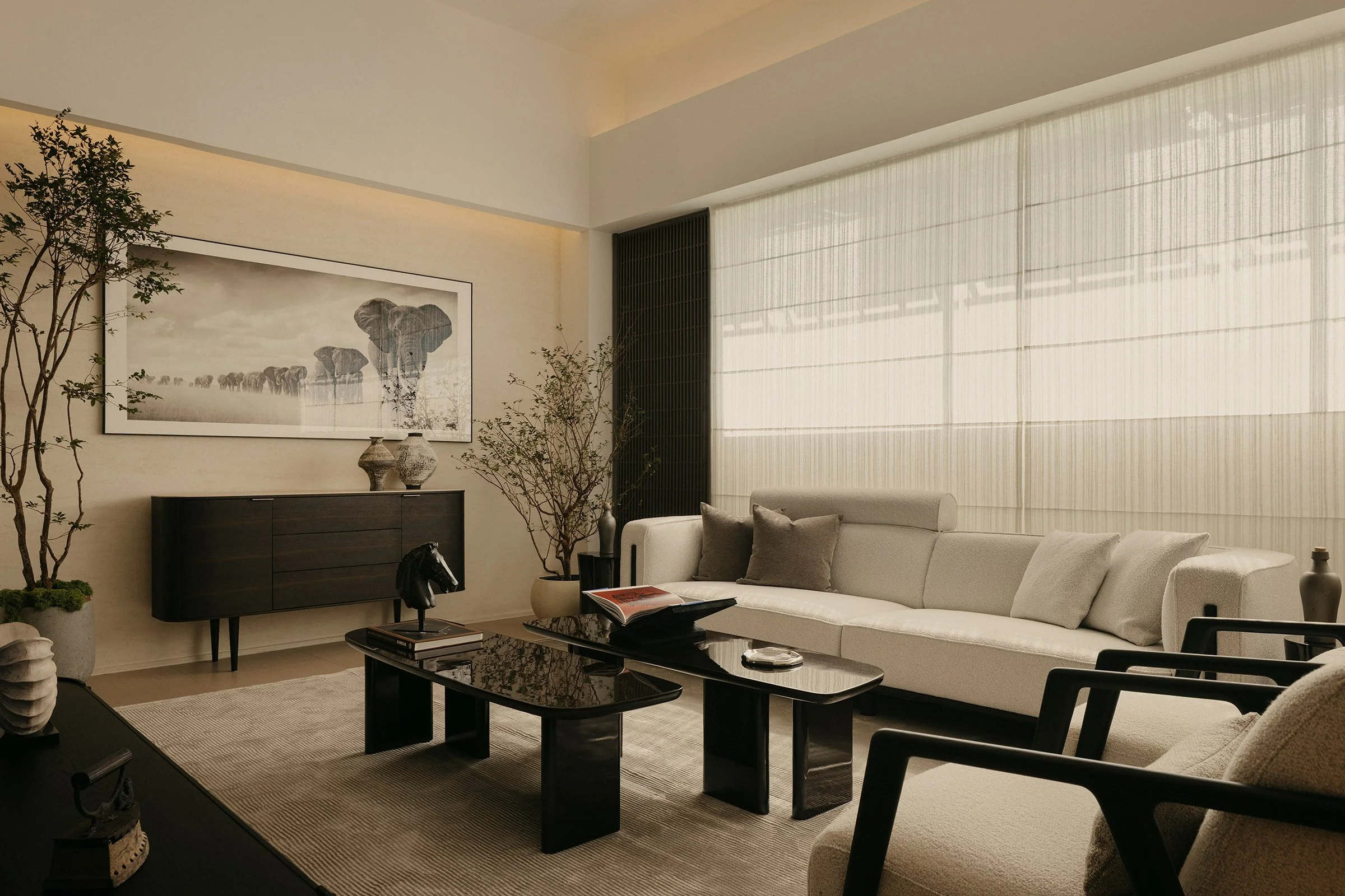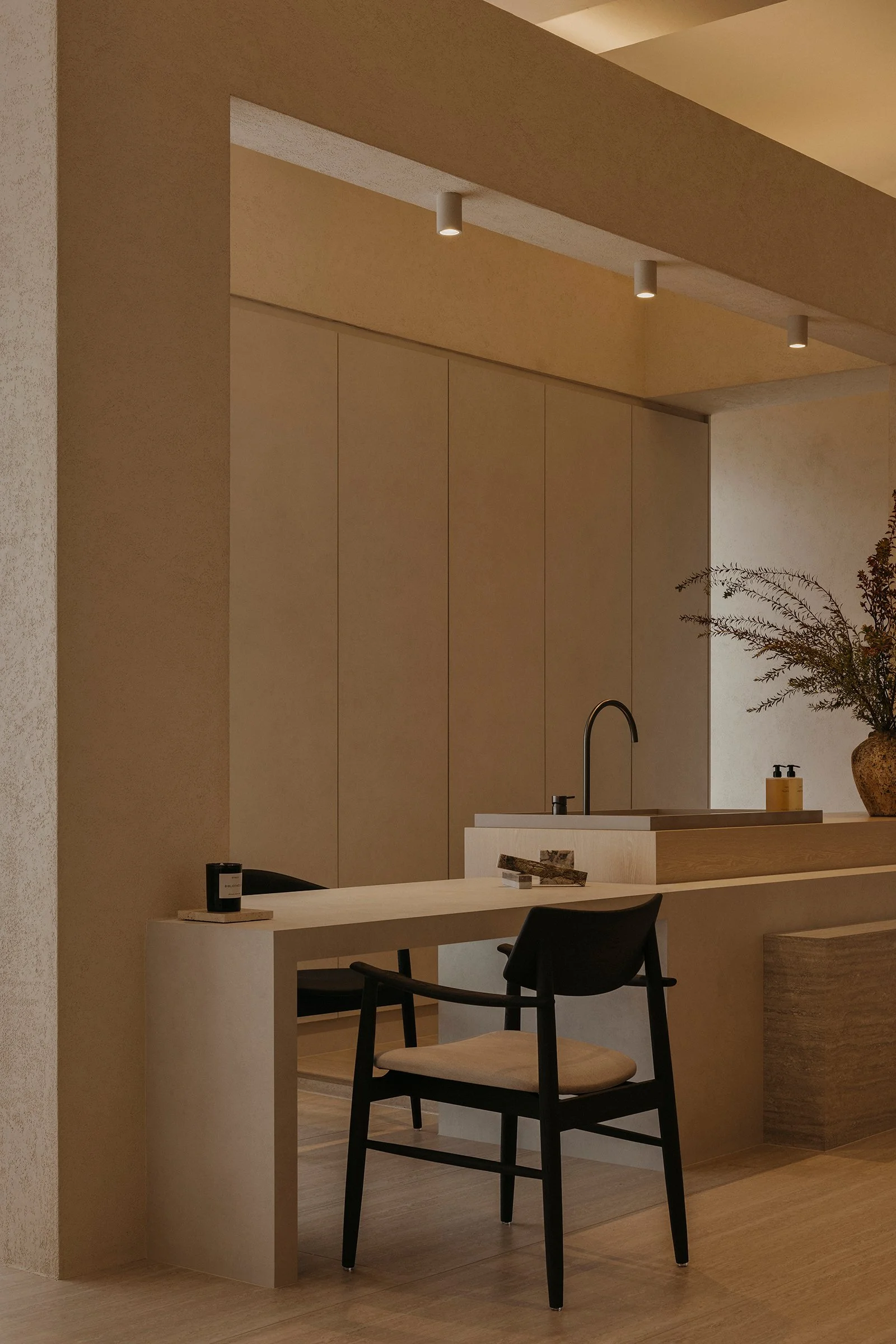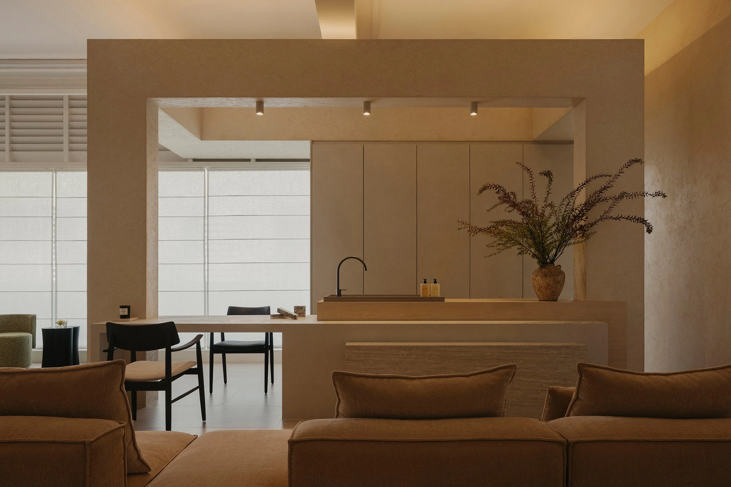 Entry begins with a tunnelled approach that compresses the threshold and heightens a sense of arrival. Just inside, an integrated café establishes immediate ease, grounding the first encounter in comfort and familiarity. Facing it, a chair gallery reads as a podium-like stage, setting a focal point for the showroom and giving the act of browsing a quiet sense of ceremony. From here, a sequence of settings progresses through conversation nooks, lounging rooms, and living–dining compositions that demonstrate the furniture in context, allowing each piece to be read through use, scale, and proximity.