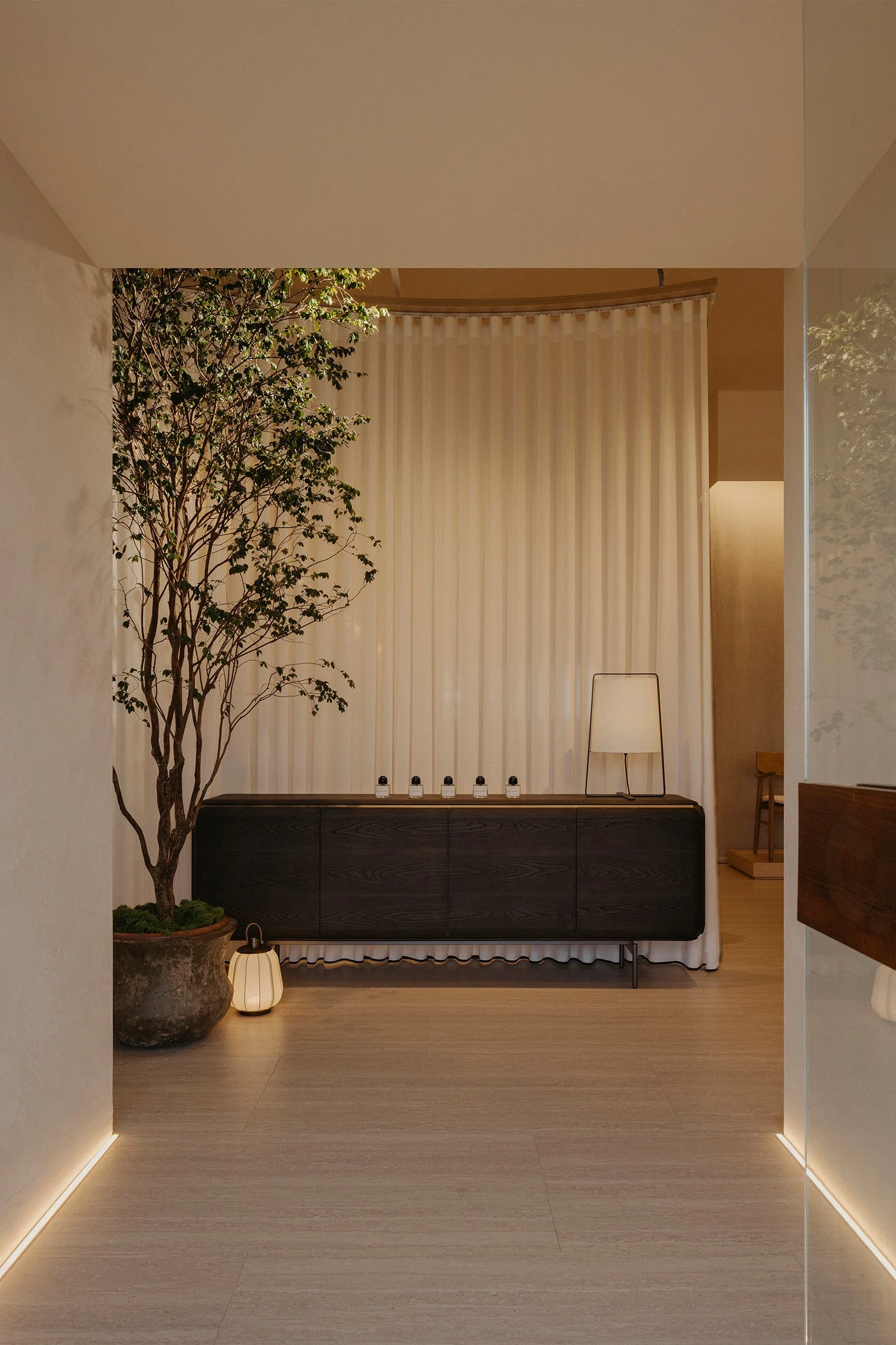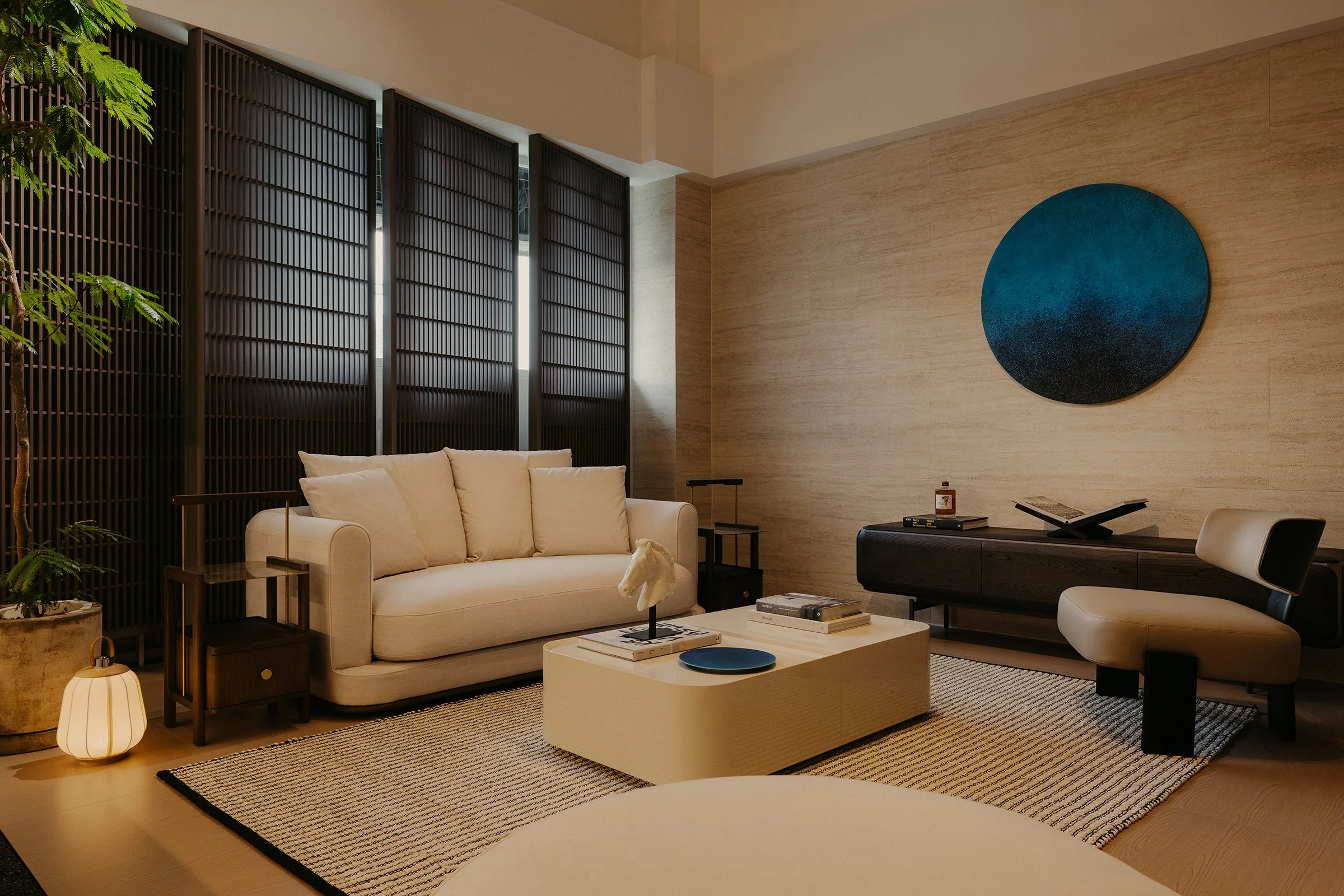 At the rear, an open pavilion anchors the layout as a calm high point. Natural light pours into this zone, creating a meditative setting where the furniture can be encountered in its most distilled presence. A sense of retreat emerges within the expansive footprint, balancing volume with stillness and giving the showroom a measured, restorative quality.