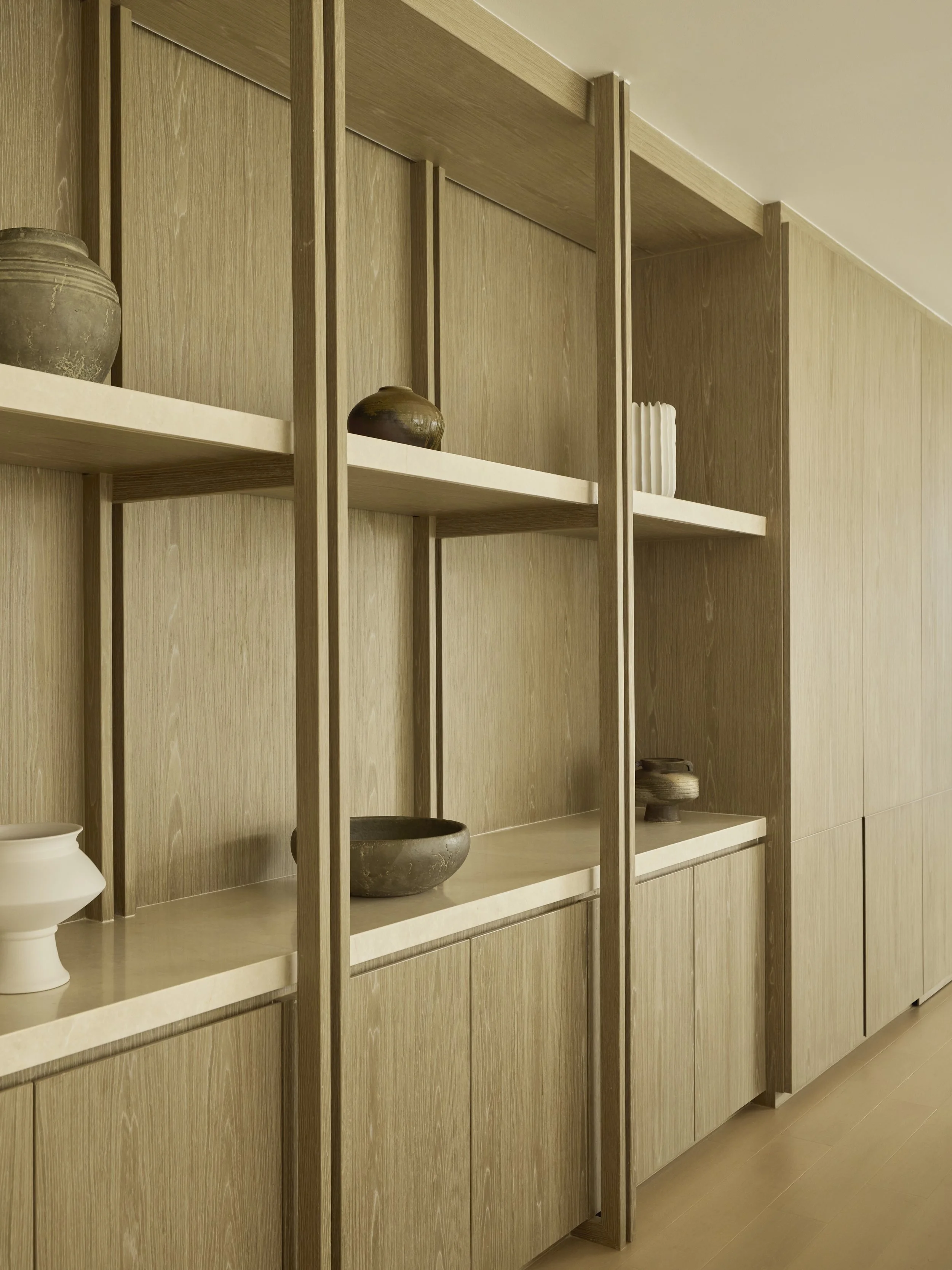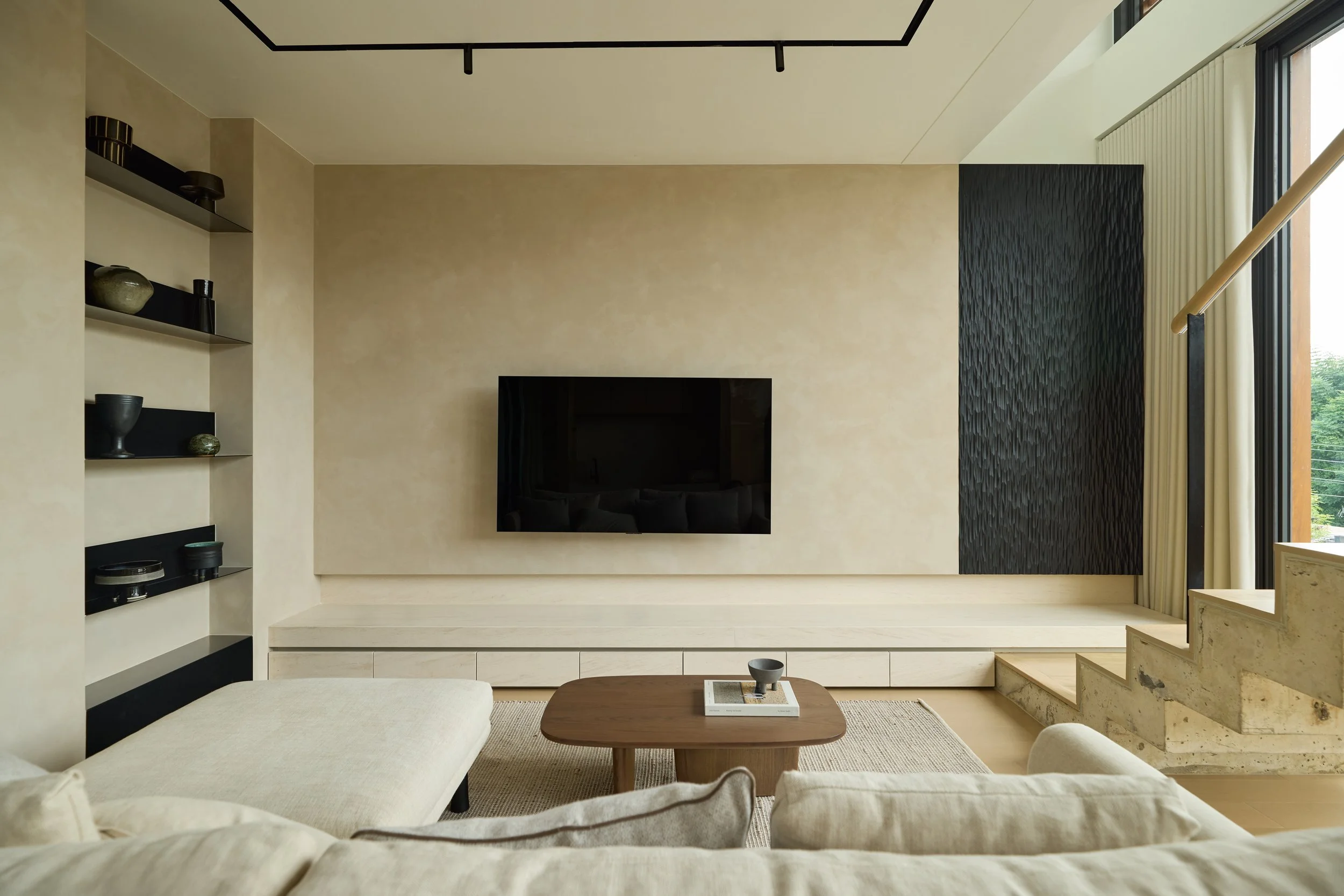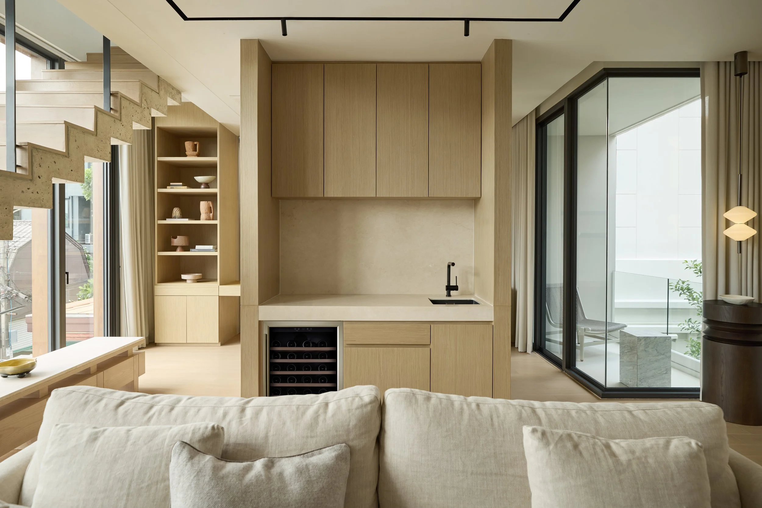 The interiors further articulate this duality of shared and individual. The front suite leans toward a minimal and modern aesthetic, while the rear suite embraces more classical motifs. Between them, the common areas mediate these differing preferences, blending elements of both into a balanced transitional style. Natural materials and muted finishes provide coherence across the home, grounding the varying expressions within a consistent architectural language.