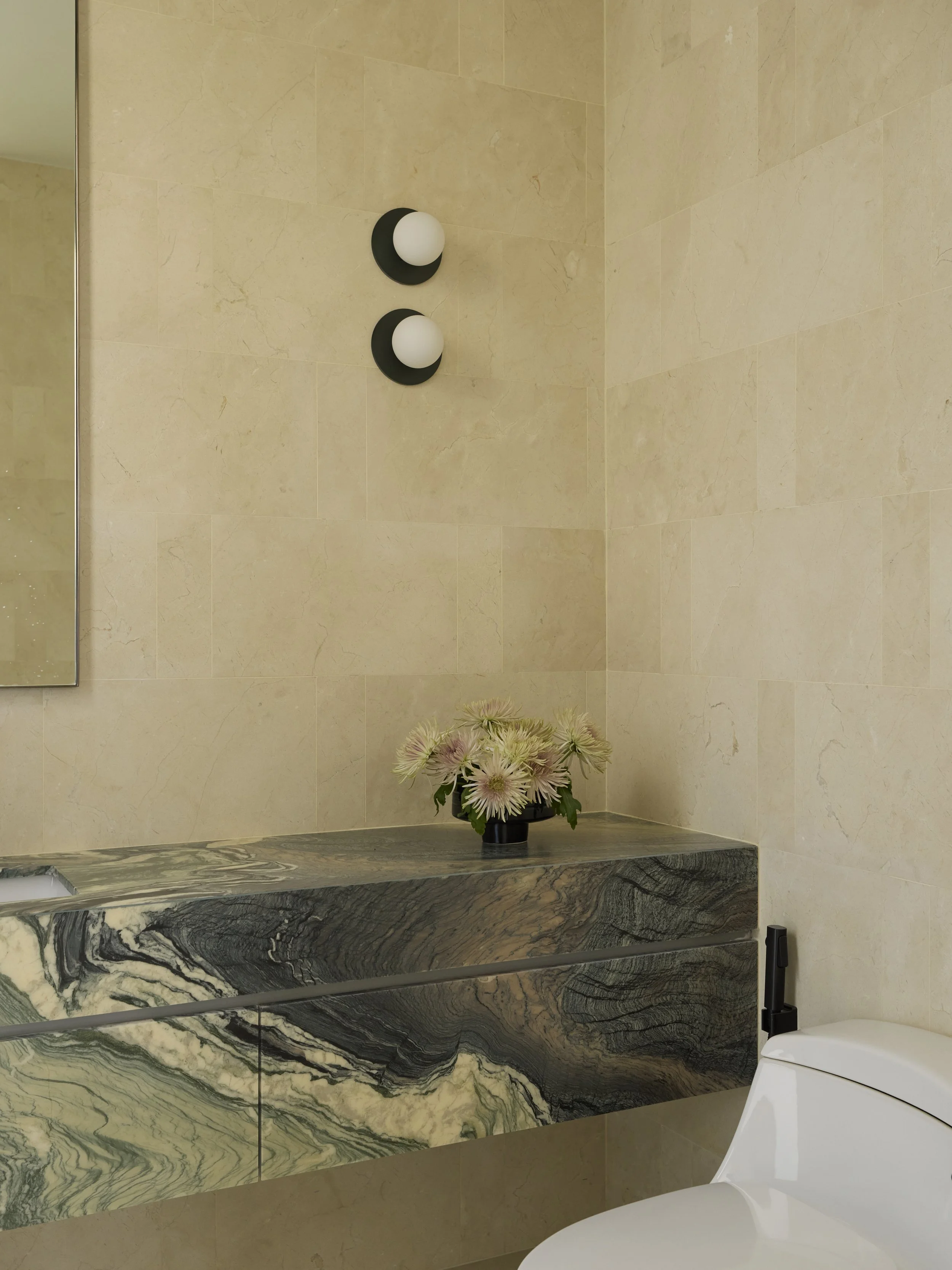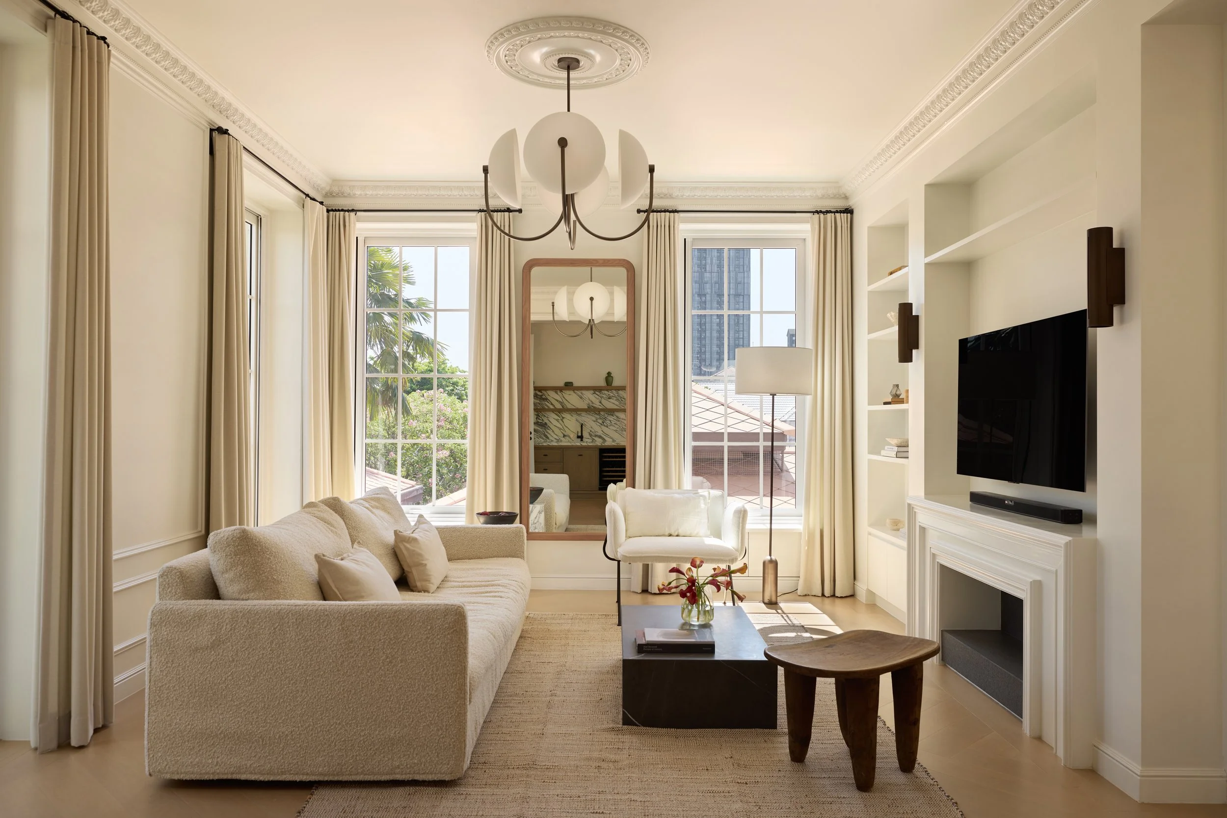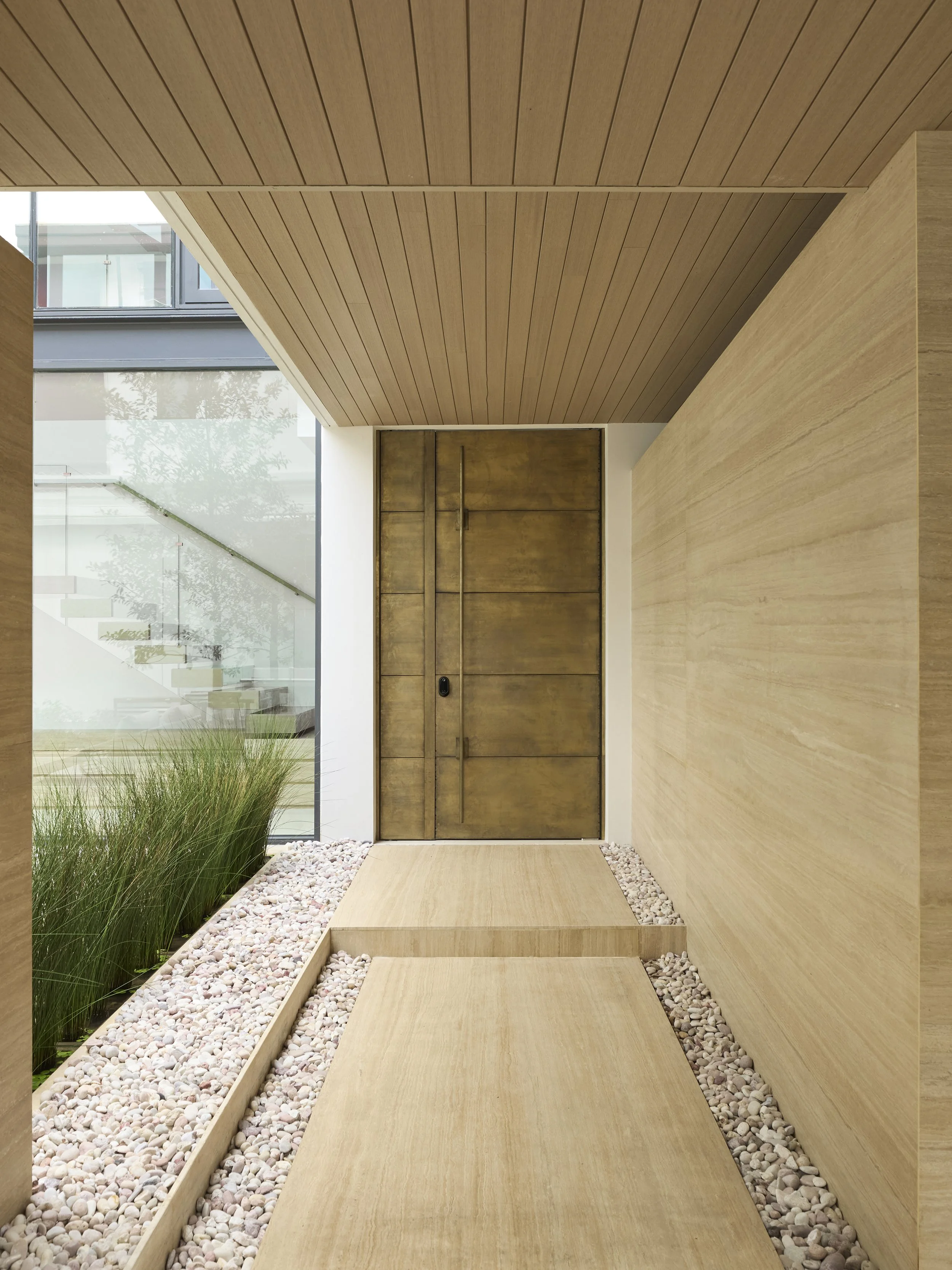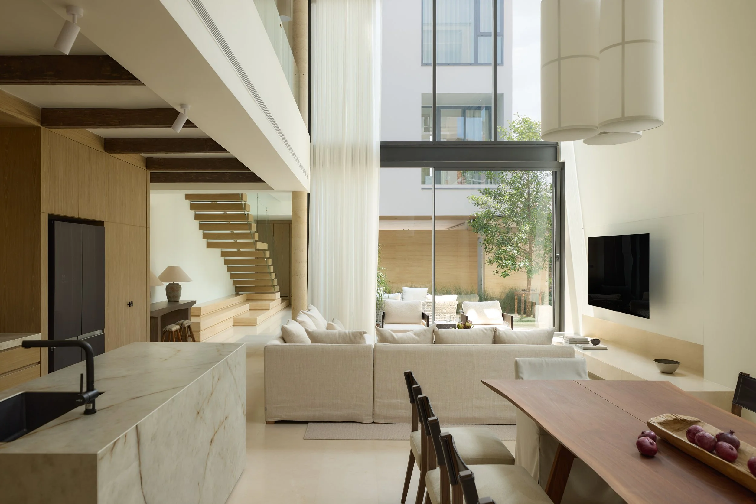 The interiors further articulate this duality of shared and individual. The front suite leans toward a minimal and modern aesthetic, while the rear suite embraces more classical motifs. Between them, the common areas mediate these differing preferences, blending elements of both into a balanced transitional style. Natural materials and muted finishes provide coherence across the home, grounding the varying expressions within a consistent architectural language.