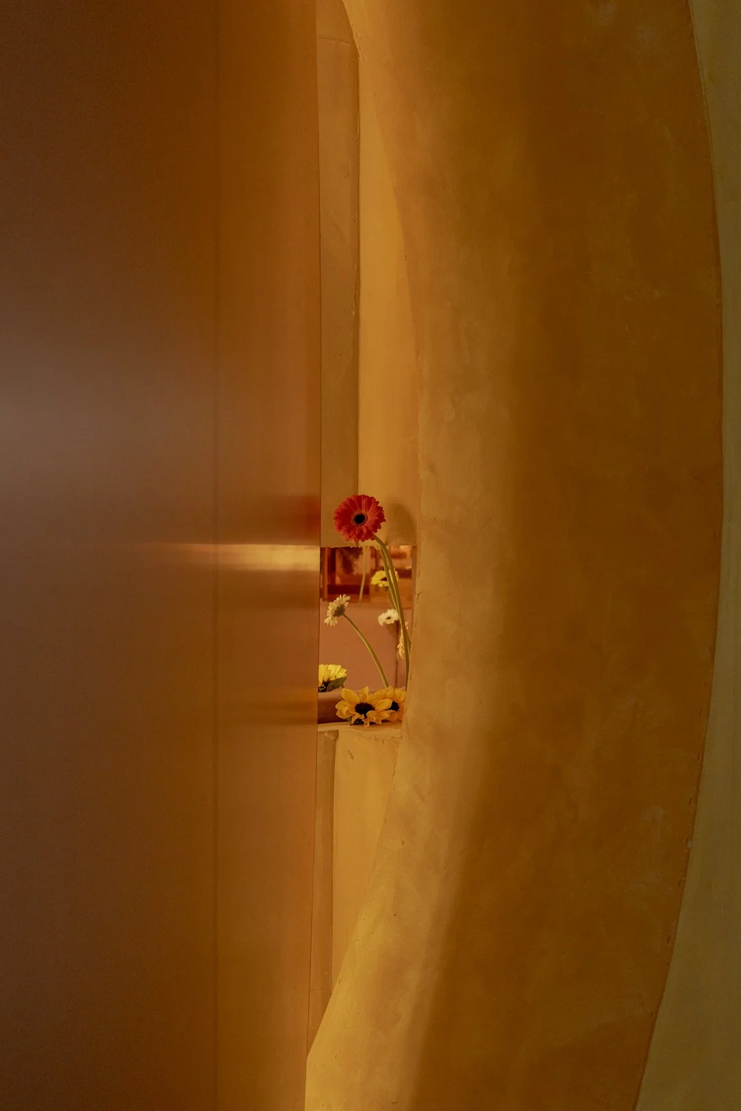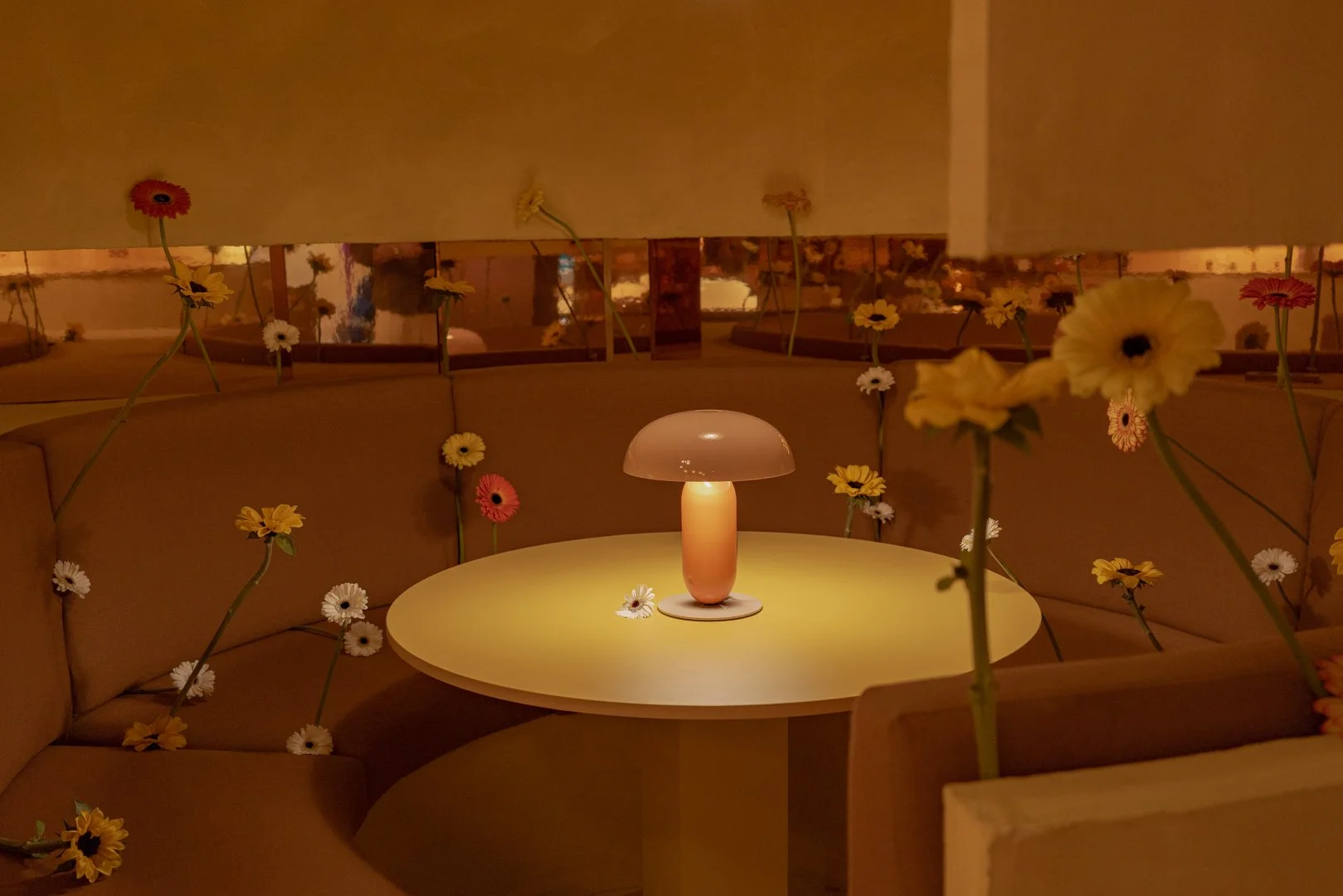 An artistic installation by interior landscaper Charo Benitez, developed in collaboration with Alejandro Cateto, introduces a living layer to the space. Using vegetation including gerberas and sunflowers, the installation points to abandoned leisure structures along the coast and the ways nature moves in when buildings lose their original purpose. It adds a quieter counterpoint to the project’s formal clarity, bringing questions of decay, preservation, and reuse into the club environment.