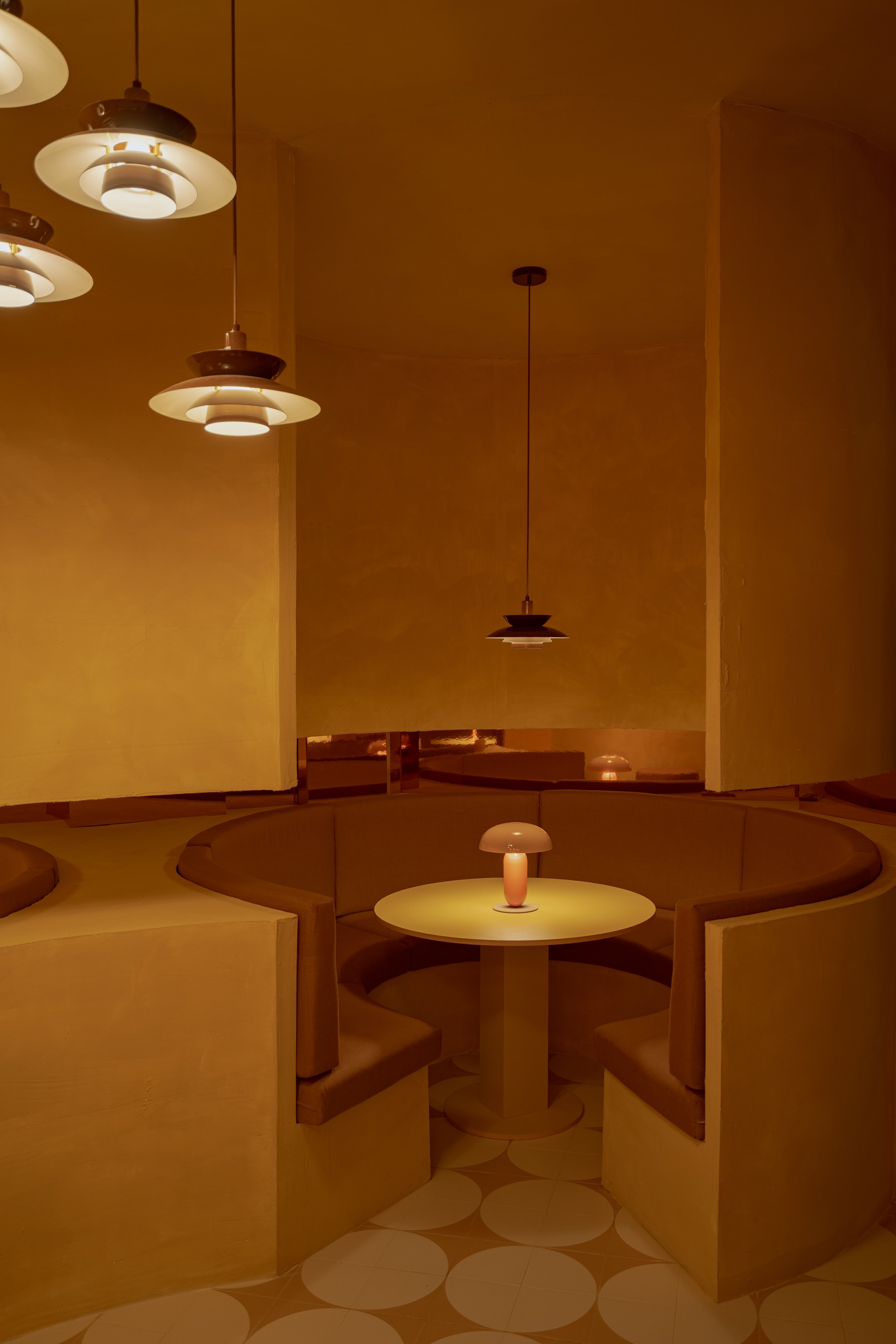 A single geometry anchors the entire concept: the cylinder. More than a motif, it operates as a structural logic that scales up and down across the interior. Cylindrical voids shape seating areas, solid volumes form the bar and stools, and circular patterning is carried into the ceramic floor. The same language appears at thresholds and in the curvature of architectural details, building continuity across the space through repeated, carefully calibrated forms.