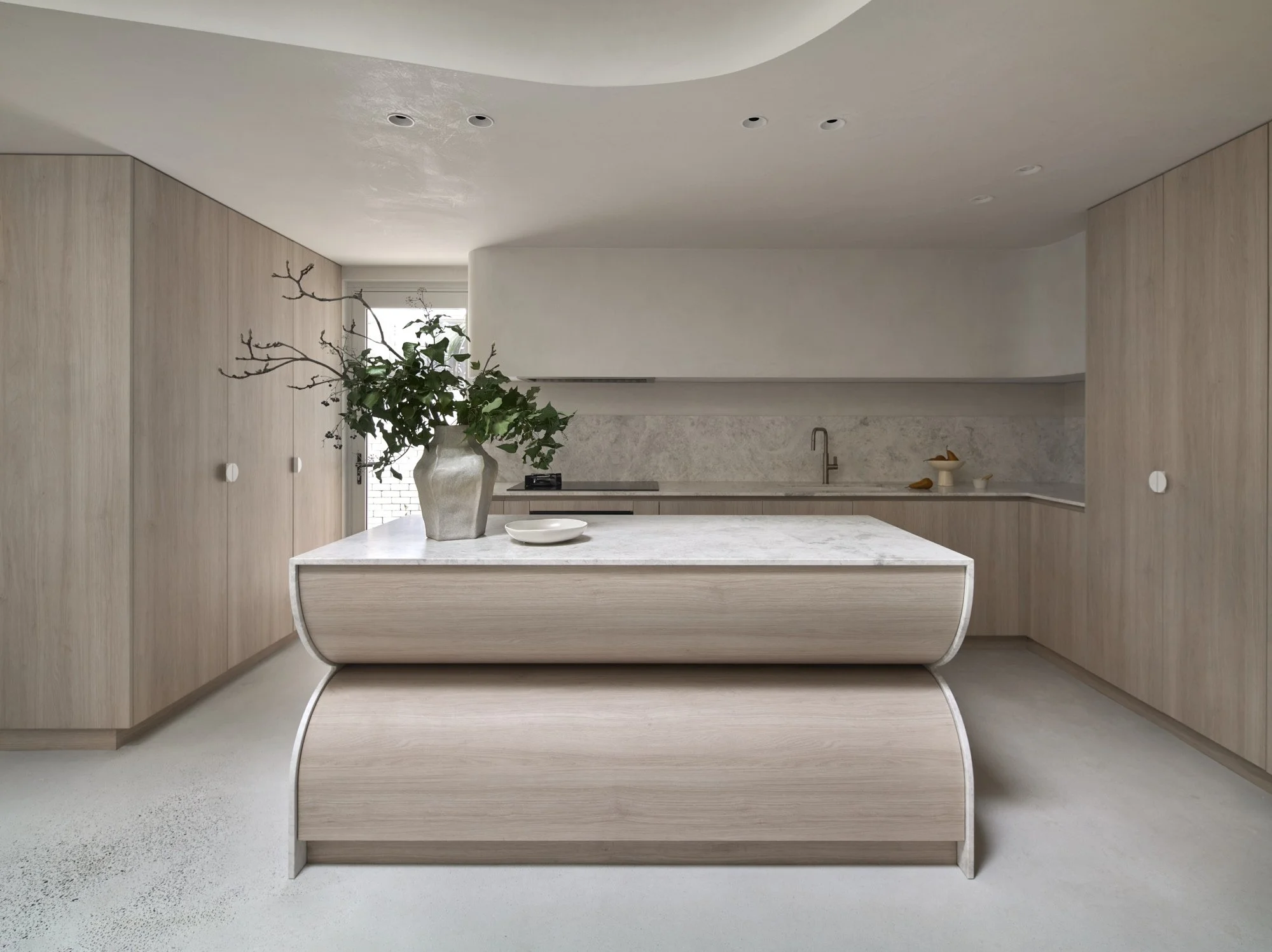 The use of curvaceous forms is integral to the project’s identity. Externally, these gestures respond directly to the site’s truncations and setbacks, resolving constraints with a sculptural elegance. Internally, the same language frames views, enhances the flow of natural light, and shapes a serene domestic environment. The gentle curvature also mediates the boundary between interior and exterior, giving the home a cohesive spatial and visual character.