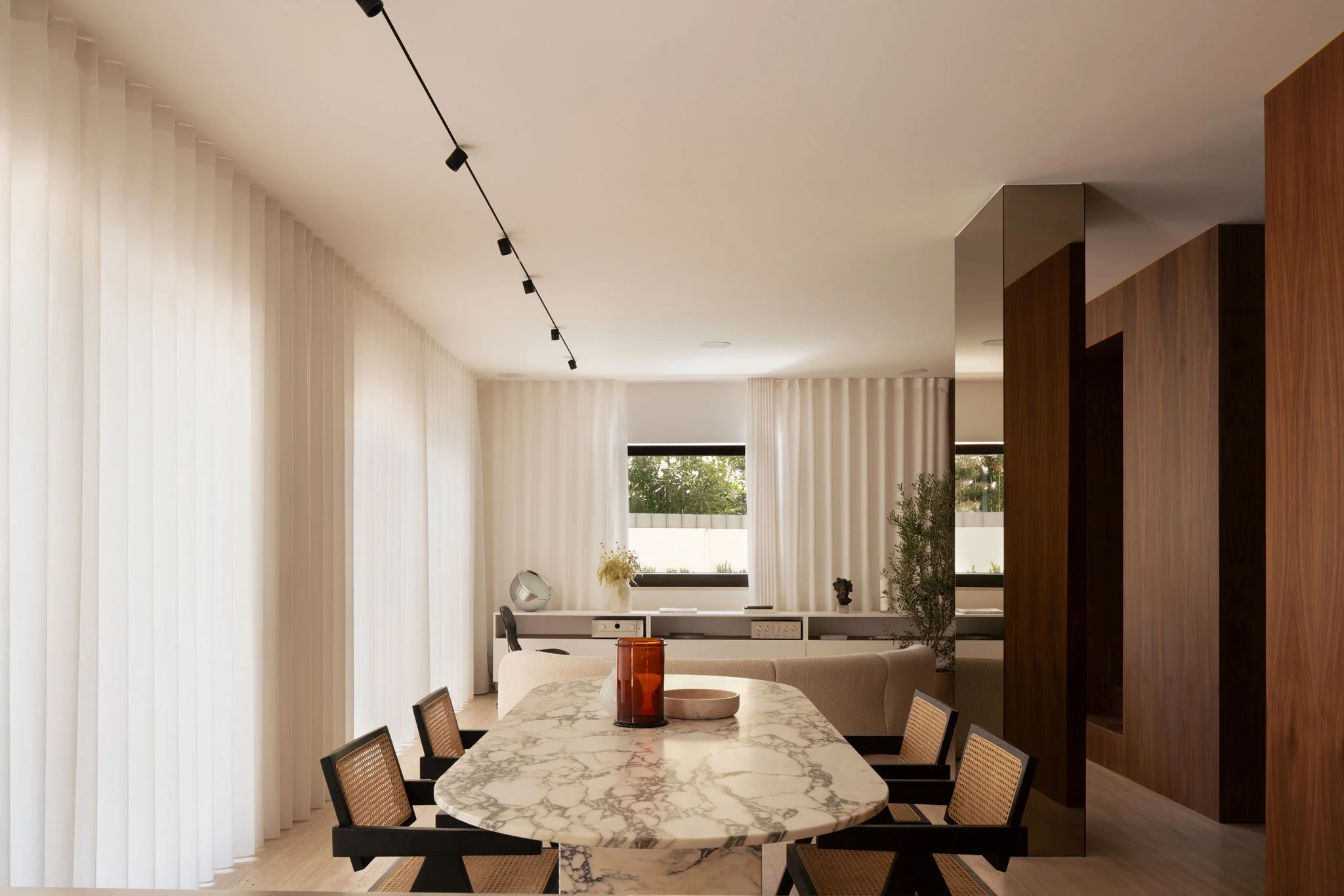 The living area, coextensive with the white room, hosts the kitchen, dining, and lounge. Each zone follows the next in a clean linear progression: a stainless steel kitchen island gives way to a marble dining table, which leads into a soft seating arrangement. An existing concrete column, now clad in bronzed mirror, punctuates the central core, offering subtle reflection and contrast.
