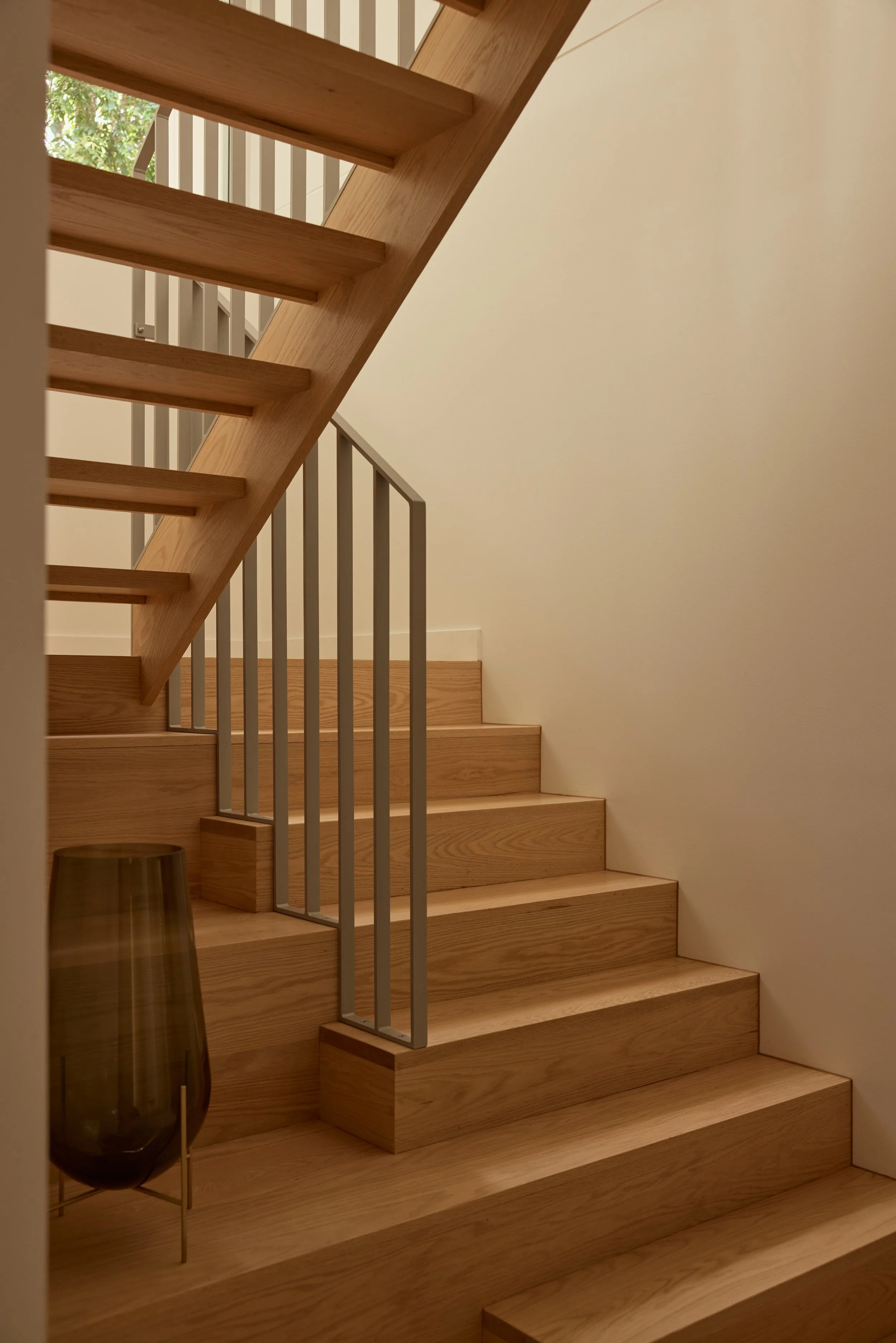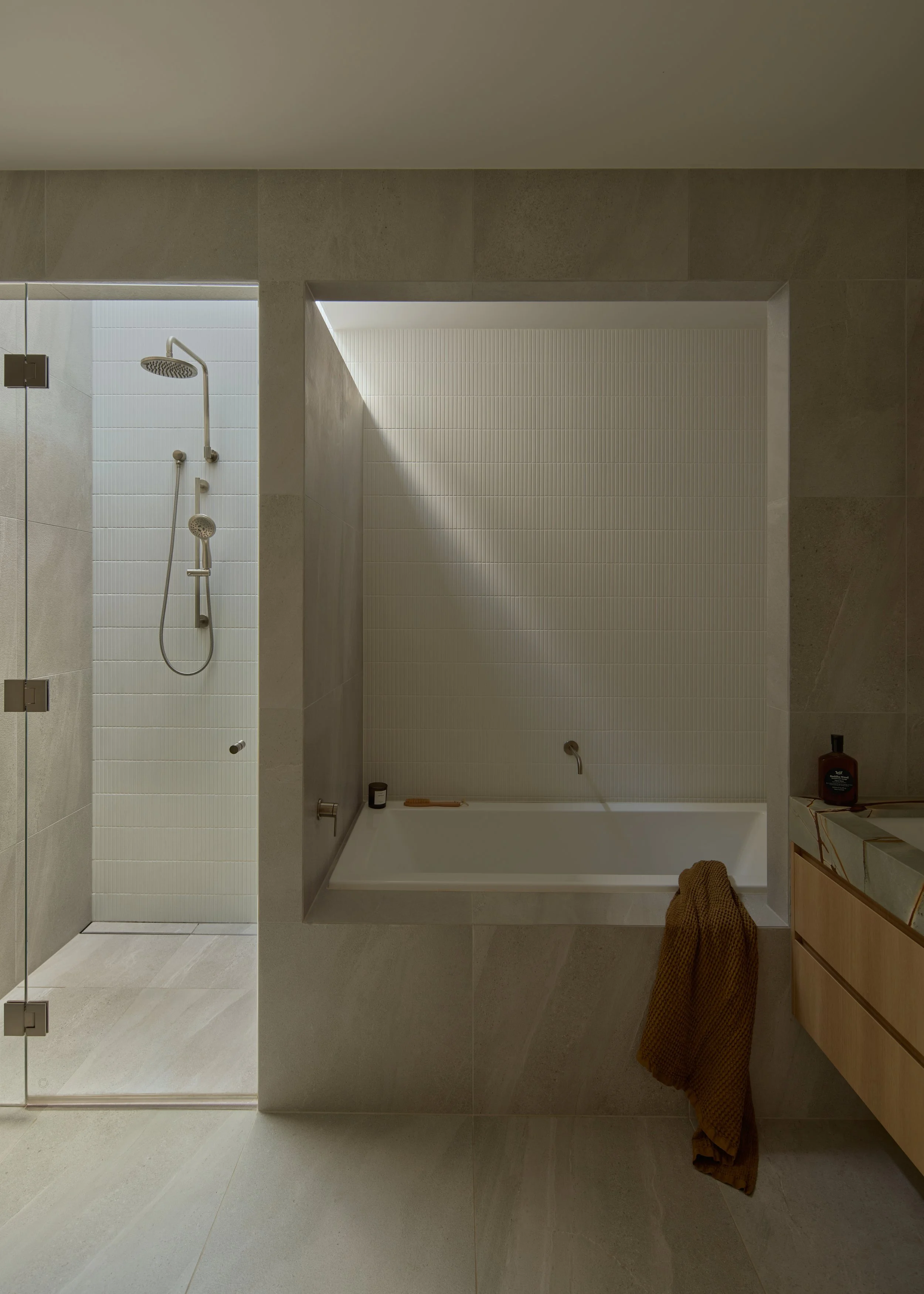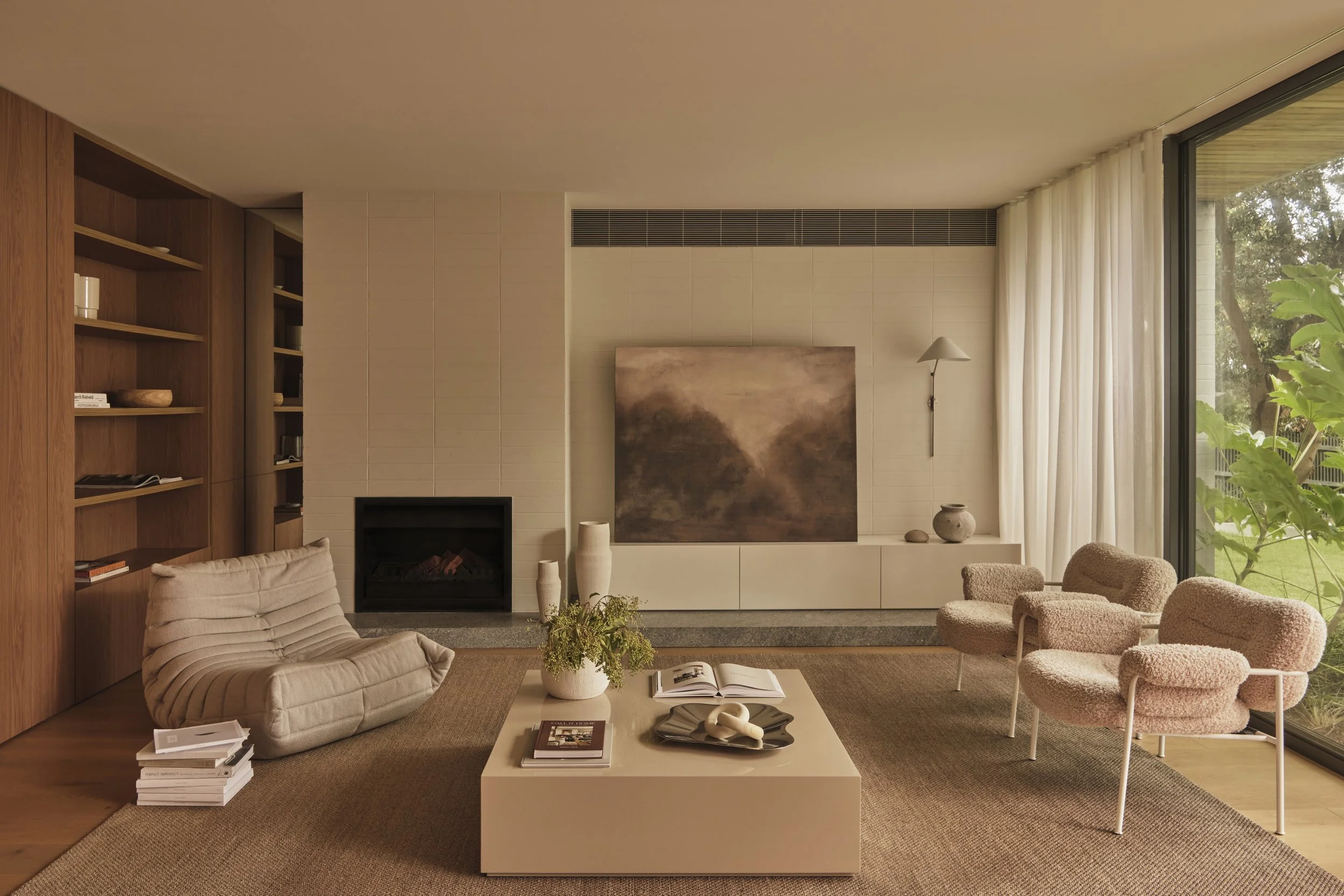 Inside, the brief for simplicity and minimal living is realised through Scandinavian and Japanese influences, expressed in restrained joinery, natural finishes, and an uncluttered palette. Calm neutrals form the base, enriched by subtle earthy tones and natural textures. The result is an atmosphere that is serene and enduring, spaces that invite quietude while remaining highly functional for family life.