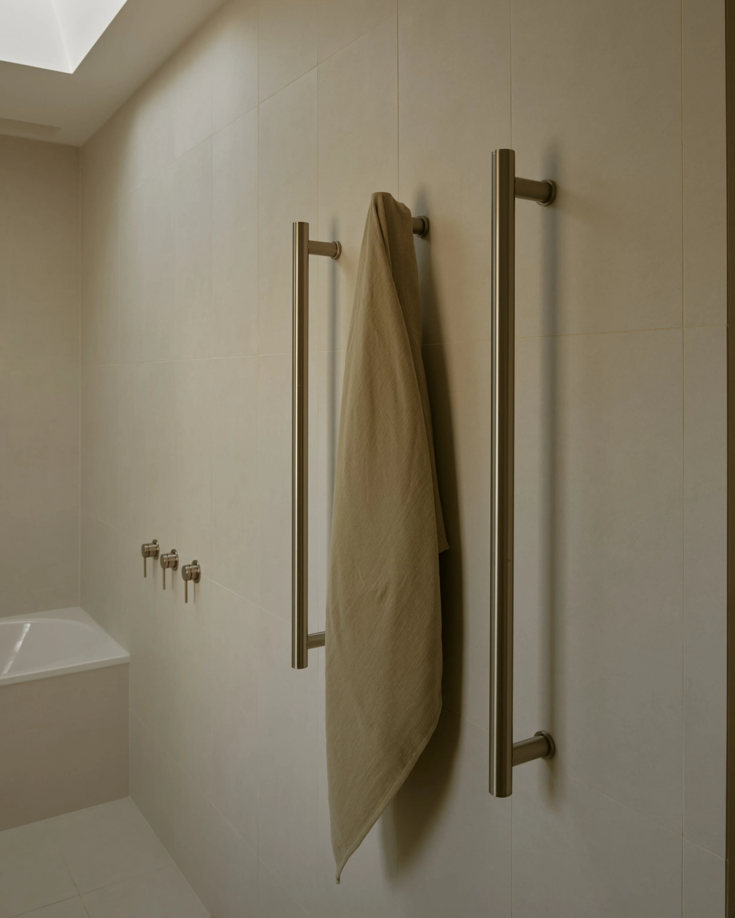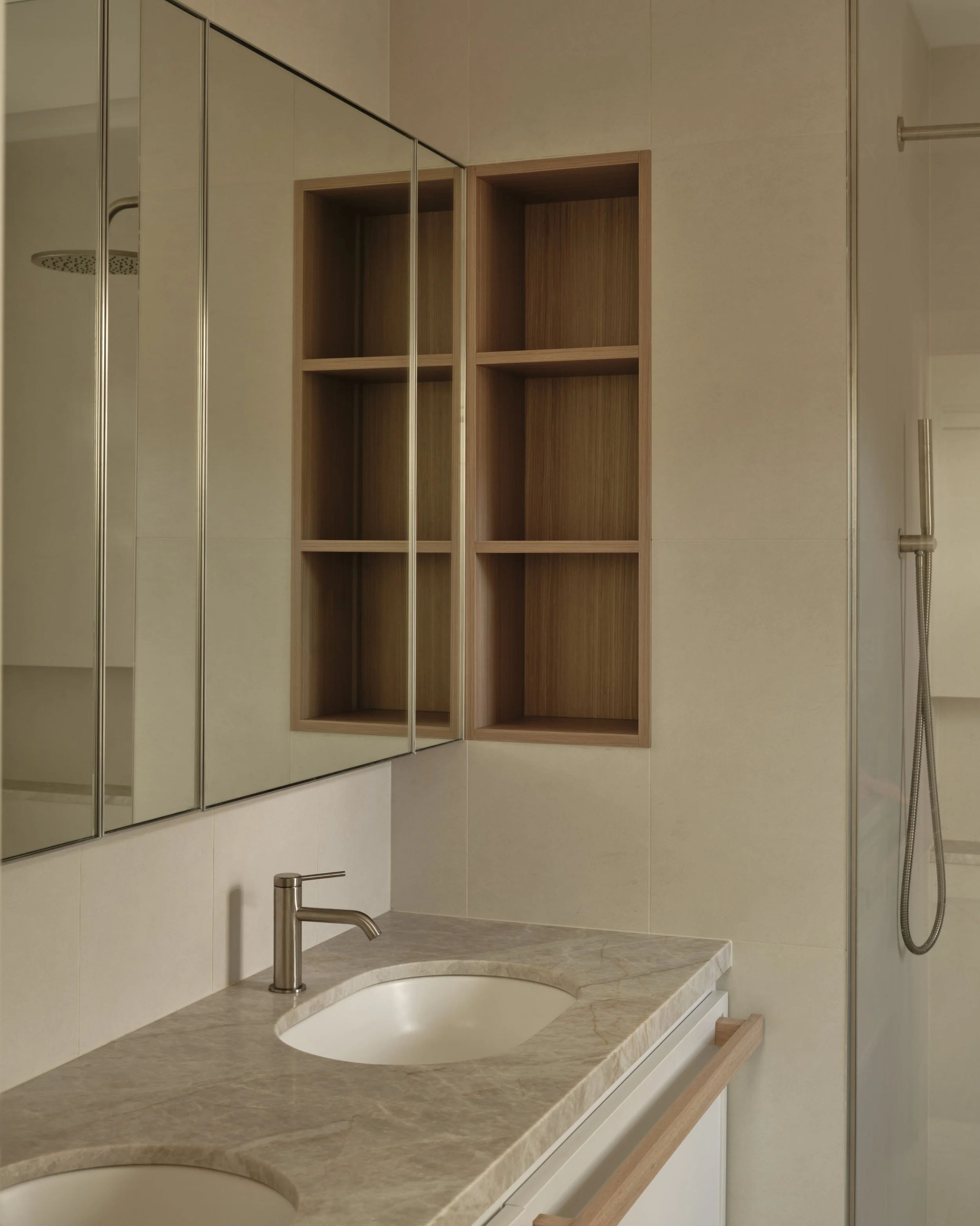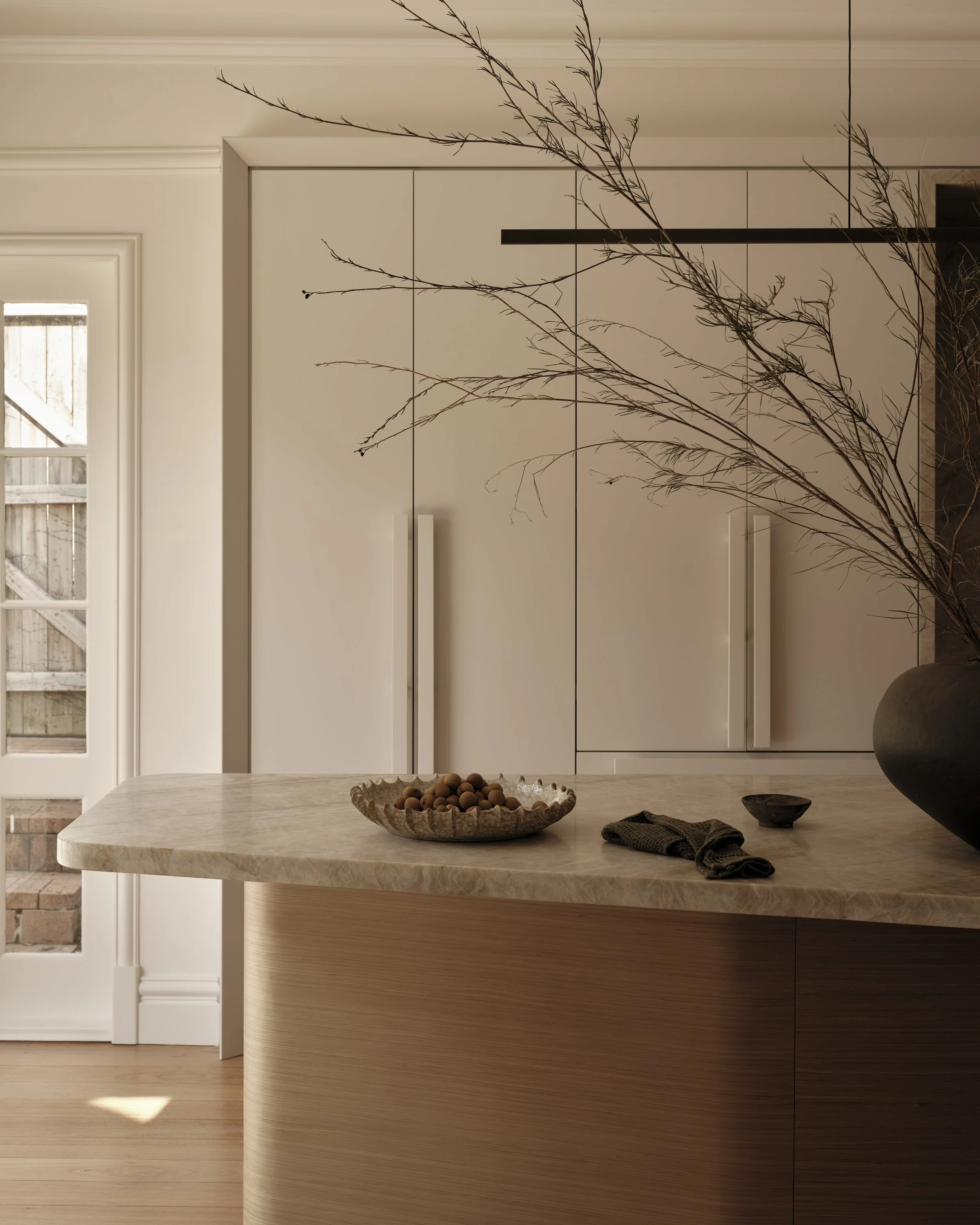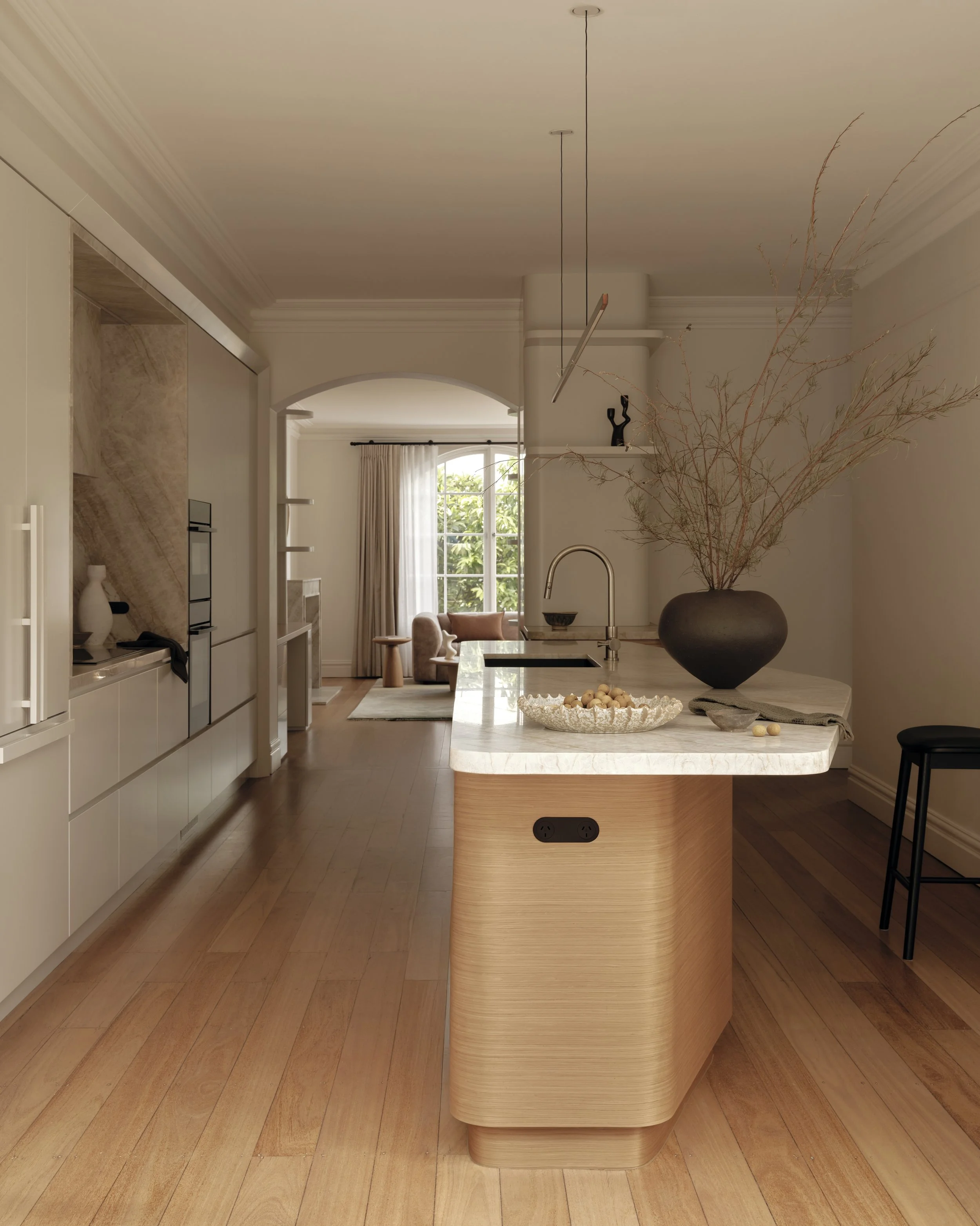 Material selection and detailing underpin the home's sense of calm. Warm timber, Taj Mahal quartzite and soft grey finishes create a cohesive palette, unified by gentle curves and custom joinery that recall the home's Art Deco origins. Nautical references appear subtly throughout, from the bow-like kitchen island to rounded corners and horizontal lines reminiscent of ocean liners: a nod to the 1930s fascination with travel, freedom and modernity.