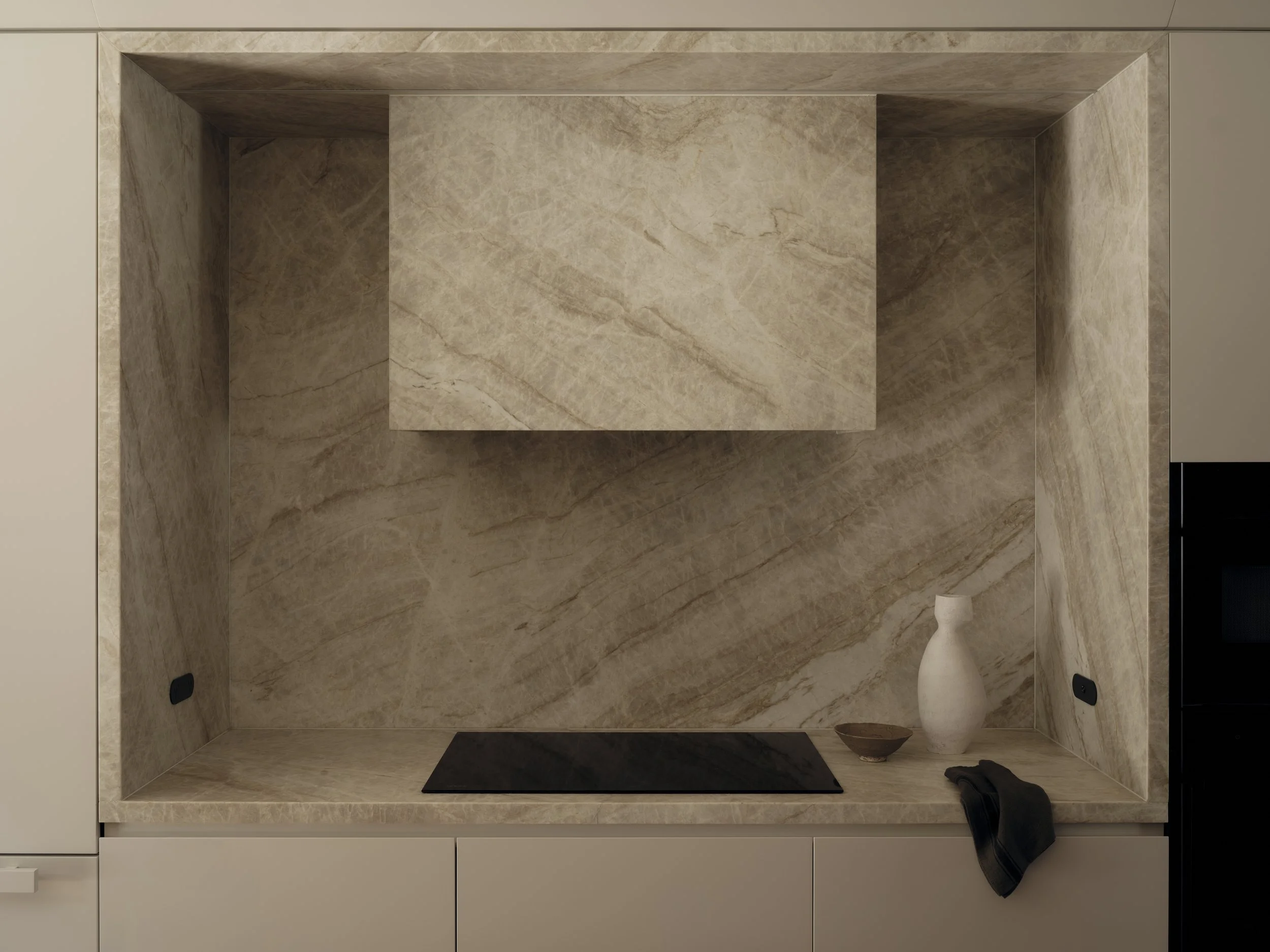 Inside, the palette remains restrained but tactile. Stone, timber and brushed metal are layered with soft furnishings and curved furniture profiles, establishing continuity from one room to the next. Lighting is warm and diffused, heightening the textures of surfaces and joinery. The design offers subtle variation across spaces while maintaining harmony throughout the home.
