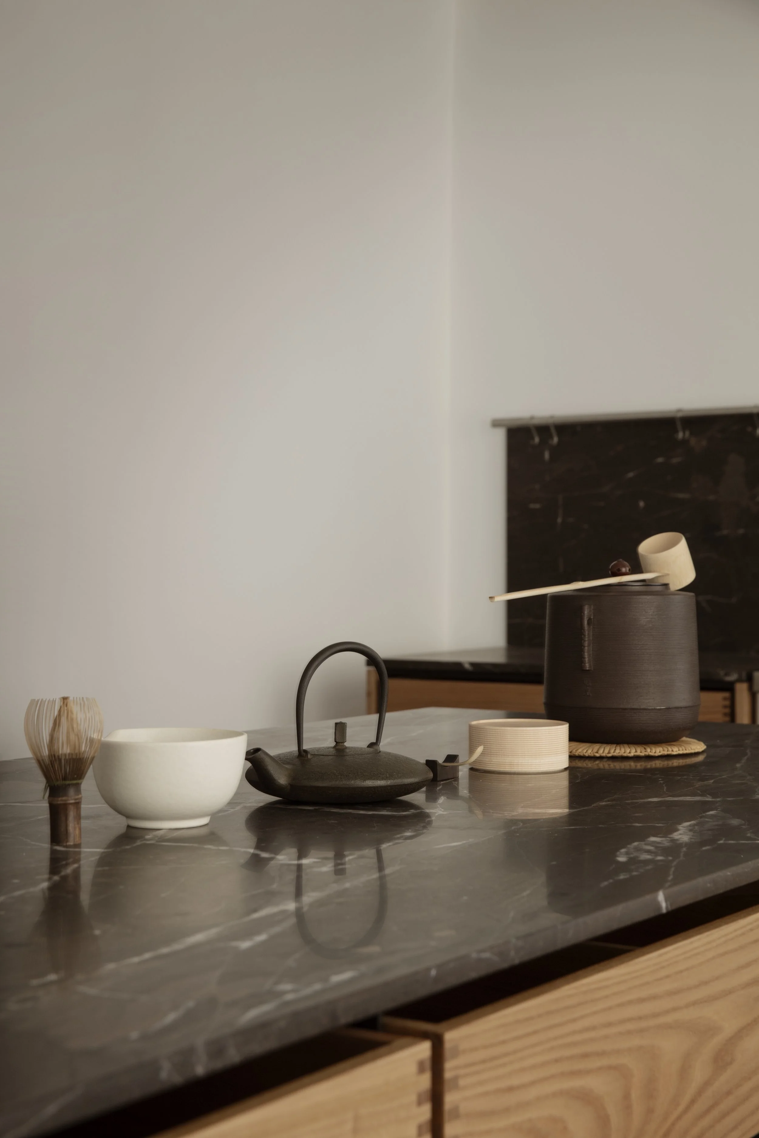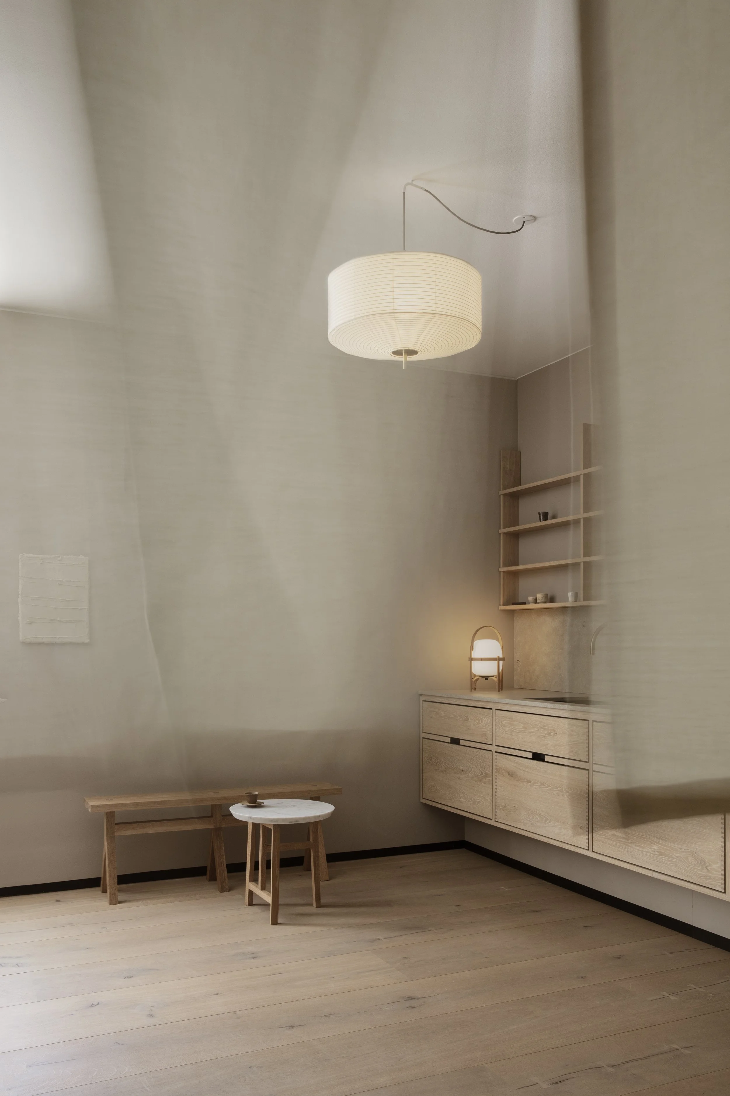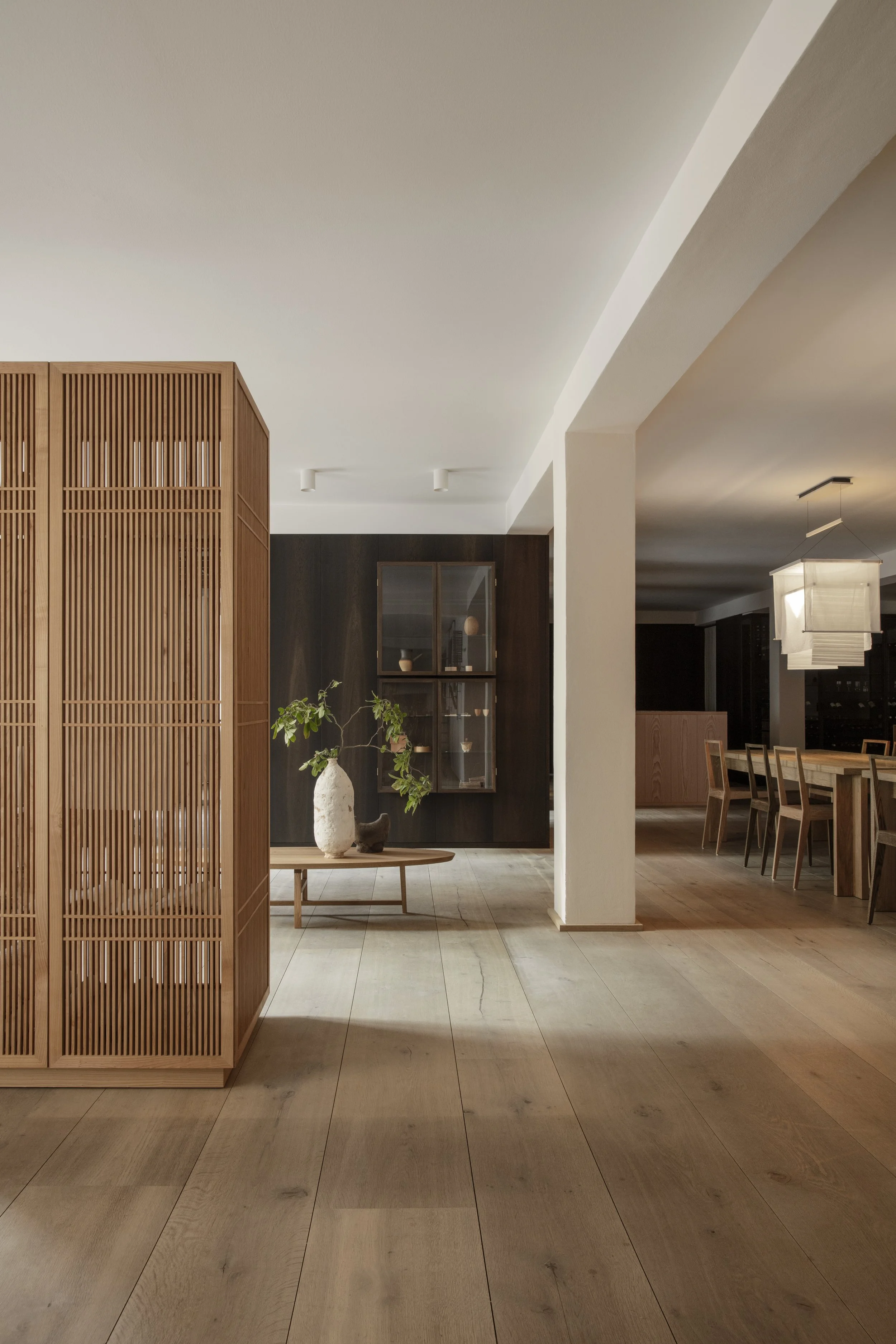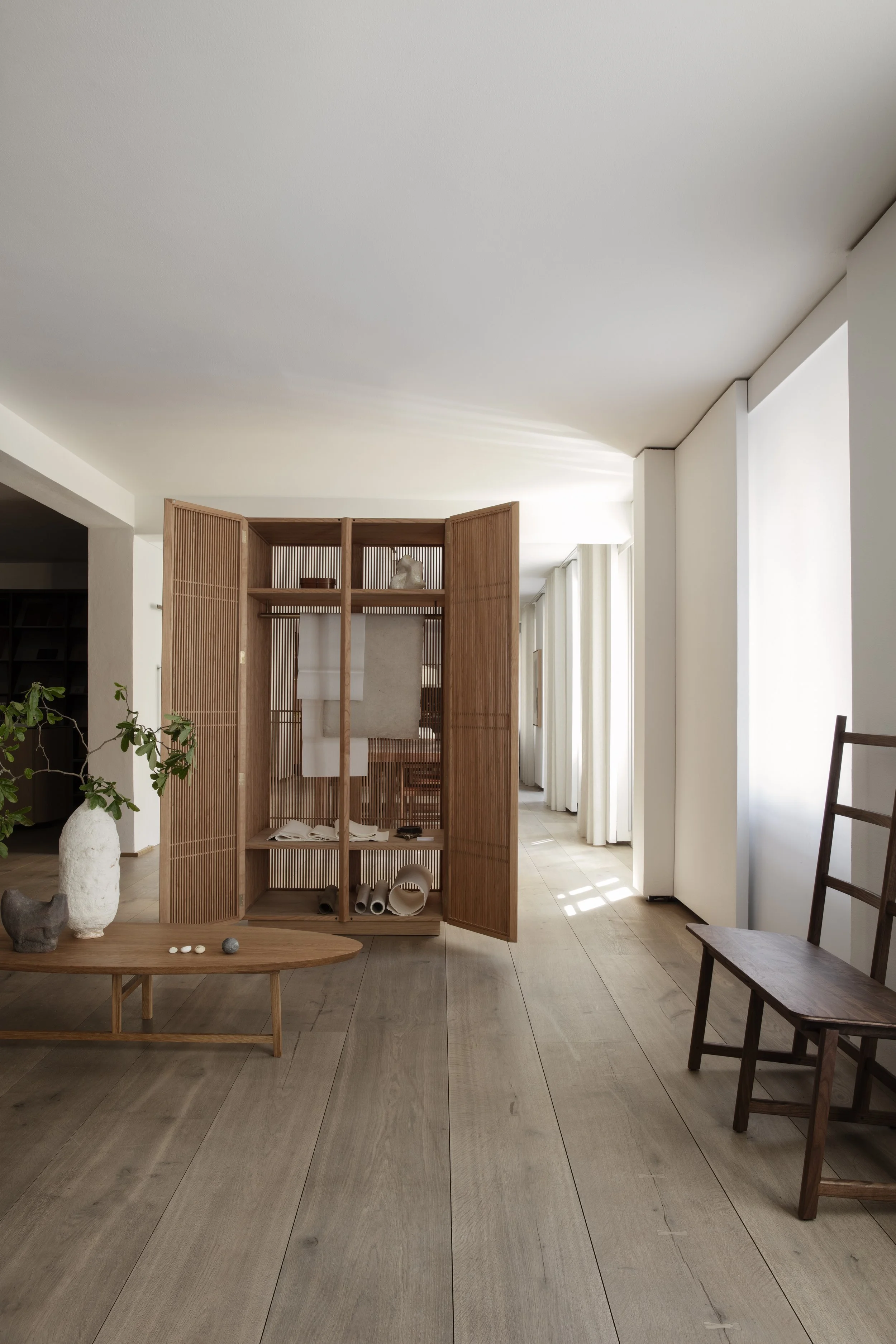 Anchoring the installation was the launch of the Koshi-do Armoire, the latest addition to Garde Hvalsøe’s Koshi-do collection. Developed in close collaboration with OEO Studio, the freestanding cabinet was crafted in solid cherry wood with a delicate vertical slatted front. Drawing on Japanese principles of balance, simplicity, and spatial harmony — reinterpreted through a Nordic perspective — the piece cast shifting patterns of light and shadow, underscoring the exhibition’s exploration of sensory depth.