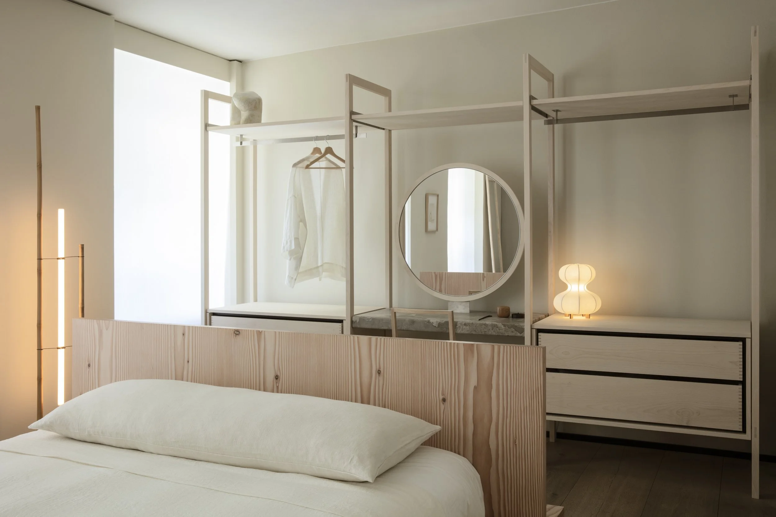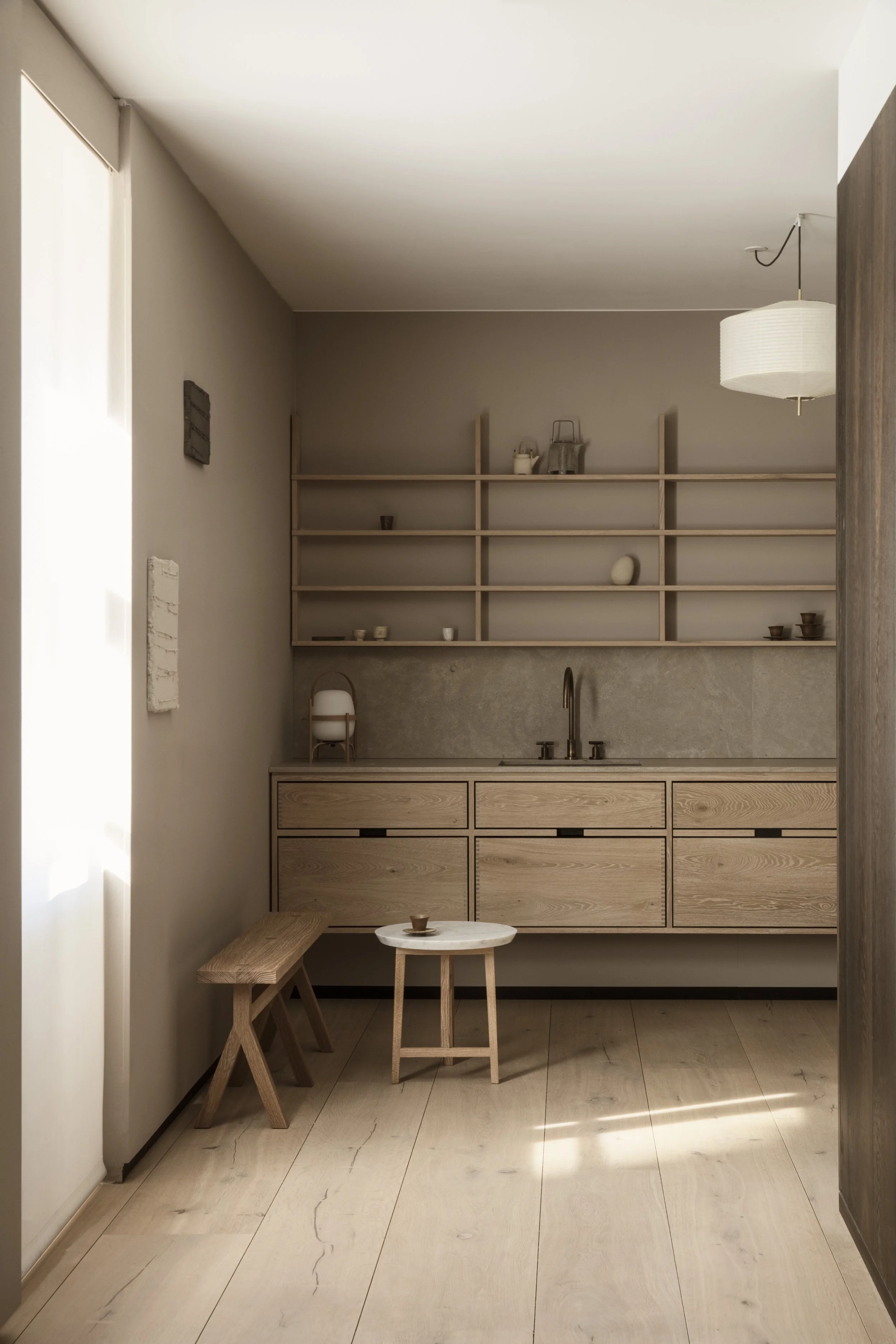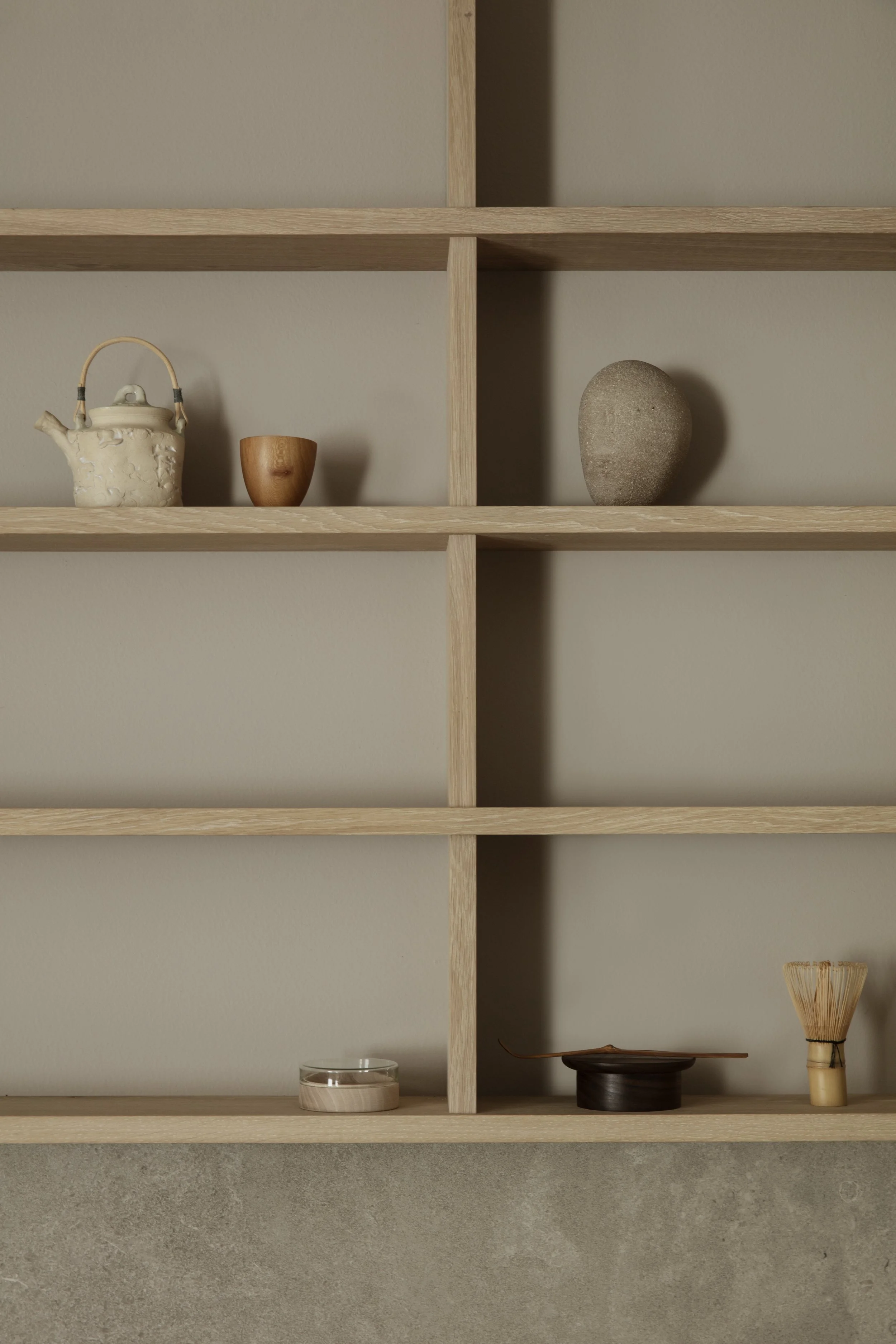 Anchoring the installation was the launch of the Koshi-do Armoire, the latest addition to Garde Hvalsøe’s Koshi-do collection. Developed in close collaboration with OEO Studio, the freestanding cabinet was crafted in solid cherry wood with a delicate vertical slatted front. Drawing on Japanese principles of balance, simplicity, and spatial harmony — reinterpreted through a Nordic perspective — the piece cast shifting patterns of light and shadow, underscoring the exhibition’s exploration of sensory depth.