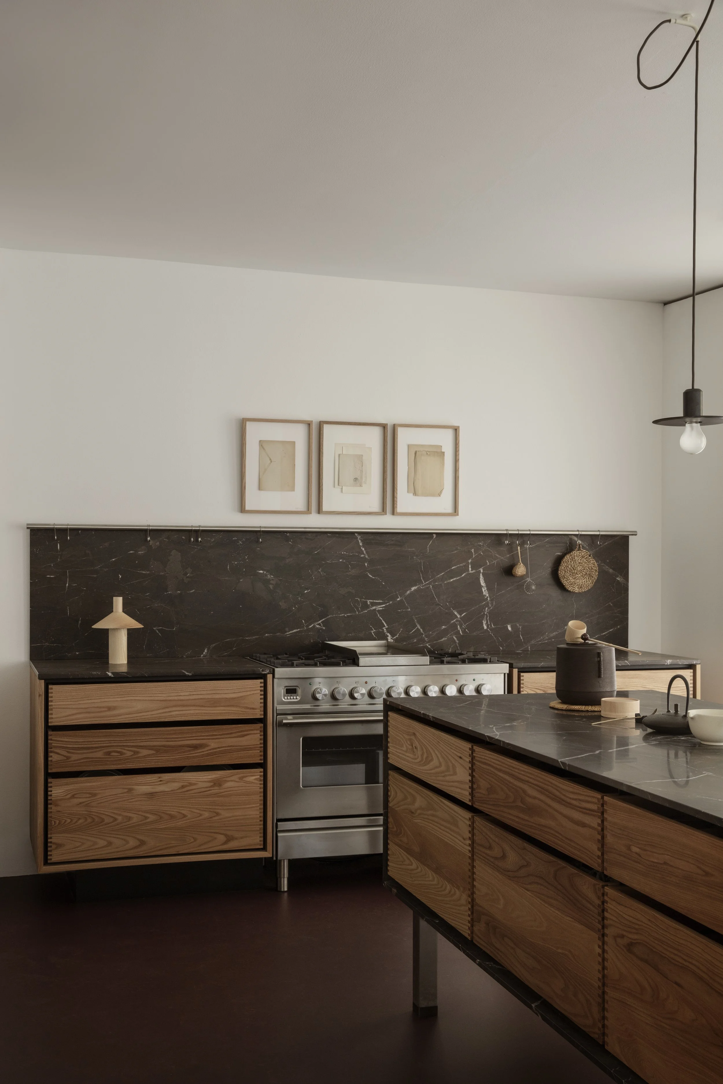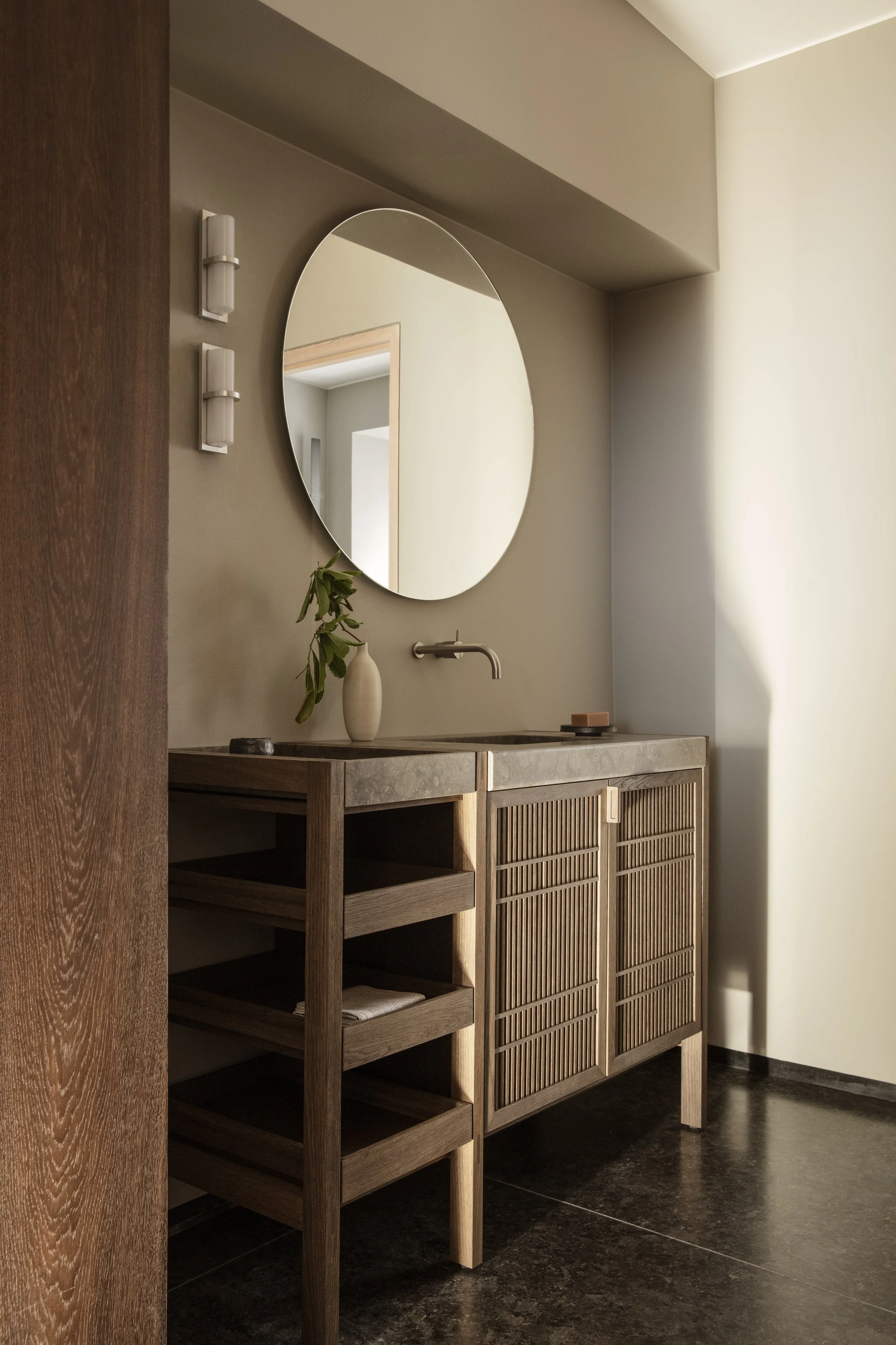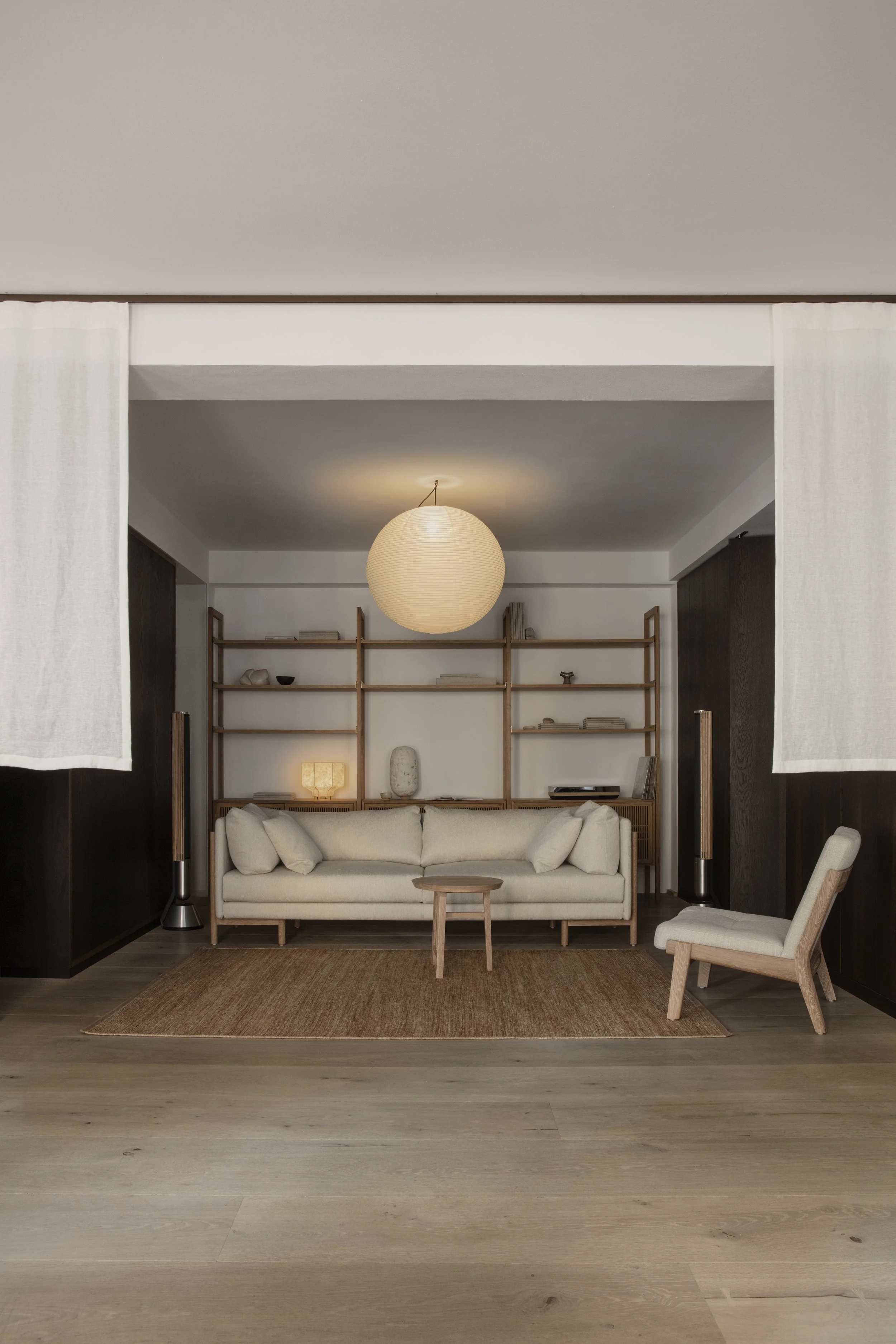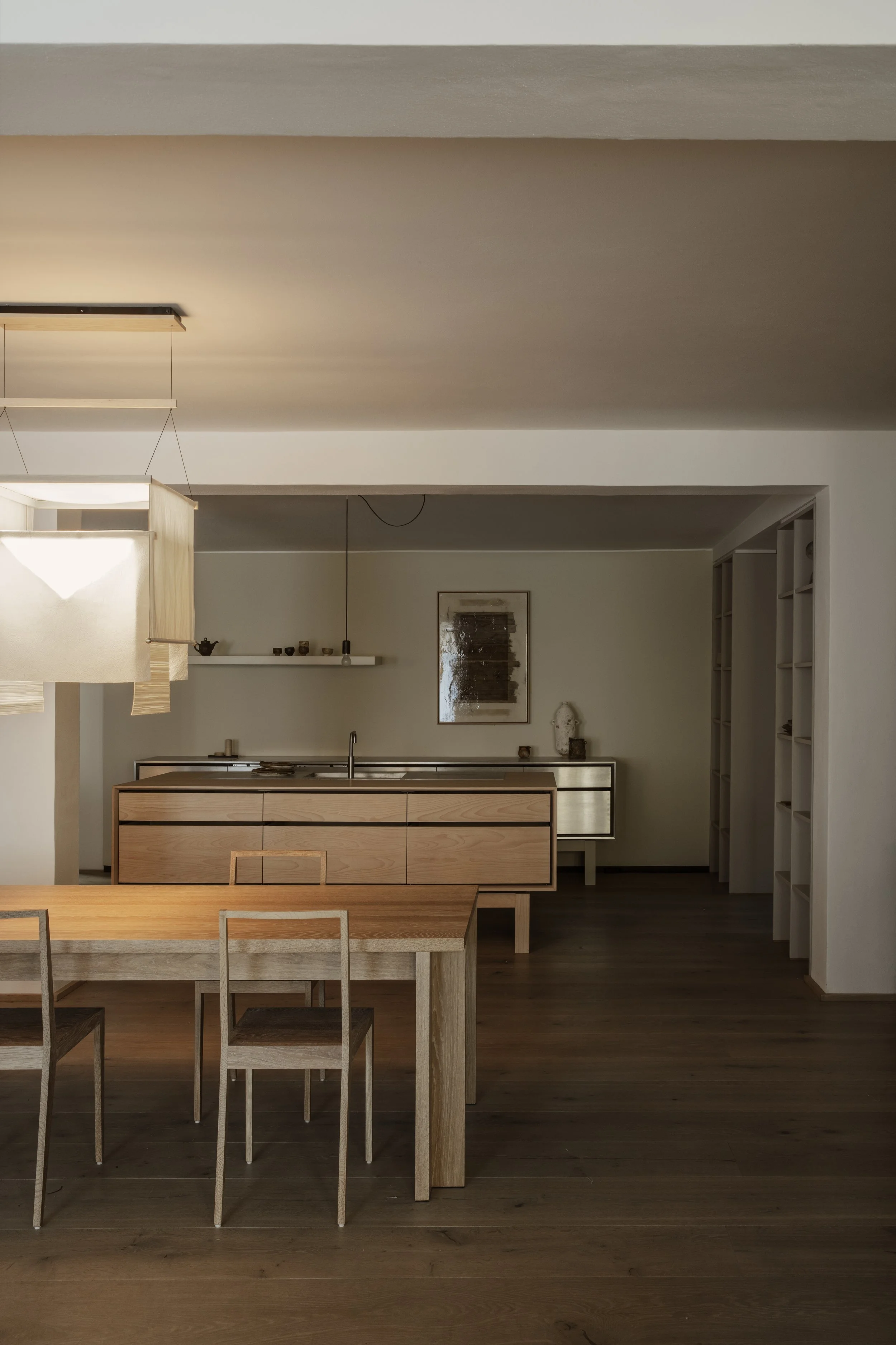 Anchoring the installation was the launch of the Koshi-do Armoire, the latest addition to Garde Hvalsøe’s Koshi-do collection. Developed in close collaboration with OEO Studio, the freestanding cabinet was crafted in solid cherry wood with a delicate vertical slatted front. Drawing on Japanese principles of balance, simplicity, and spatial harmony — reinterpreted through a Nordic perspective — the piece cast shifting patterns of light and shadow, underscoring the exhibition’s exploration of sensory depth.