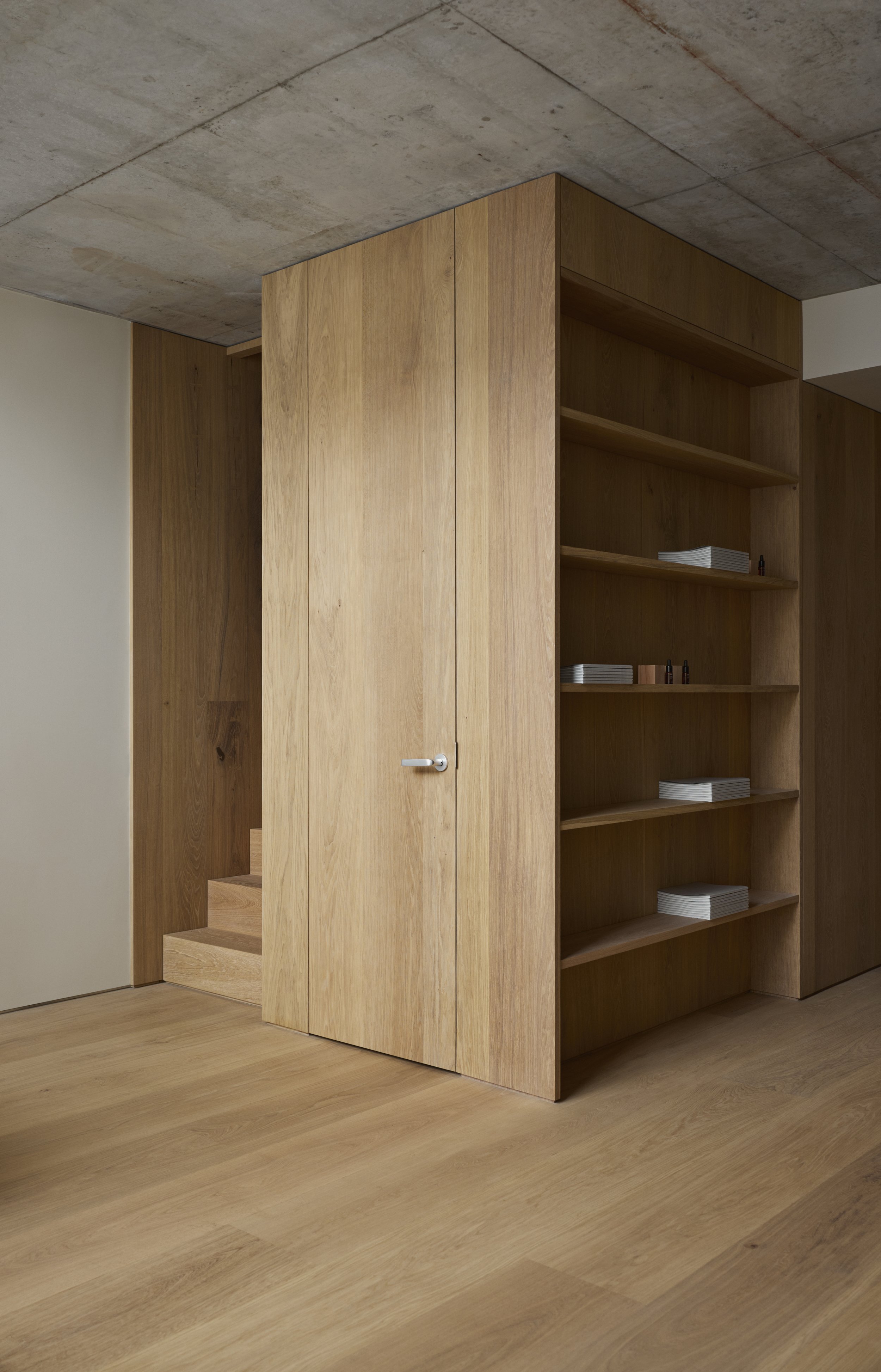 At the heart of the scheme is Dinesen Layers Oak in the Classic variant, chosen for its calm grain and engineered stability. Boards run as cohesive fields, binding rooms into a single, quiet language. Select moments of Layers HeartOak punctuate this calm with natural cracks pinned by oak butterfly joints – subtle signatures of growth and time. Timber moves beyond the floor plane into vertical cladding and built furniture: a bespoke half-turn staircase in Layers Oak, a built-in bookcase in solid Oak Classic, and a solid HeartOak headboard that anchors the private realm. The continuity reads as a grounded landscape in wood, measured and assured.