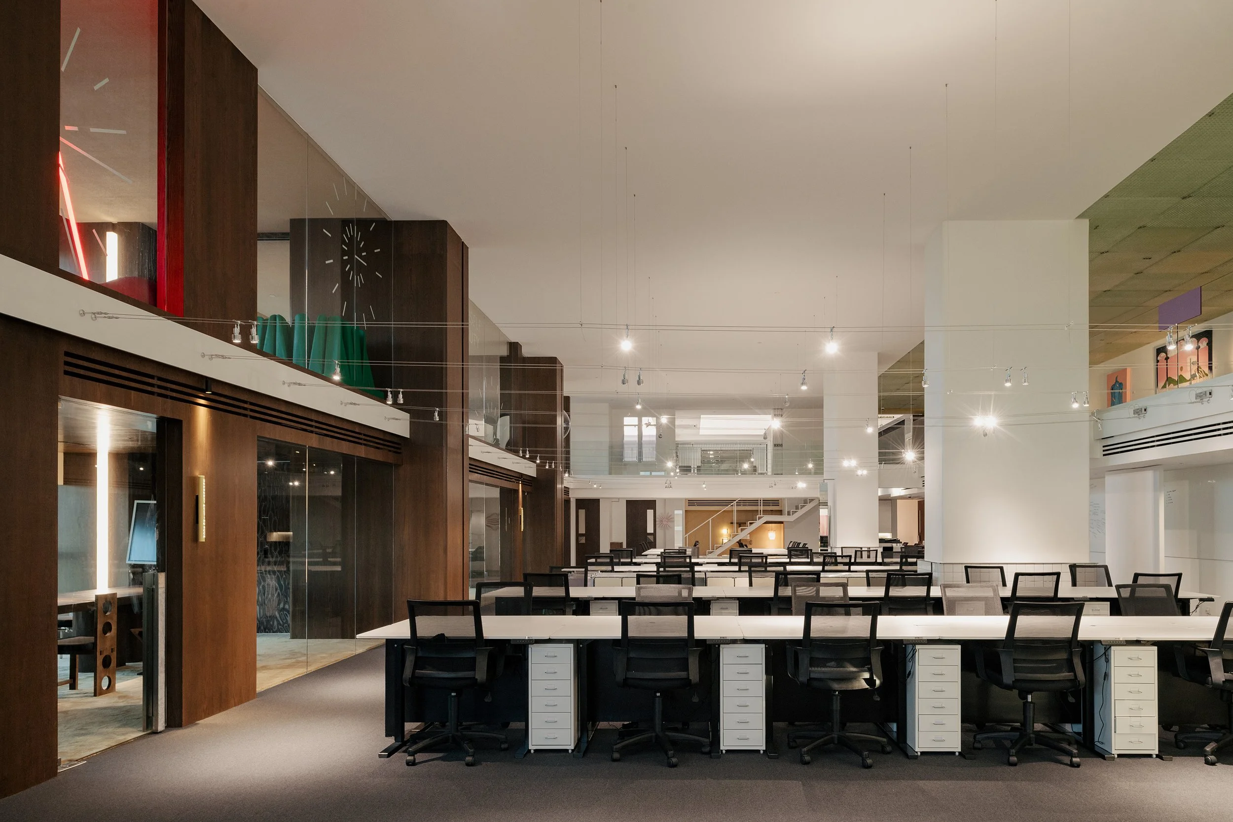 A central design challenge lay in maintaining legibility while enabling constant change. With multiple levels and a broad program mix, the interior needed to remain easy to navigate and understand, even as zones flex between quiet work and large gatherings. DualSpace addressed this by organizing the office around a connective circulation spine that links key destinations and creates a continuous thread across floors. This structured movement path supports clarity, while adjacent areas are allowed to expand, contract, and reconfigure as needs shift.