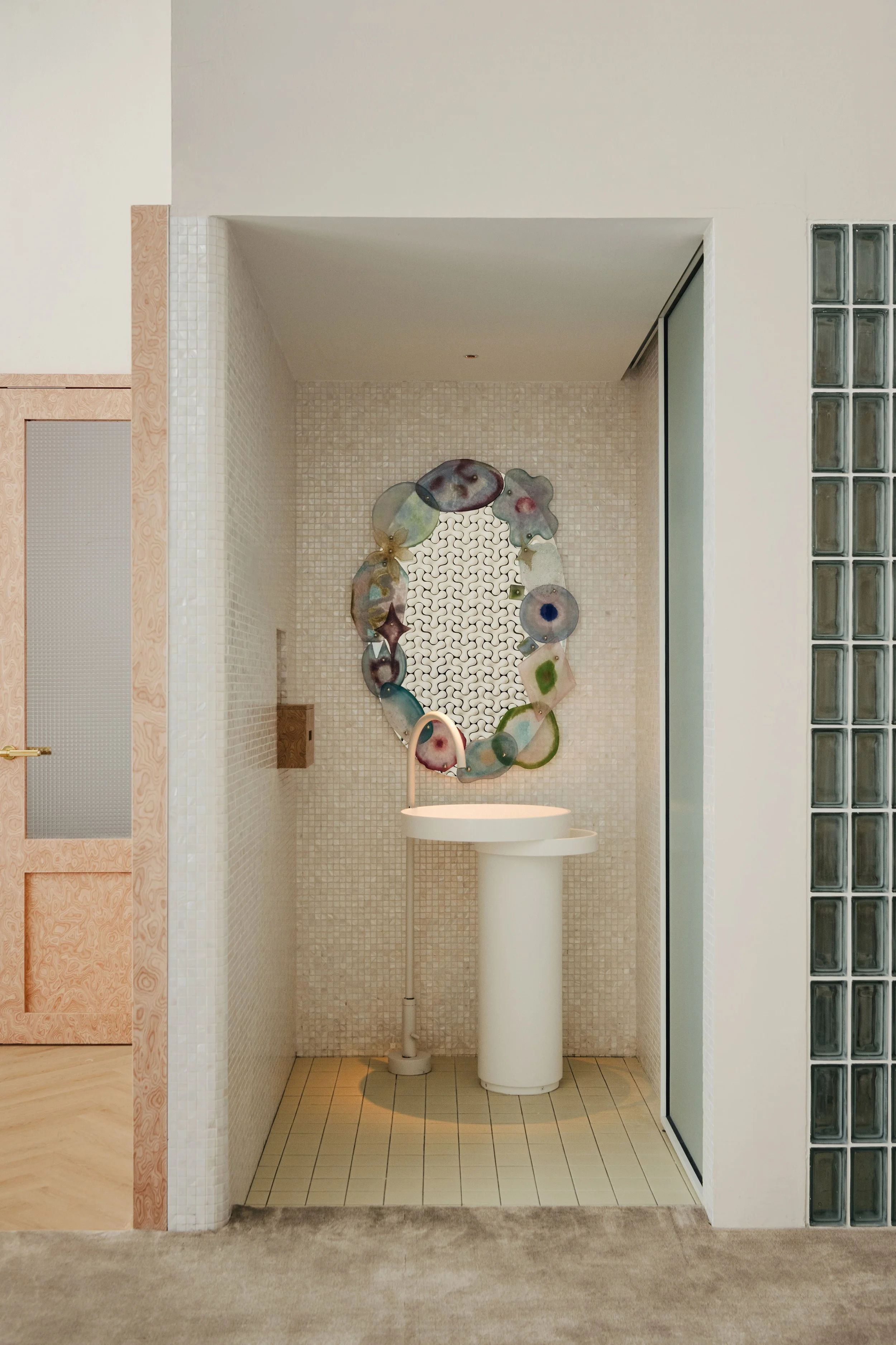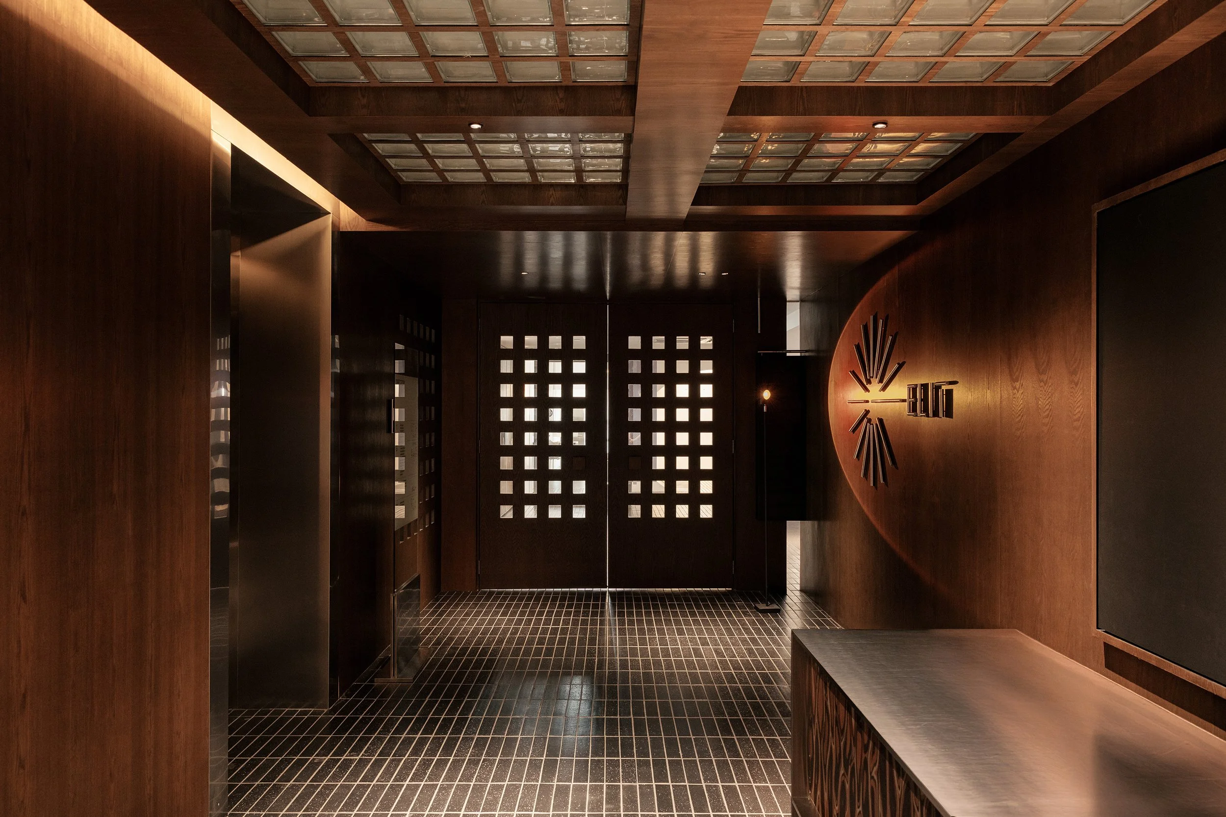 Material and detailing play a key role in holding this diverse interior together. Printed tiles, stained timber, stainless steel, glass, and resin grid ceilings are combined with bespoke lighting and custom furniture systems to create a layered, craft-forward palette. Materials are selected not only for durability but also for their capacity to differentiate atmosphere from one program to the next, allowing each zone to express its purpose while still feeling part of a cohesive whole. Recurring timber elements and consistent detailing reinforce continuity across the varied settings.