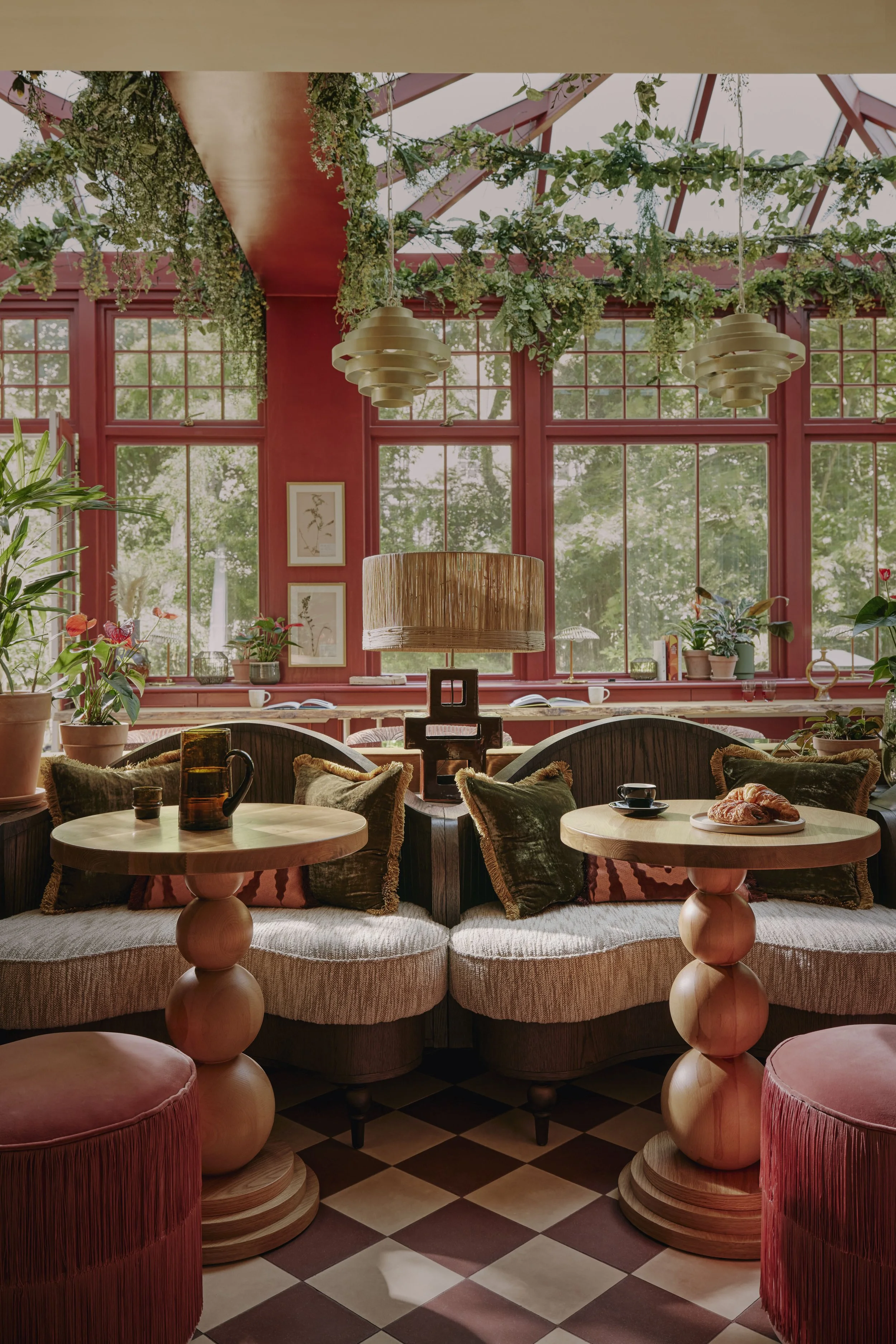 The project benefits from extensive gardens to the rear. The client's brief was to blur the transition between the garden and the hotel interior and this has been realised through careful selection of materials in the adjacent space, a maximalist approach to planting and precisely planned FF&E that deliberately focuses on the boundary between inside and out.