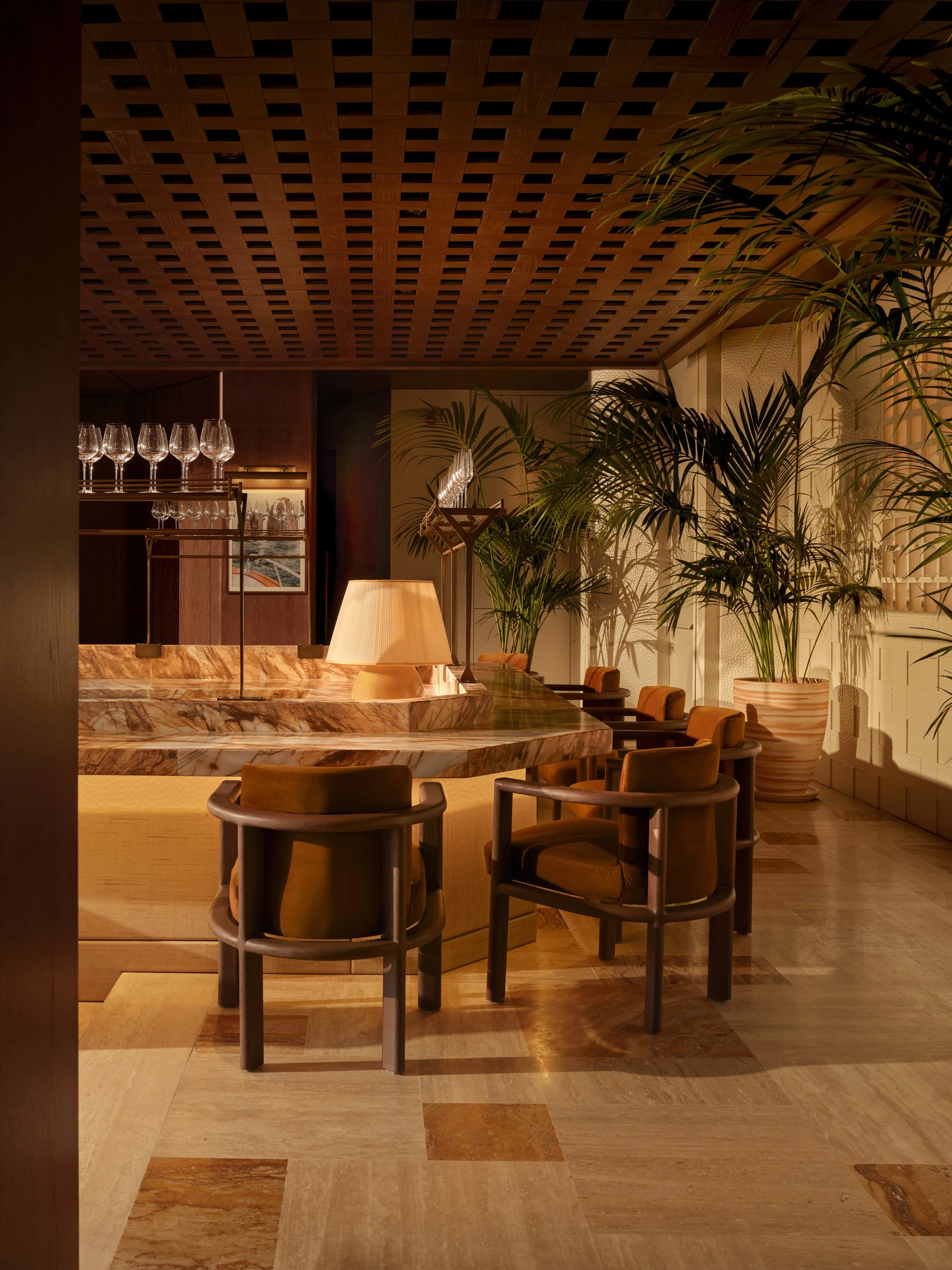 The restaurant is experienced as a layered journey across four zones: an enclosed entry, a private dining room, a central bar and an expansive terrace. Guests enter through a sheltered windbreak that opens onto the main hall, where the eye is drawn toward the dual-level central bar—a sculptural anchor offering 360-degree access. This focal point establishes a visual and social connection between the interior and the terrace beyond, fostering a dialogue between enclosure and openness.