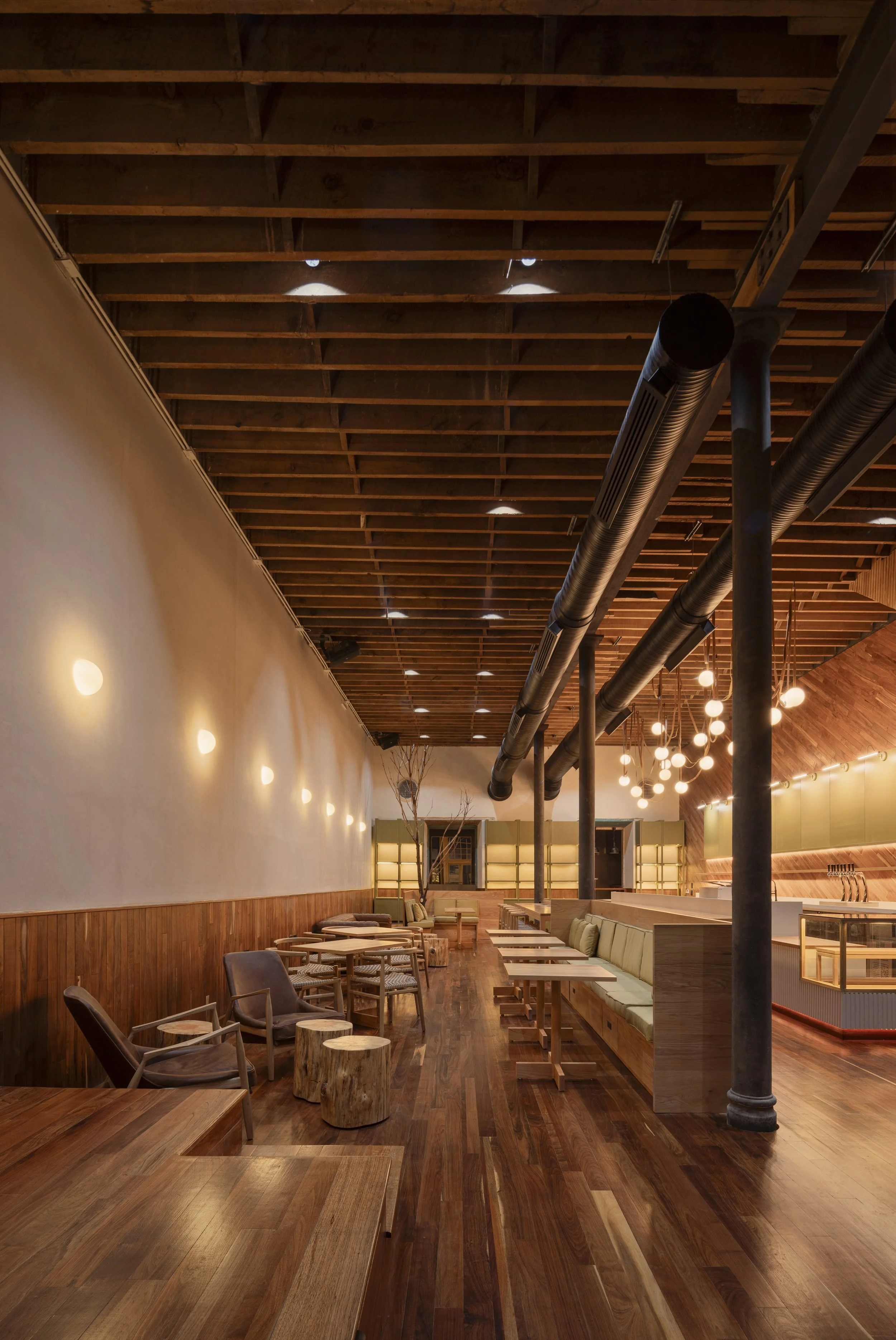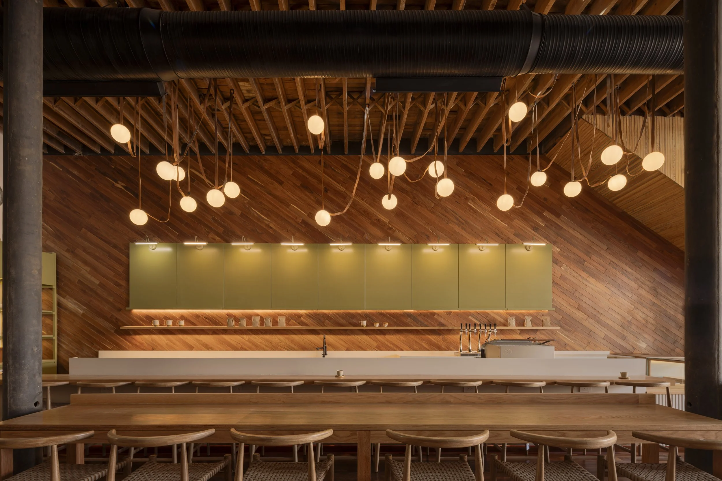 Spatial planning is deliberately open, enabling a fluid interaction between each function. Visitors move intuitively from production to consumption, gaining insight into each step of the coffee-making journey. Material transitions and tonal shifts subtly delineate zones, while handcrafted furniture pieces punctuate the interiors with tactility and warmth.