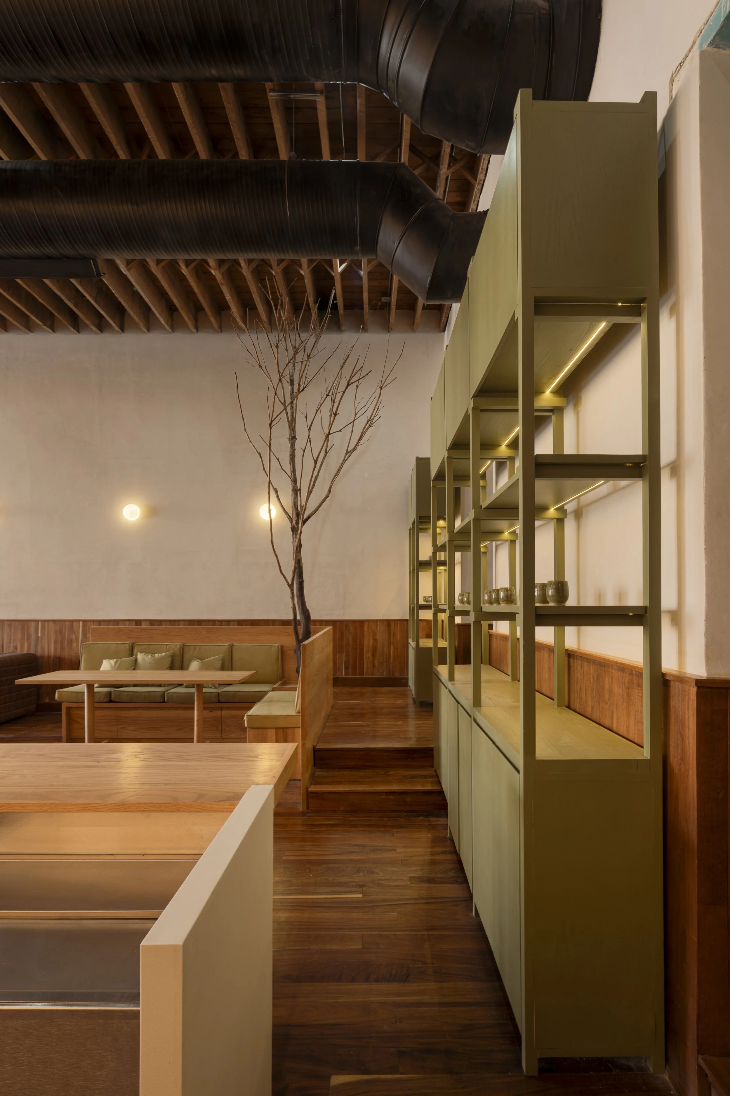 Programmatically, the venue moves beyond conventional café typologies. Upon entry, a prominent coffee roaster anchors the interior—a sculptural focal point that underscores the artisanal ethos of the project. Adjacent to this, a minimalist lab offers transparency to the process, where baristas test and refine blends. Further along, the tasting zone delivers a warm, enveloping atmosphere, drawing on natural textures and diffused lighting to support a slower, more contemplative experience.