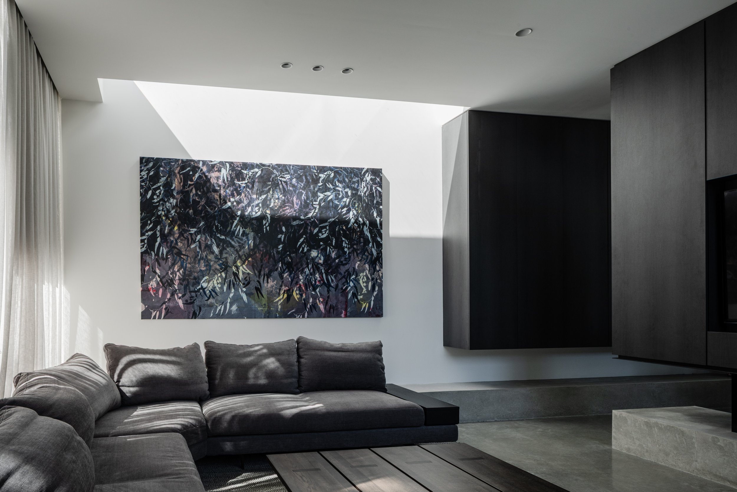 Materiality and continuity are central to the home's interiors. Dark external cladding extends inside, echoing in wall linings and joinery. Exposed concrete from the landscape, seen in the entry path, pool terrace, and al fresco dining area, flows seamlessly indoors, forming a cohesive ground plane. Sculptural elements such as the kitchen island, seating plinths, and fireplace emerge from this continuous surface, grounding the home in a tactile and thoughtful material palette.