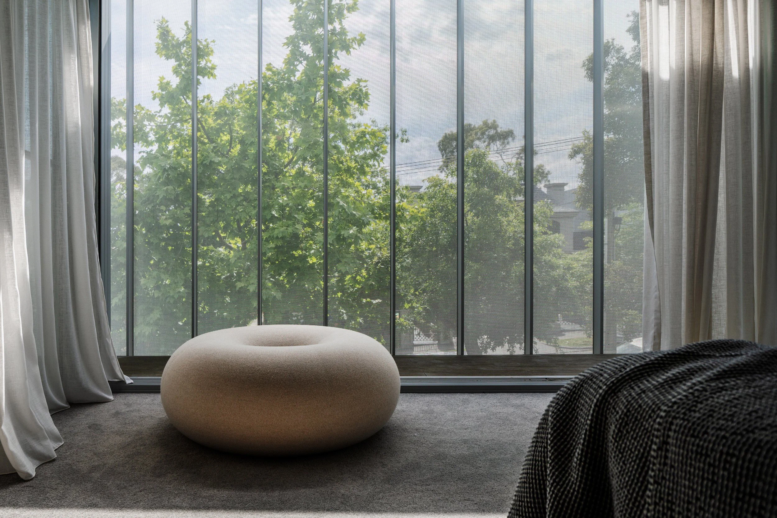 A continuous metal skin wraps the upper level, blending perforated and solid panels into a seamless façade. This layer filters sunlight into protected terraces and private bedroom and study interiors, while addressing privacy and overlooking requirements dictated by council controls. Views are maintained, natural light floods the interiors, and an elevated sense of openness is achieved: a sunlit retreat among the treetops.