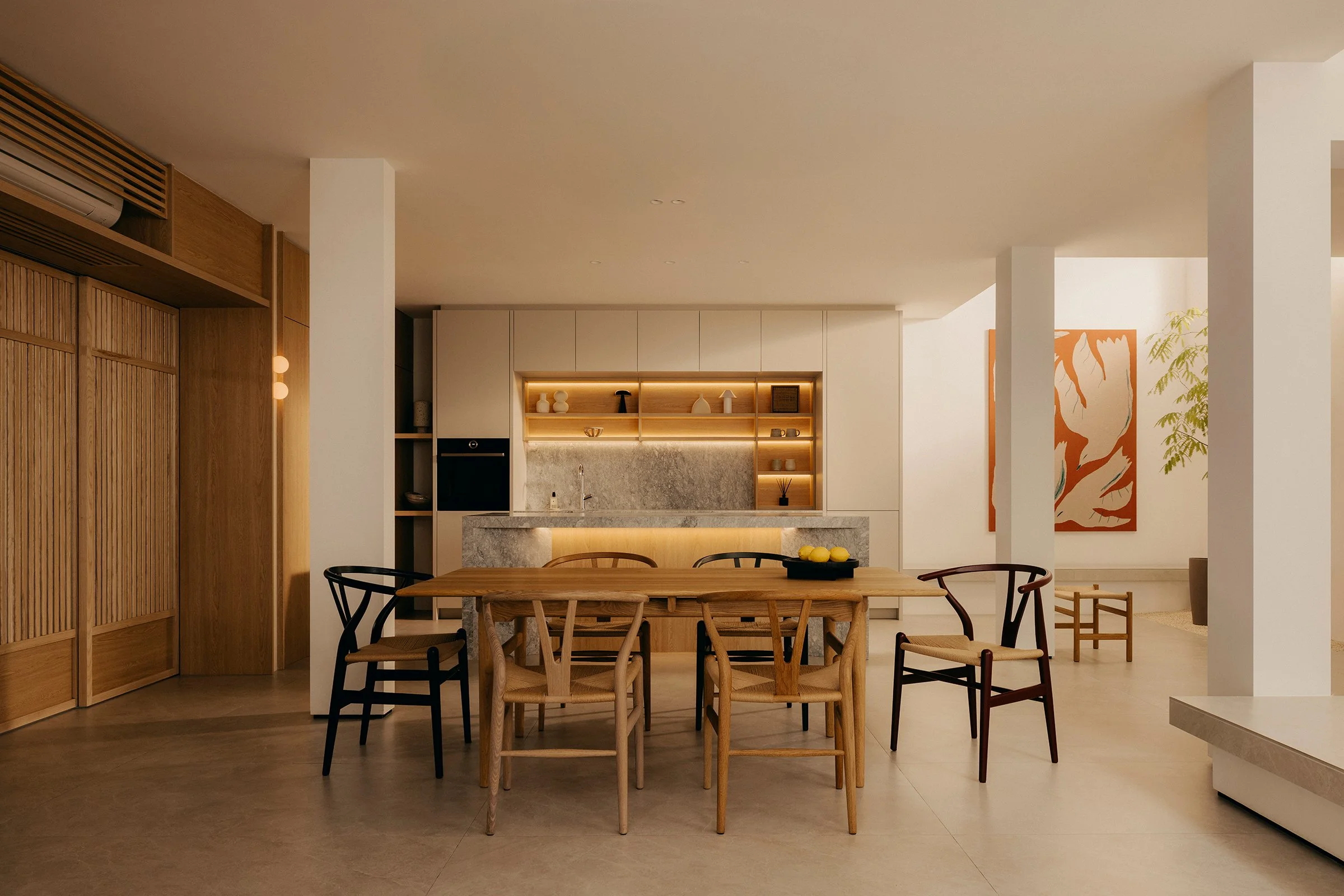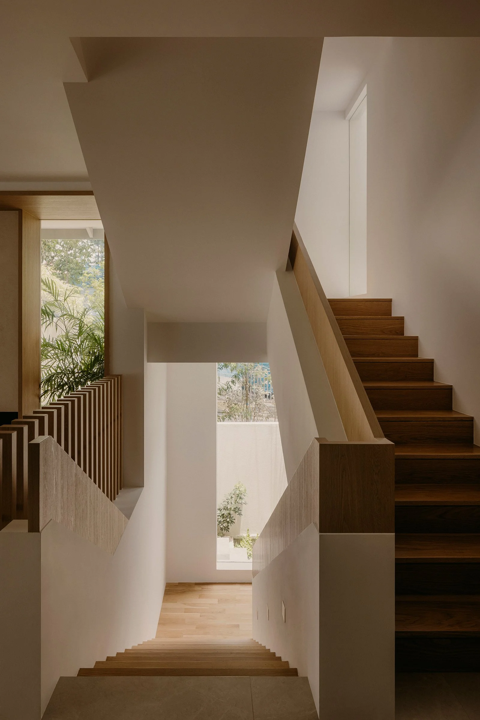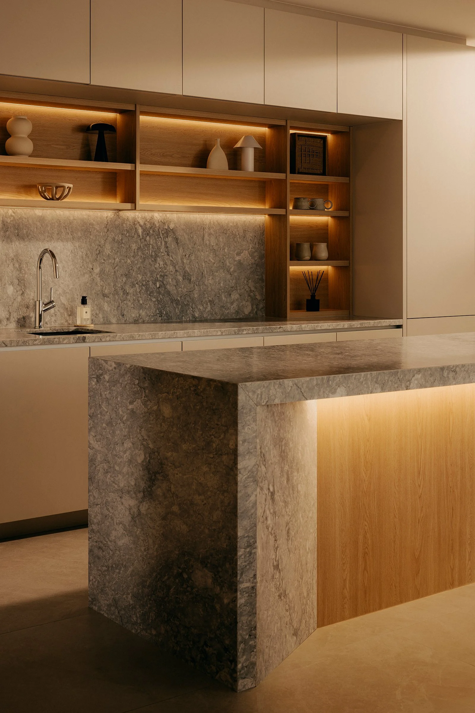 A defining move in the reconfigured layout is the enlarged opening toward the airwell. This expanded void strengthens visual continuity between levels and intensifies the presence of light as an architectural material. Drawing inspiration from James Turrell’s explorations of perception, illumination here is treated as atmosphere, subtle, shifting, and felt across the day as it washes over surfaces and edges, bringing depth to even the quietest corners.