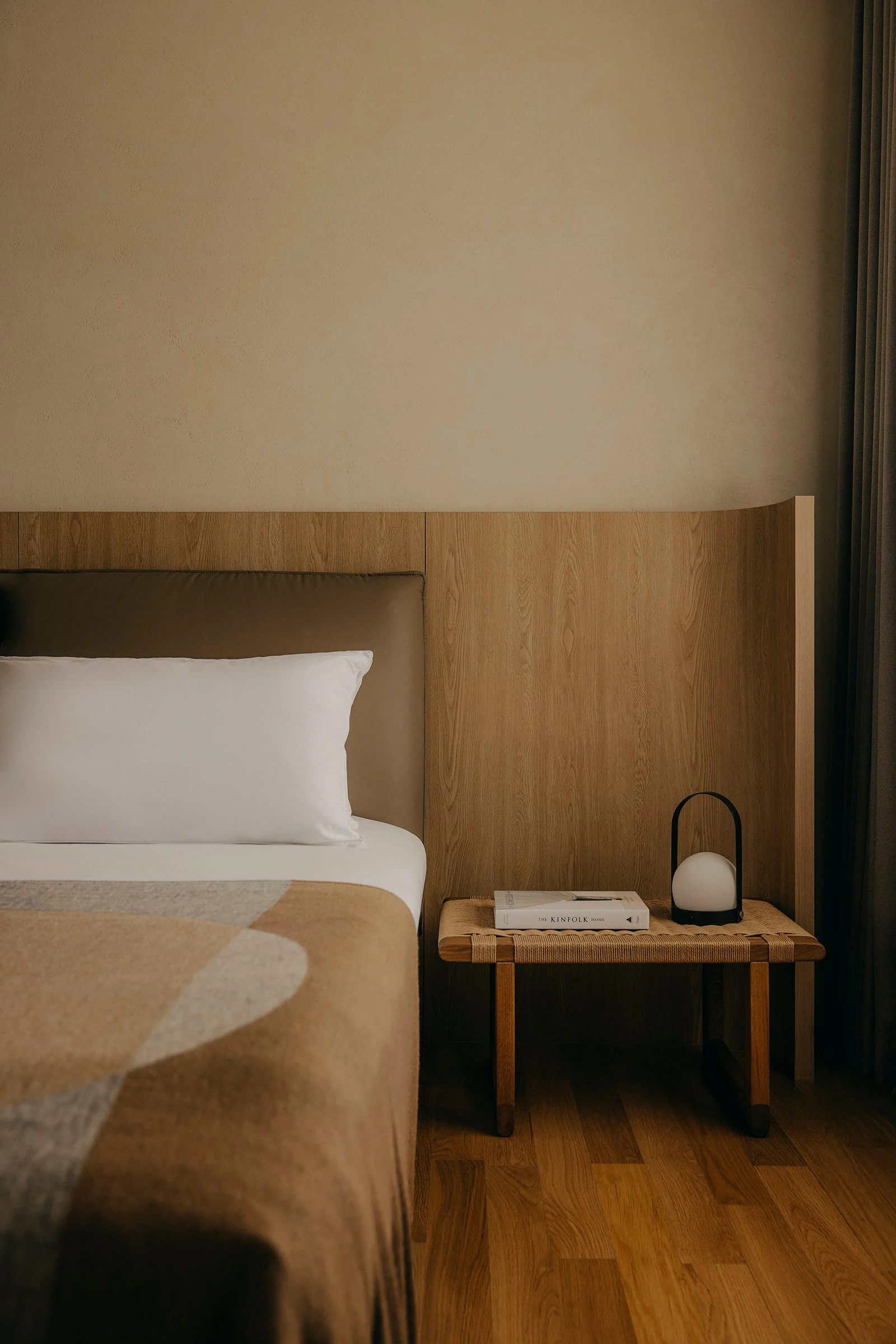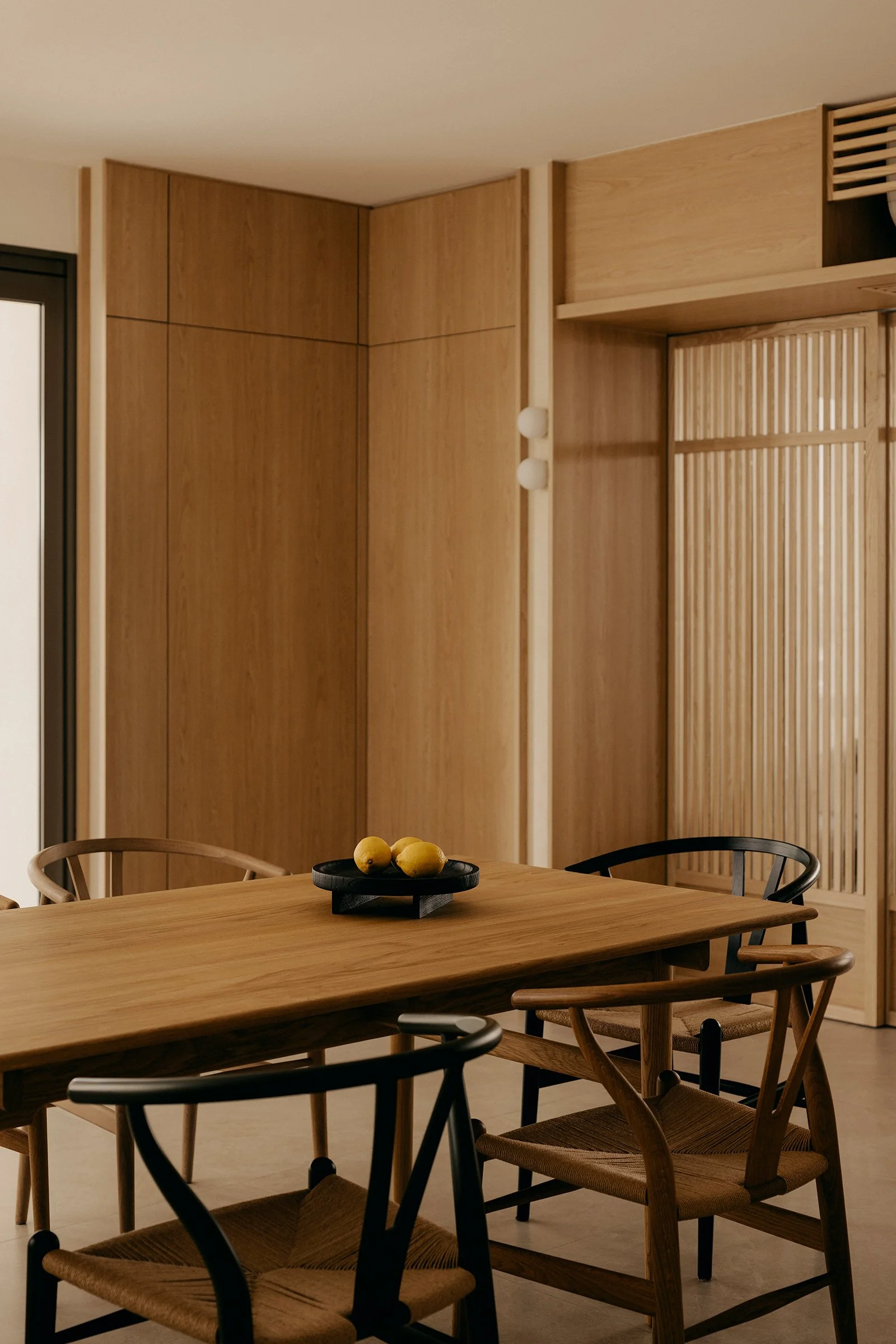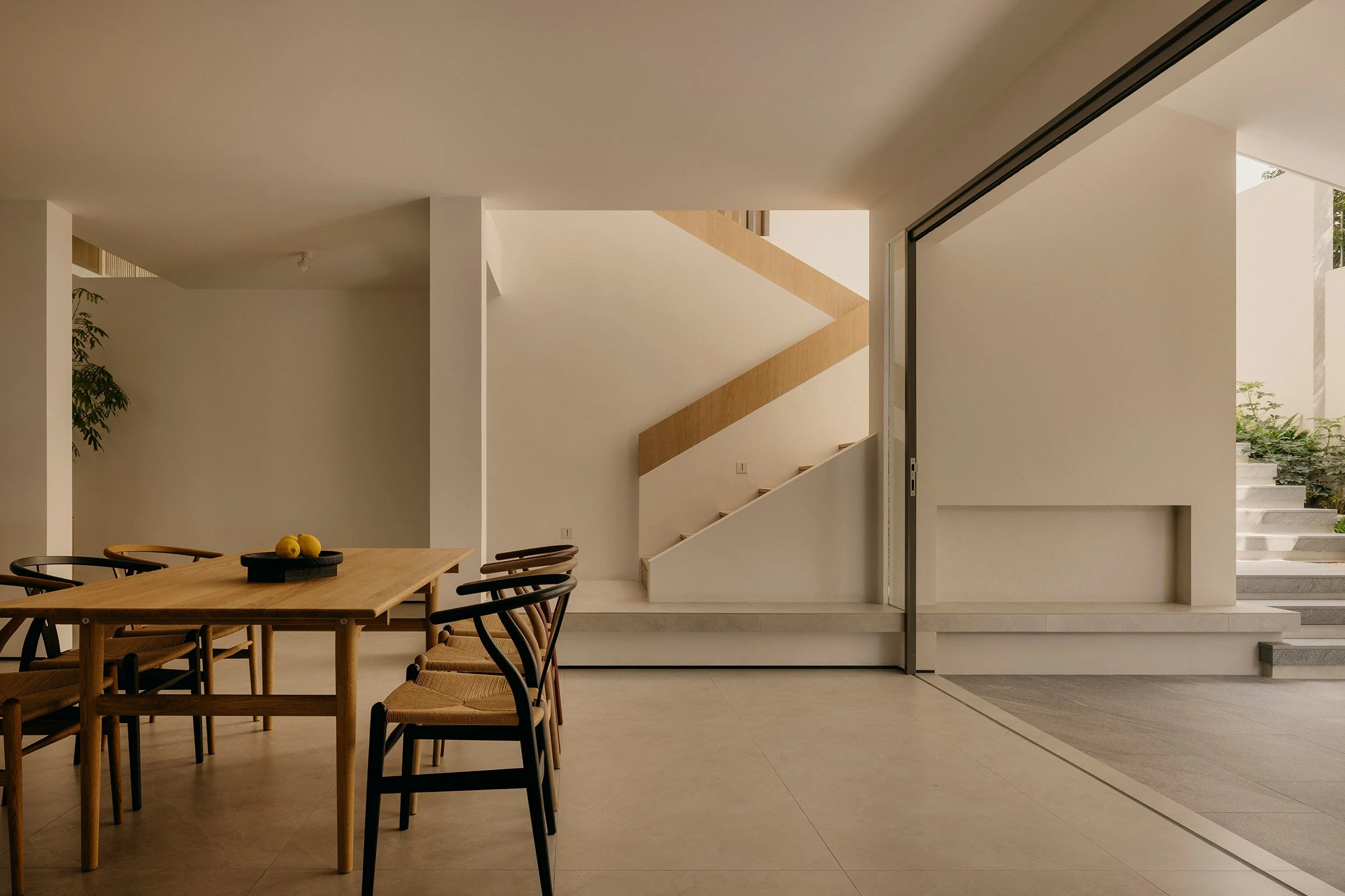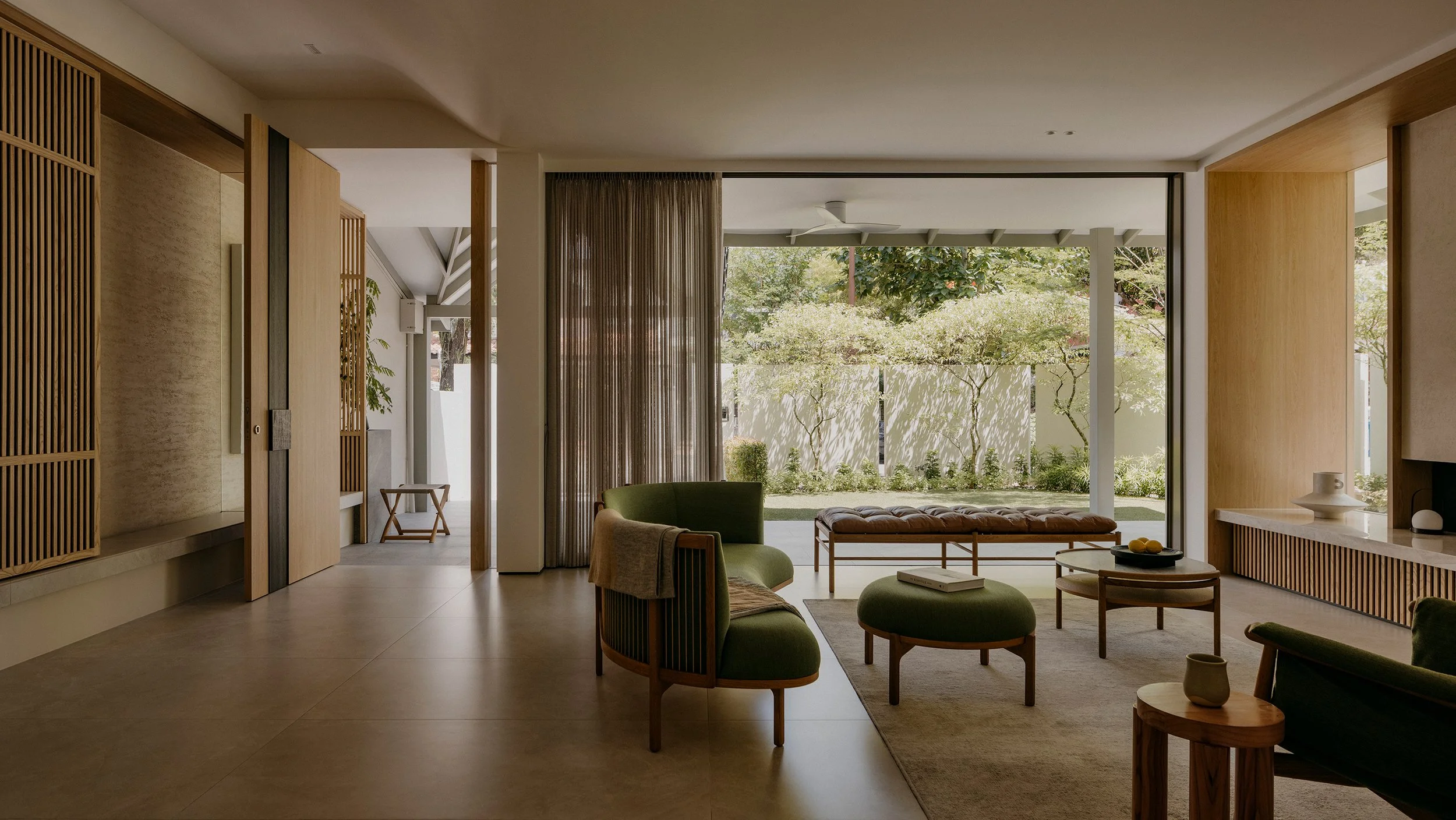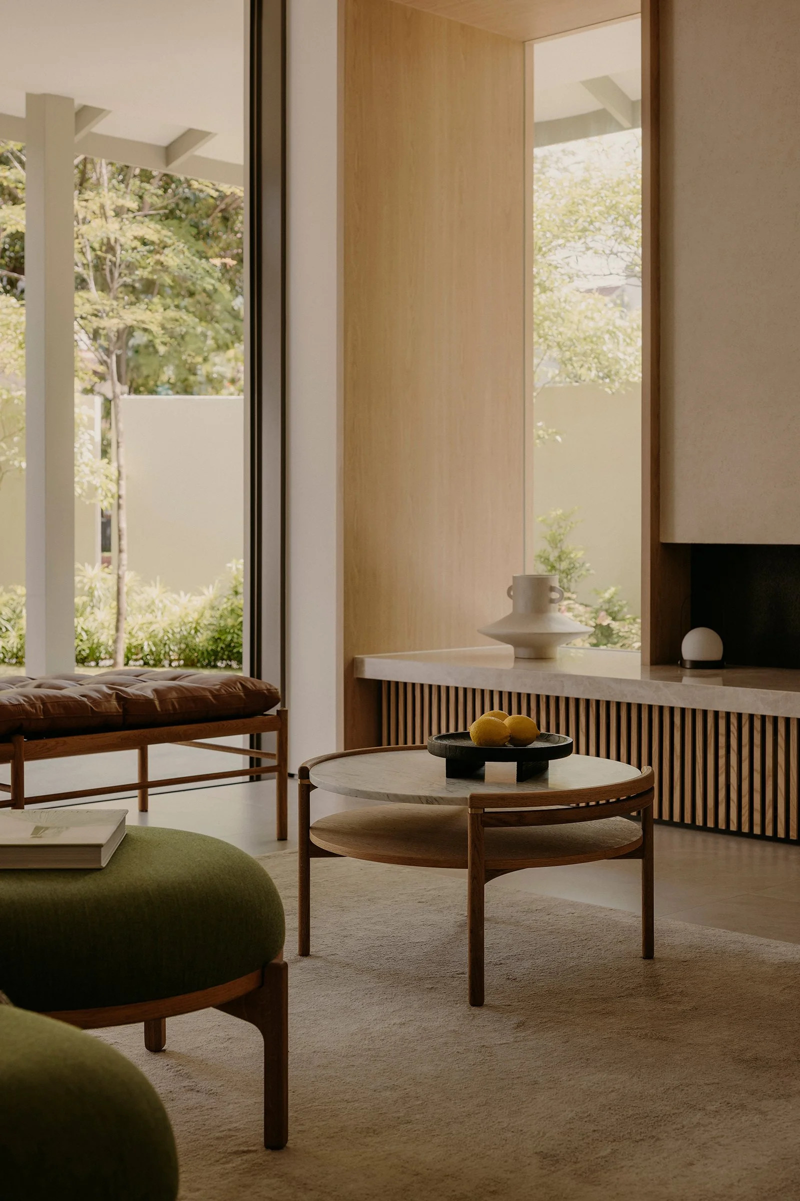Material choices keep the palette restrained and tactile. Oak brings warmth and softness, while grey slate adds weight and calm, grounding the spaces without heaviness. Olive green furnishings by Carl Hansen & Søn introduce a natural counterpoint, lending colour that feels rooted and composed. Across the home, architecture, light, and materiality work in concert to create an interior that feels anchored to its hillside setting, considered in its flow, rich in nuance, and quietly timeless.