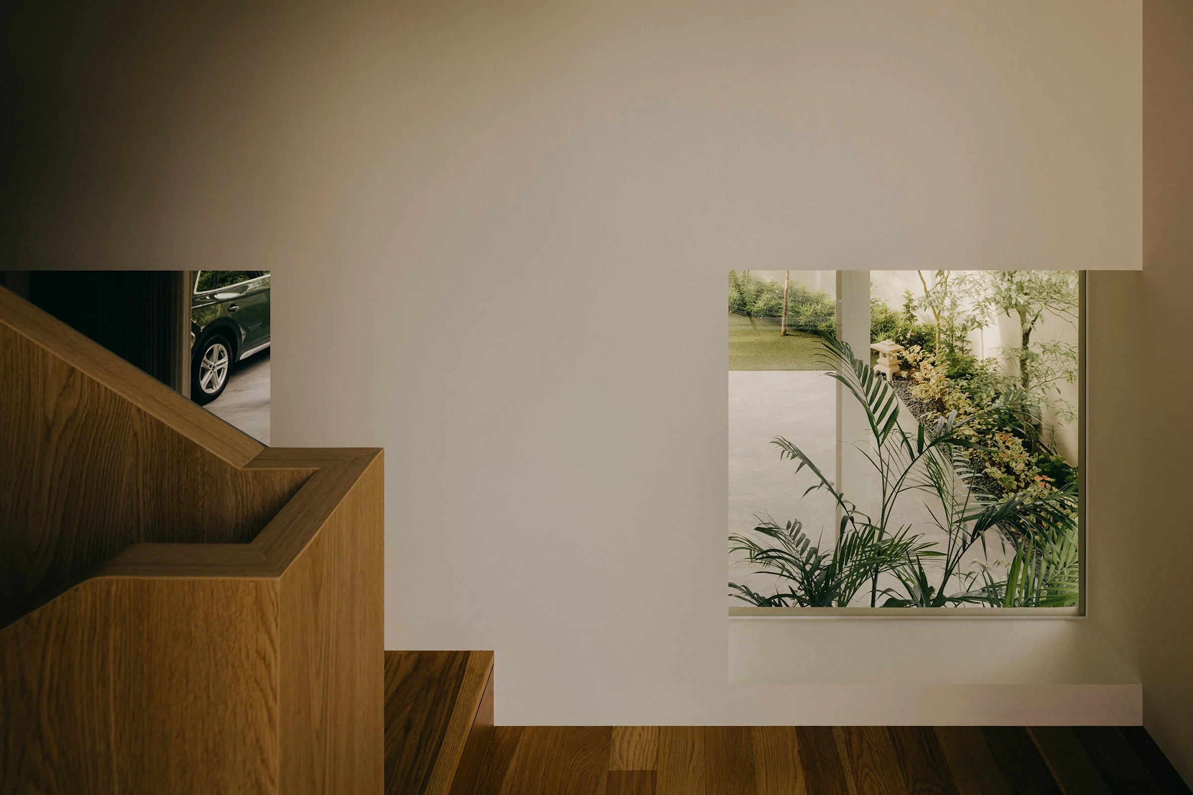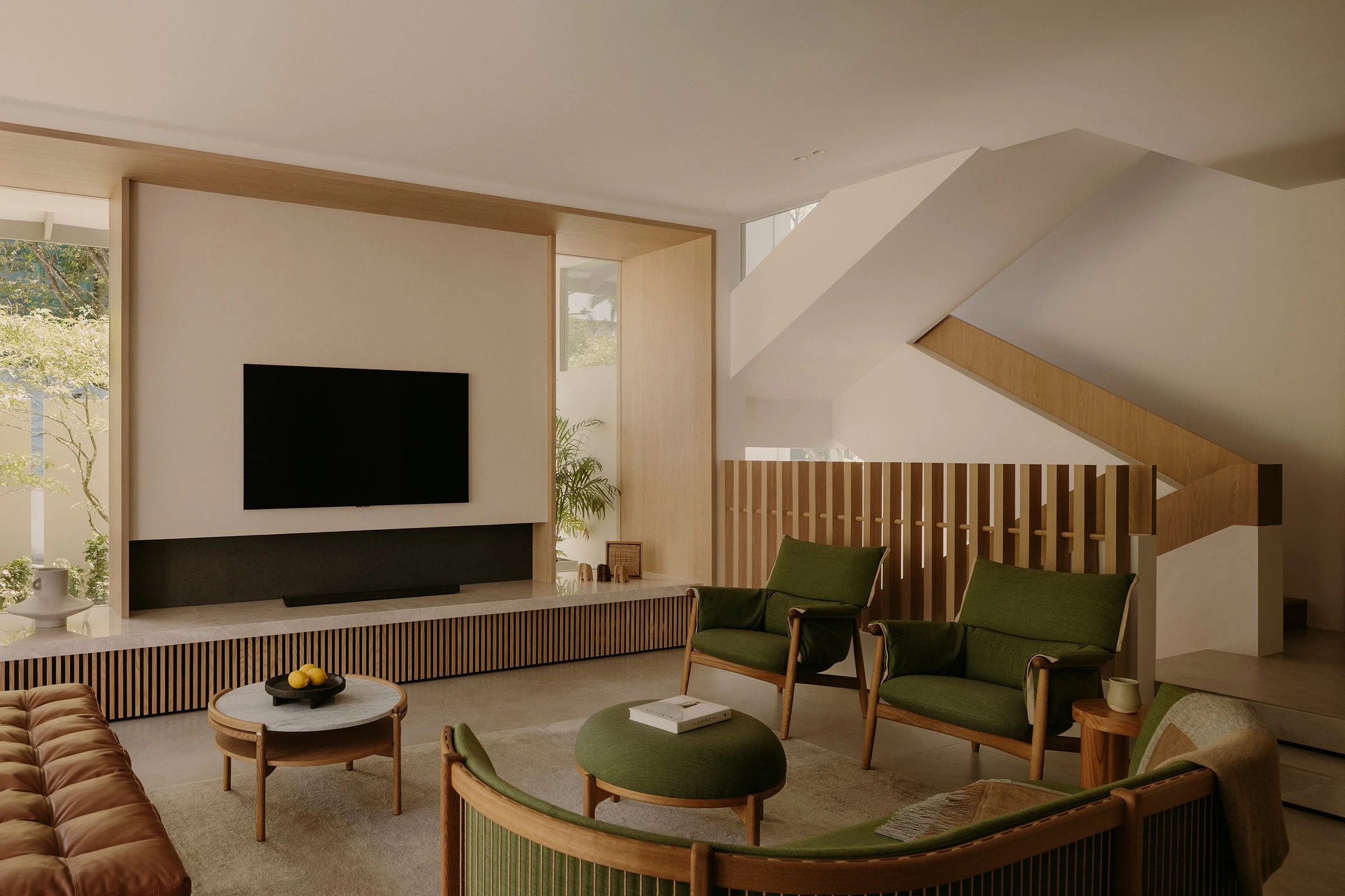 Anchoring these levels is a custom-built staircase that acts as the home’s central organising feature. More than circulation, it structures how the household moves, pauses, and reconnects, linking floors with a sculptural clarity that keeps the interior legible while encouraging discovery from one landing to the next.